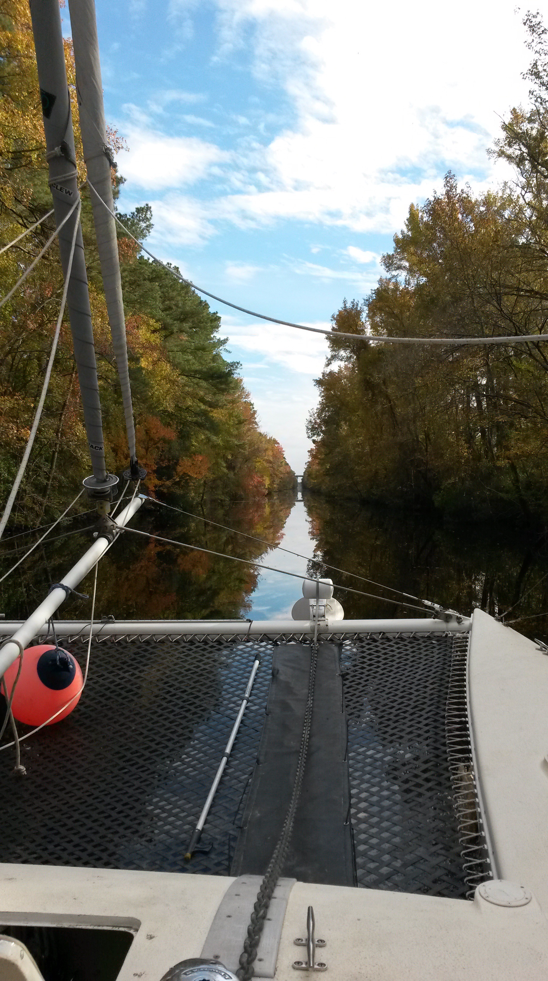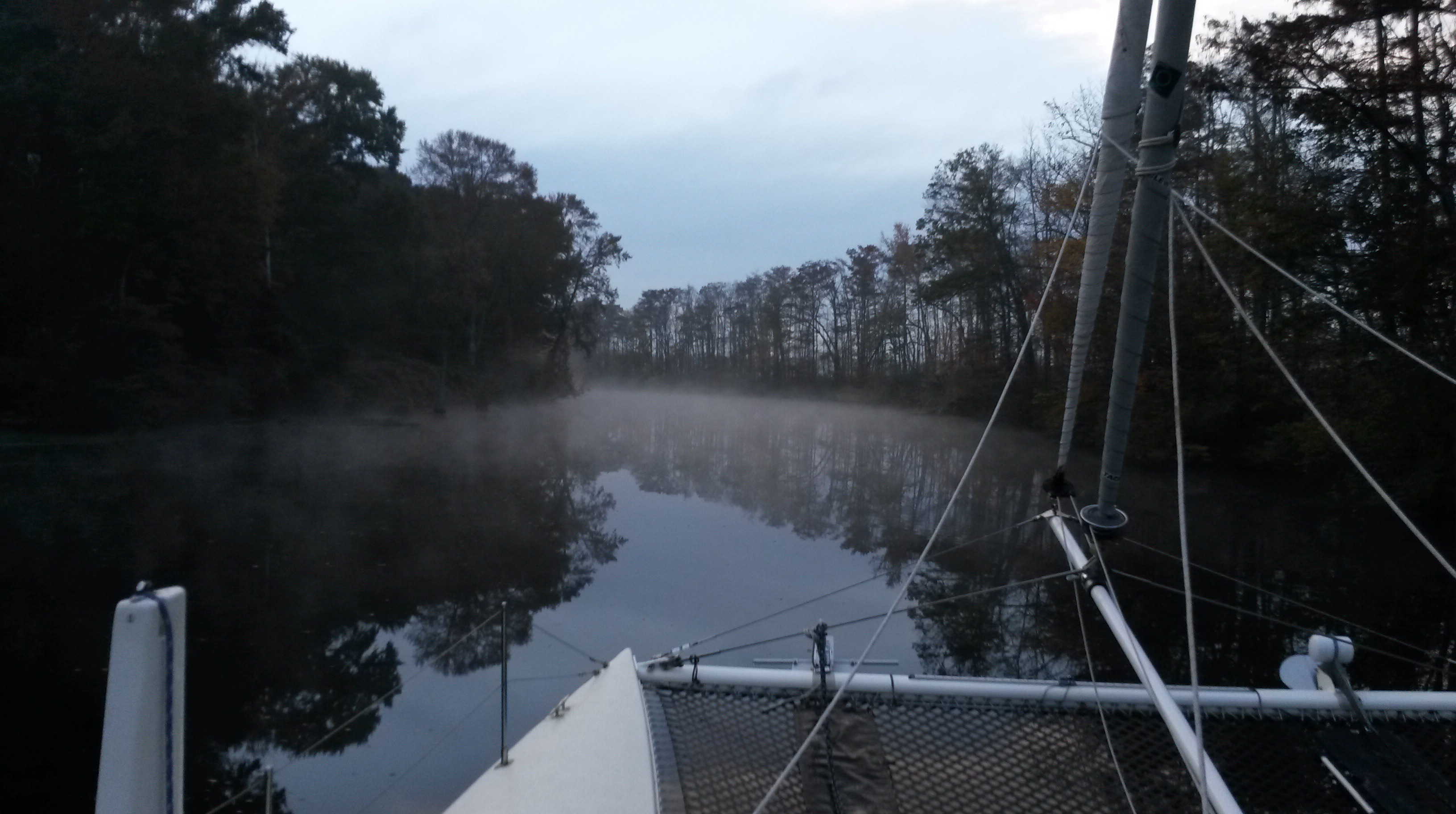 The weather, after our initial gale, has been wonderful. Until this evening’s rain, that is, and tomorrow it is supposed to get cold, and below freezing tomorrow night. But with the cold front comes a north wind, which we can use to our advantage. We’re thinking of going as far as Beaufort, NC, tomorrow; spending the night; then heading out into the ocean for an overnight (again in strong winds and cold) to Charleston, SC. In one overnight of intense sailing we can go as far as in 3 or 4 days of motoring down “the ditch.” We’ll re-check the weather and again consider the plan tomorrow night.