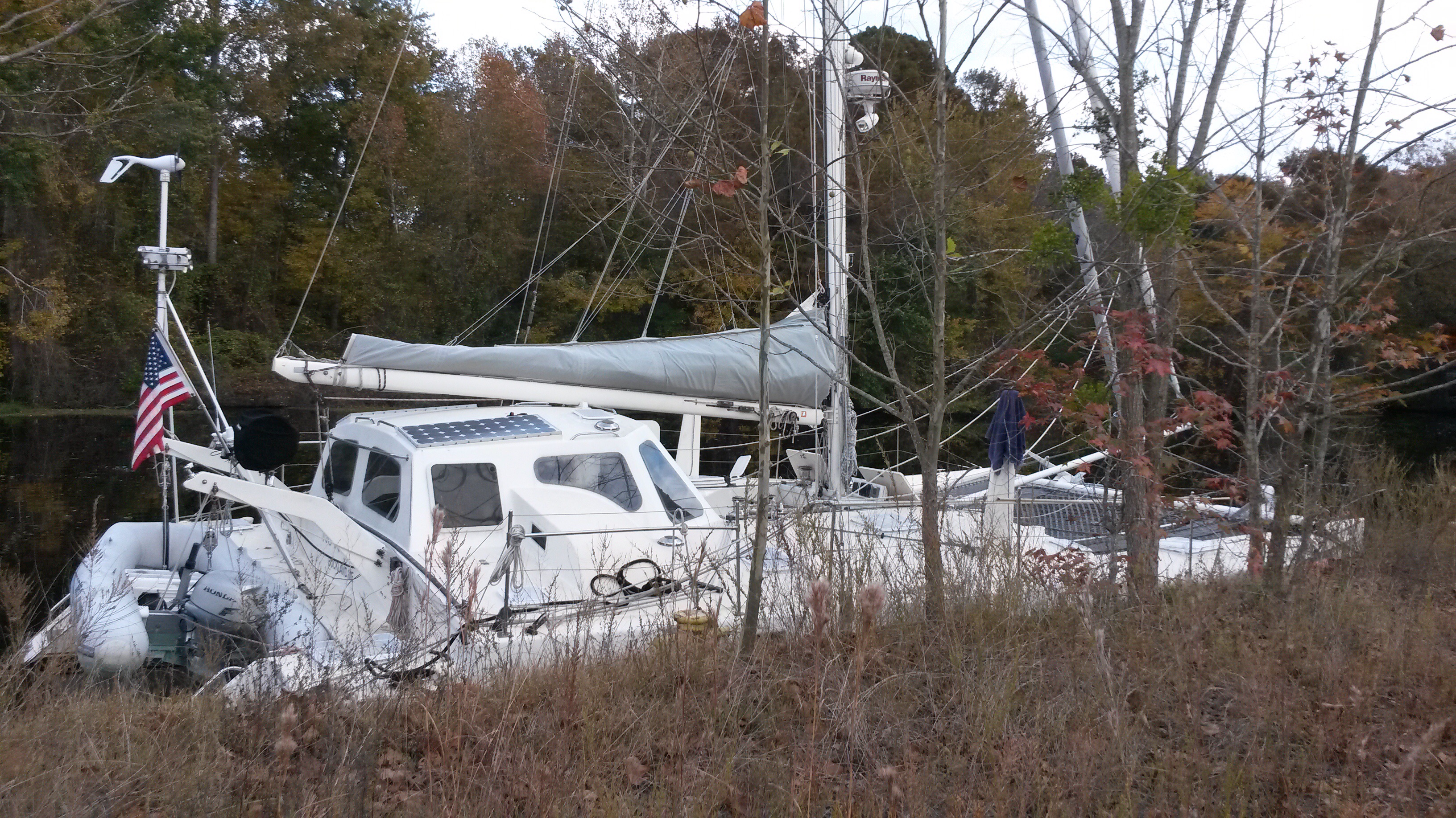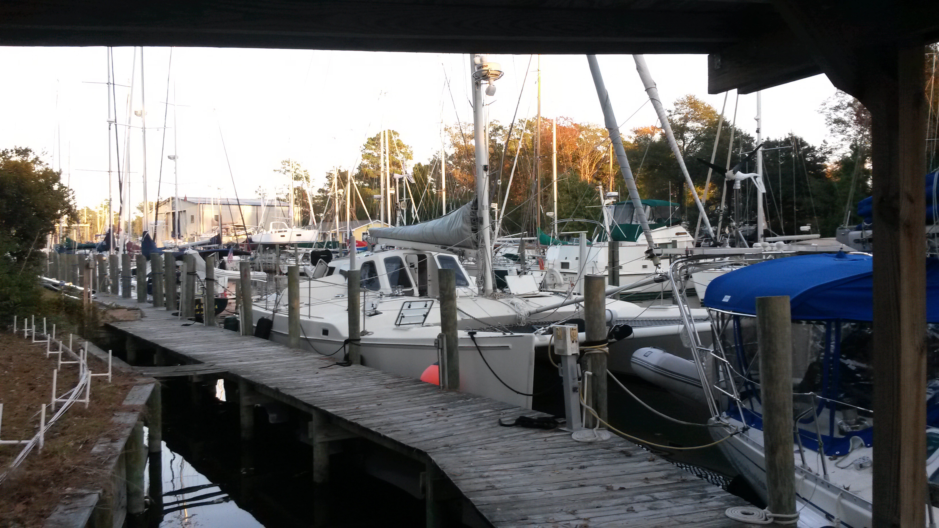 We spent the entire day today at a boatyard in Oriental, NC, because we have once again had problems with dirty fuel causing one engine to stall. The yard has been cycling our fuel through a filtering system all day long. We changed the oil in both engines today, which is a messy job (as is most any job in the cramped “engine rooms”). We started working on problems we have with the plumbing of our heads/toilets, but we have lots more work to do there. We got a fuel gauge working that had stopped. We failed to fix our wind speed indicator, which works occasionally, but mostly not. We did most of the rigging of a bracket to hold our outboard motor securely, rather than leaving it on the dinghy when we’re out at sea. It’s been a productive day.