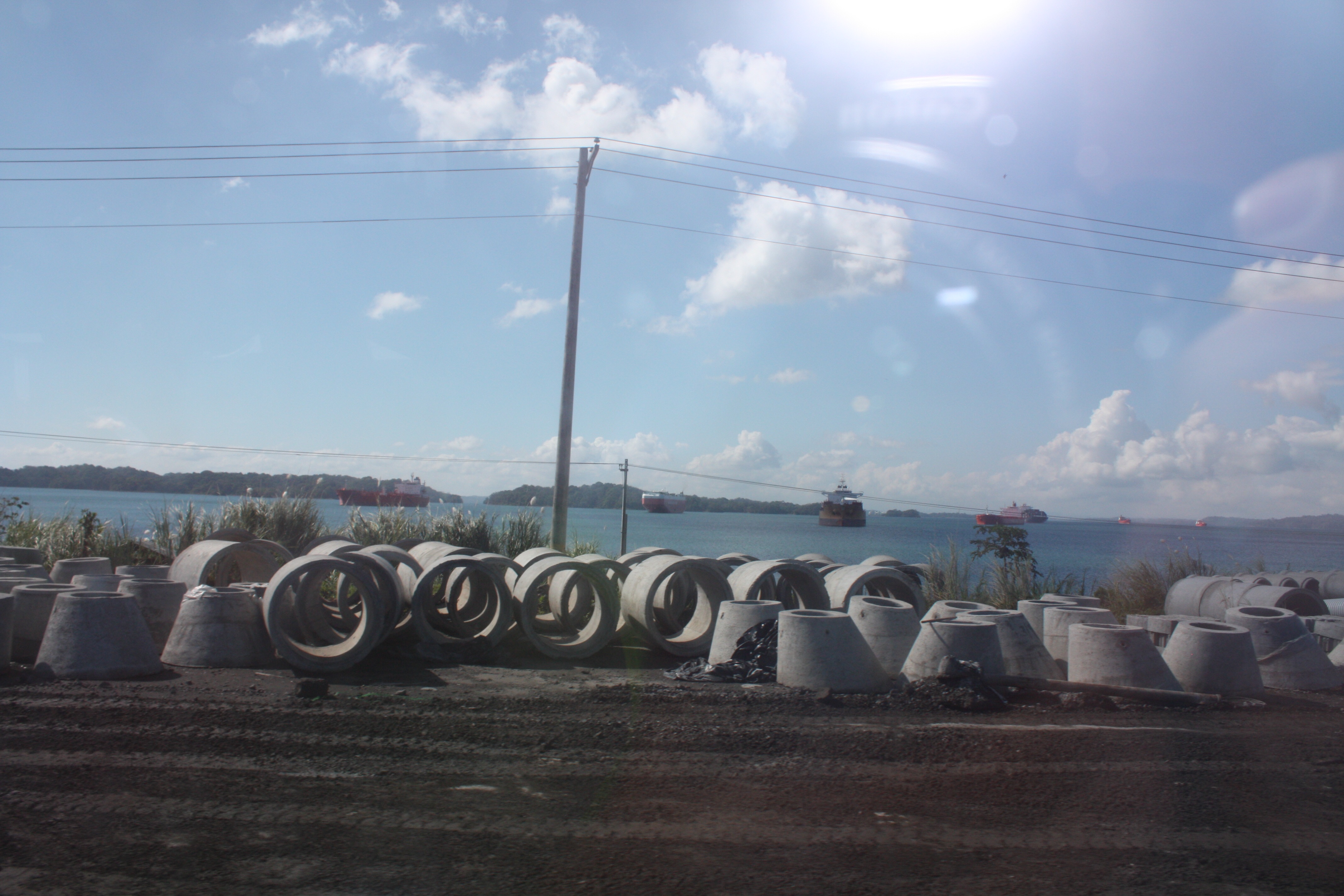 We drive in the bus down to the lake-end of the new locks. We’re on a narrow strip of land with Gatun Lake on one side…