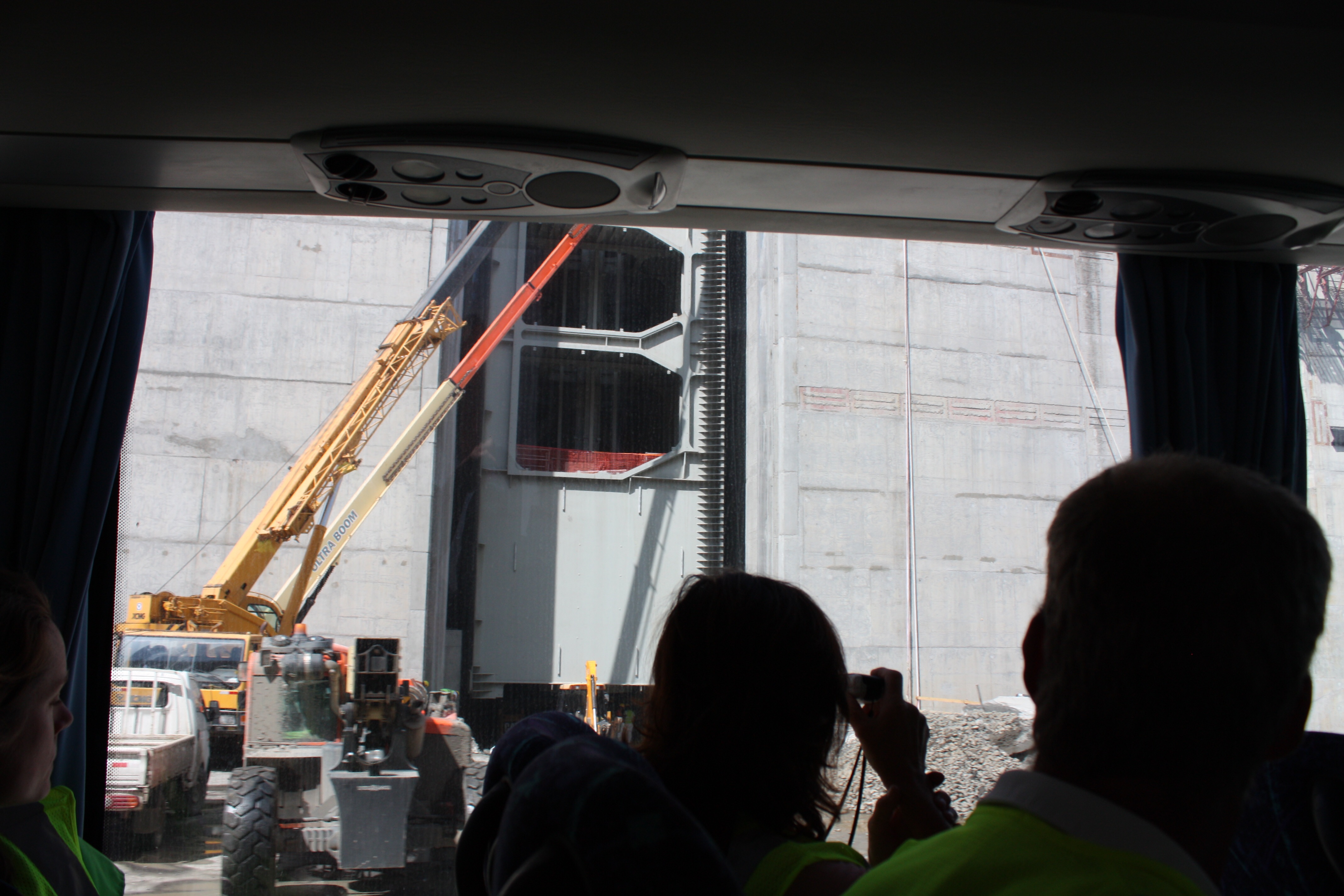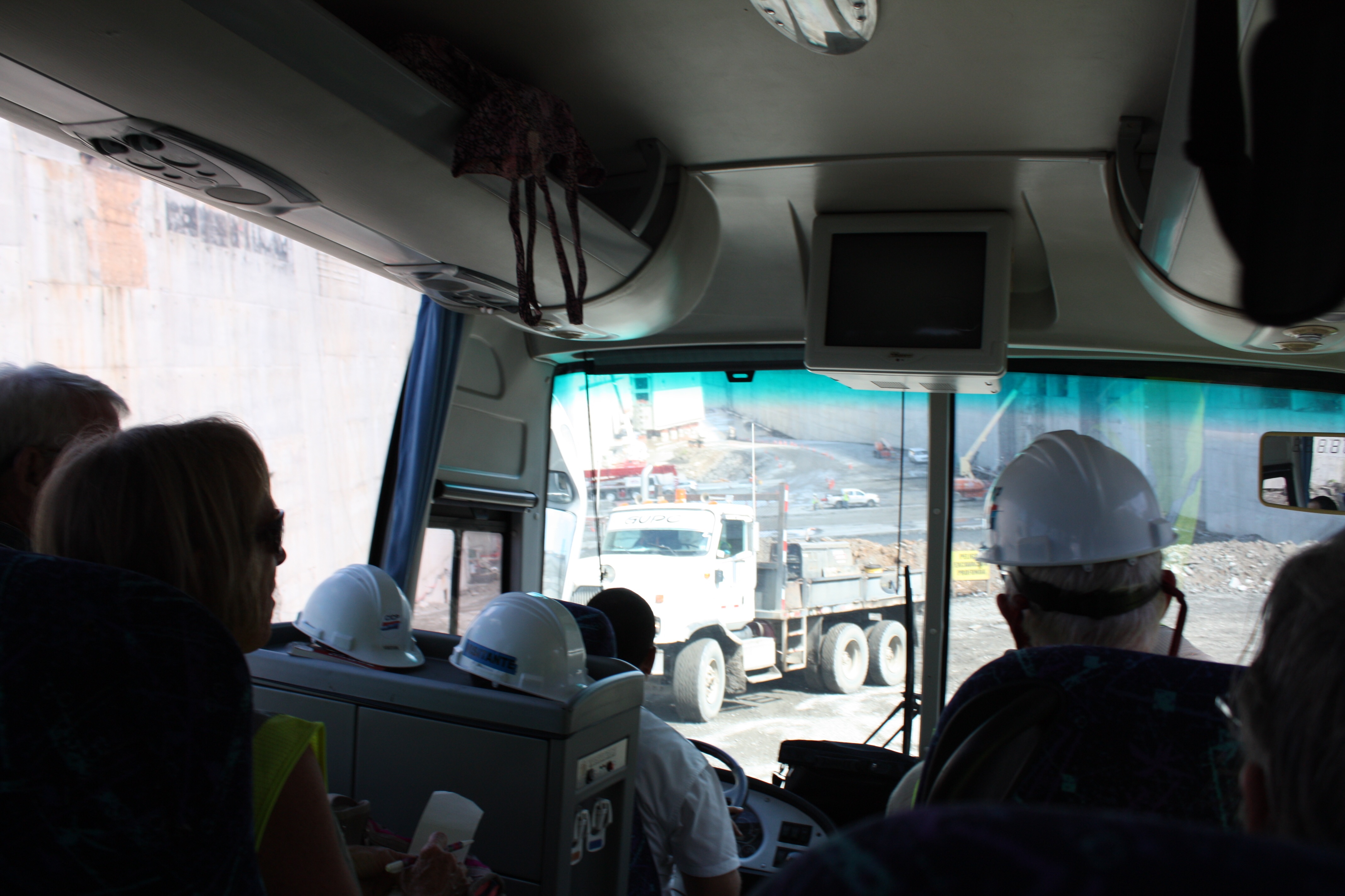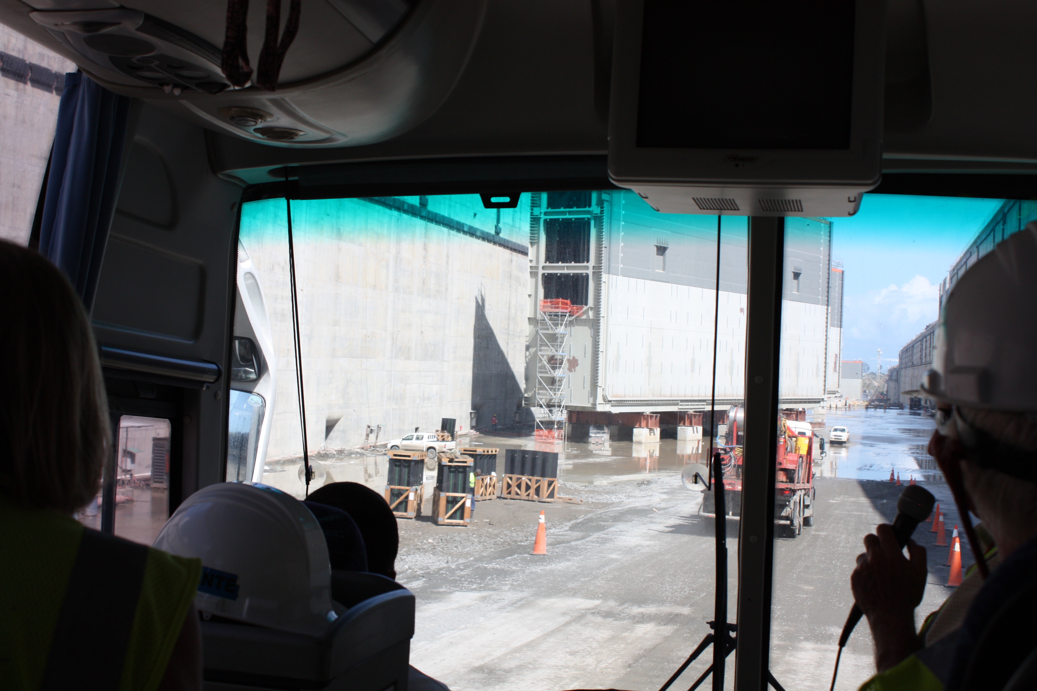 Back on the bus, Dave tells us that “if they don’t stop us” we’re going to now drive down into the locks! We will be one of the first to “transit” the new canal. They don’t stop us.