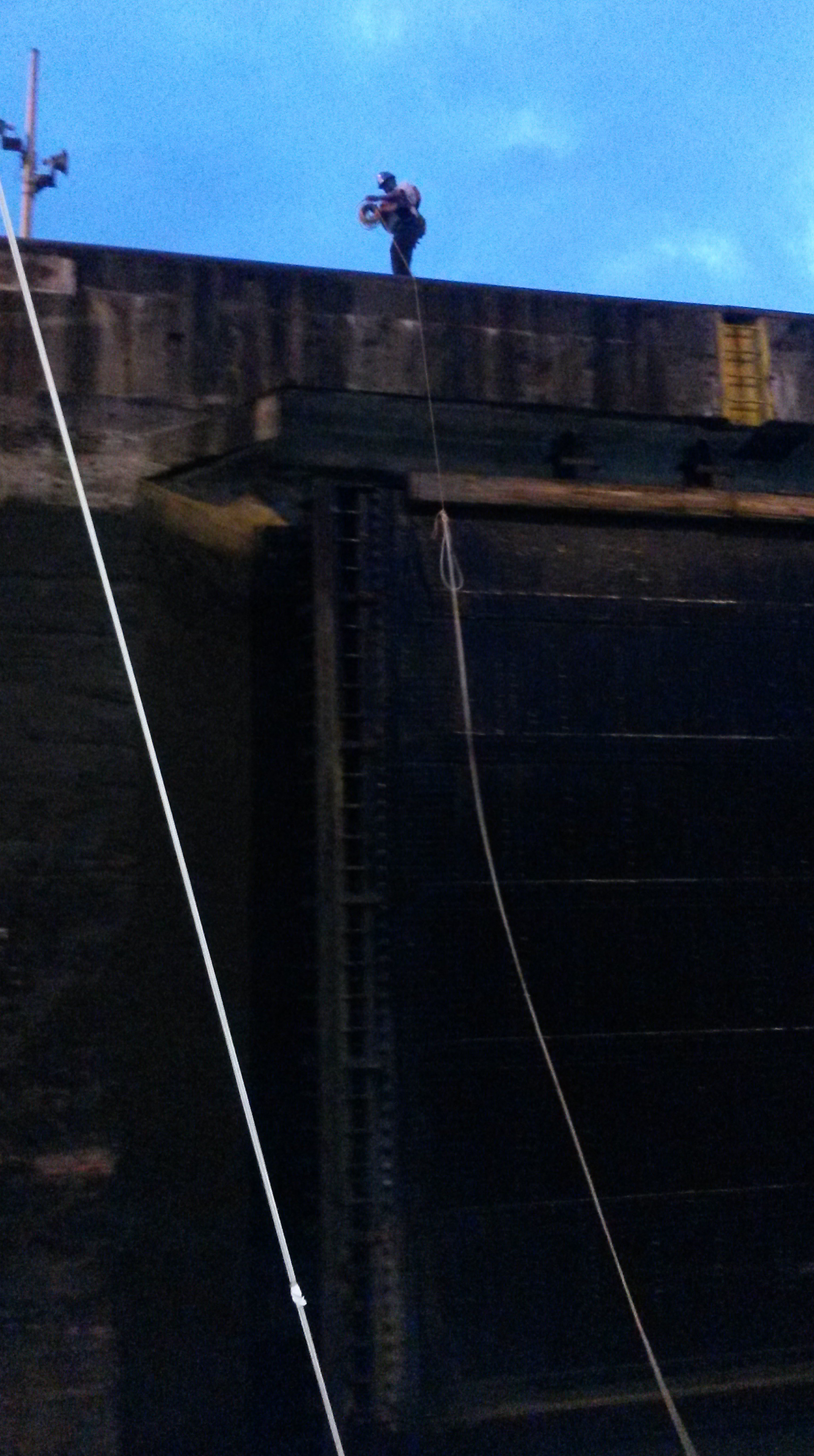 Below is another one I like, even though it isn’t in crisp focus. When entering the Canal, and going “up” (the Gatun Locks in our case), you pull into an empty lock and you need to get lines to the handlers ashore atop the imposing walls. This is done by their throwing a light line with a “monkey’s fist” (weight) to your boat. They are incredibly accurate, invariably hitting the boat (rather hard!) without hitting anyone on the head. Then you secure your heavy line to their light line, and they pull the heavy line up, as you can see (maybe) in the photo.
