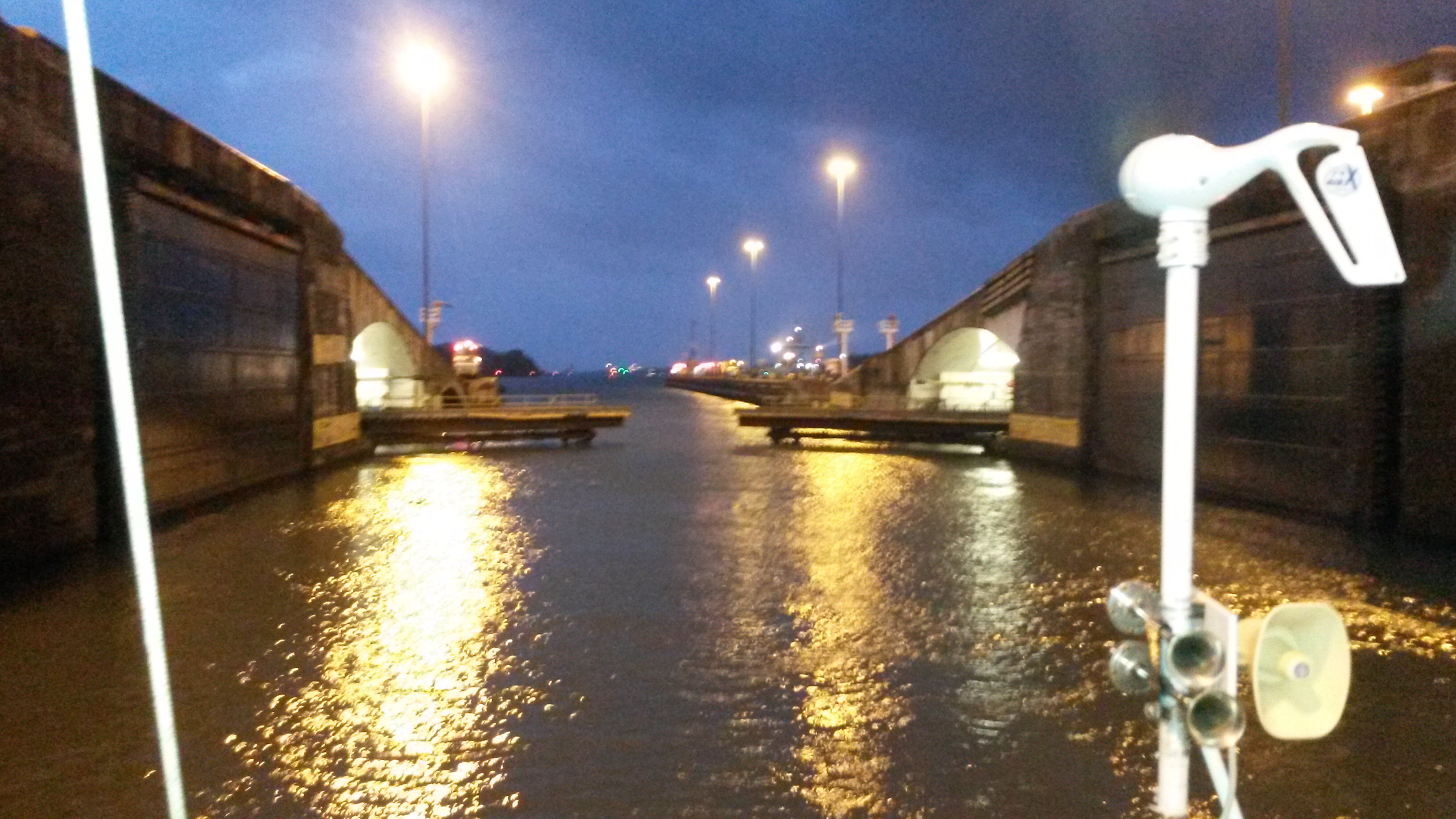 One more that isn’t very clear in the dark, but I can’t resist. It is the swinging bridge closing behind us, after we entered the Gatun Locks. Remember the swinging bridge? We drove across it to get to Colon, and we saw the lock doors closing on a Panamax ship as we went.
