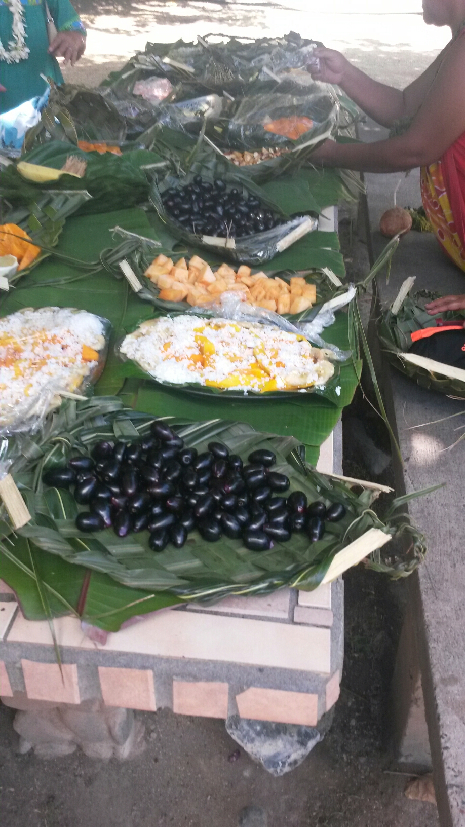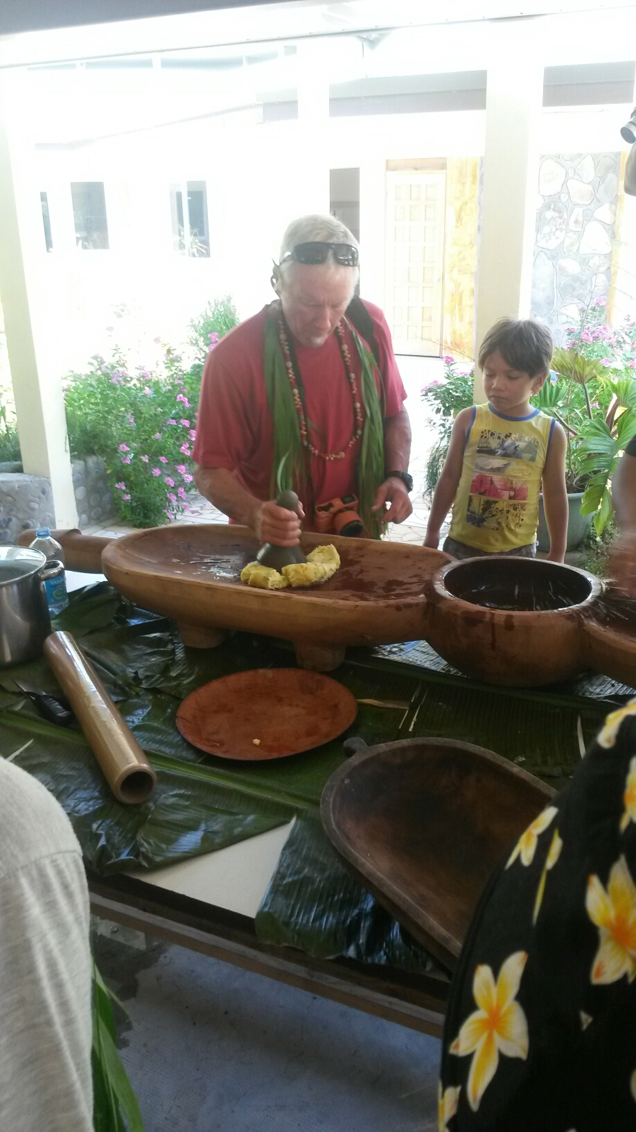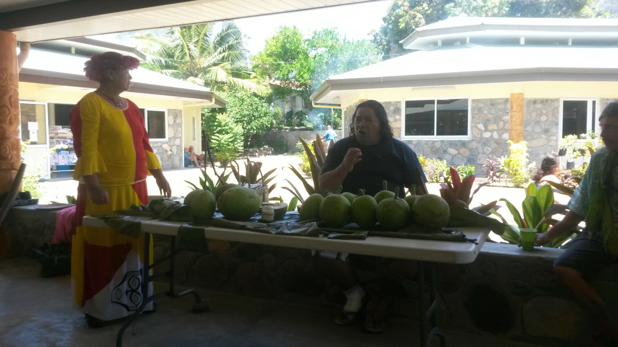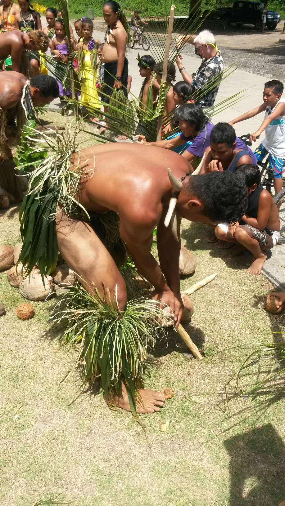 There were demonstrations of how to open coconuts without metal tools. And how to take out the coconut meat. There was wood carving and basket weaving going on. There was a huge spread of fruit, etc, for our welcome breakfast. We were running later than planned, so breakfast was followed immediately by another huge spread for lunch! There were lots of jokes about fattening us up…to be eaten.