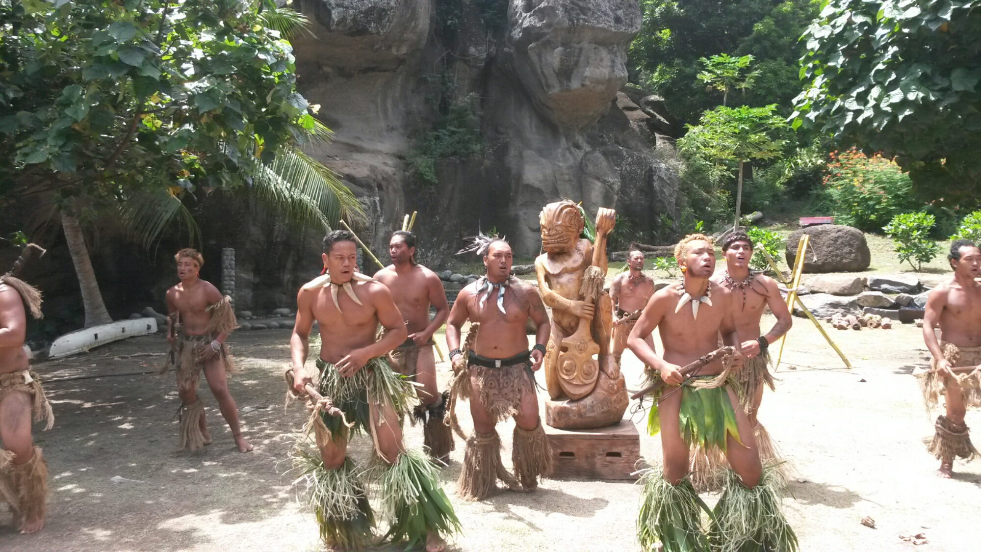 Dinner had been cooking in a pit since dawn. It was now after dark. But before dinner it was time for a fire dance demonstration. The nearly-naked men again, and in the dark with torches burning, I could just about imagine being an enemy of theirs, and being terrified. They were big and powerful and tattooed and ferocious. The chief screamed unknown words at us. Drums carried messages direct to the soul. The warrior cries echoed off the fire-lit backdrop of rock cliffs. Torches in hand, they danced, they bellowed, they did choreographed hand-to-hand combat. They were clearly “into it;” I noticed that one of them got a glowing cinder on his back, and it stayed there unnoticed or unheeded by him. I soaked it up; especially the drums and the all-out raw male energy of it all.