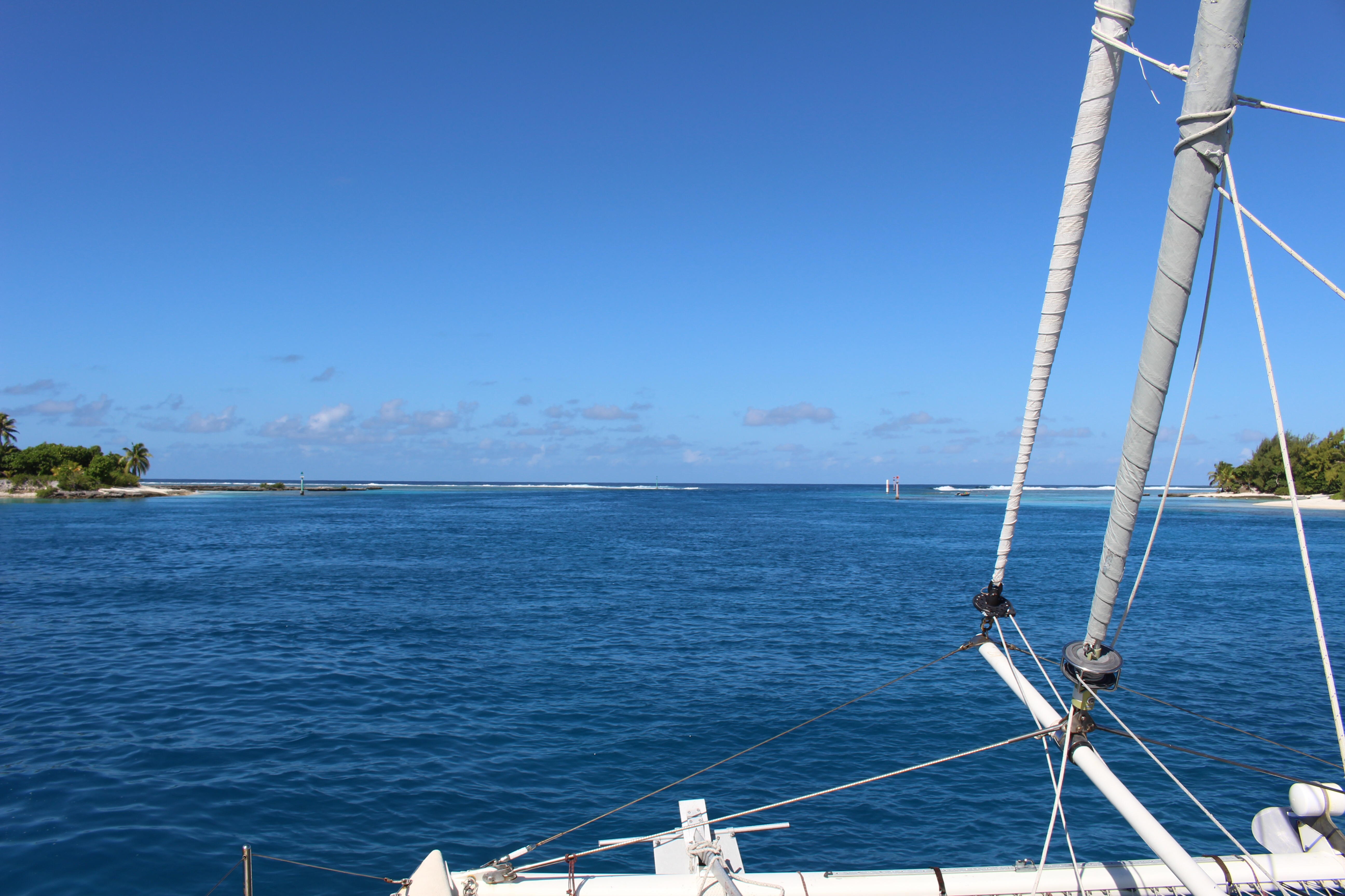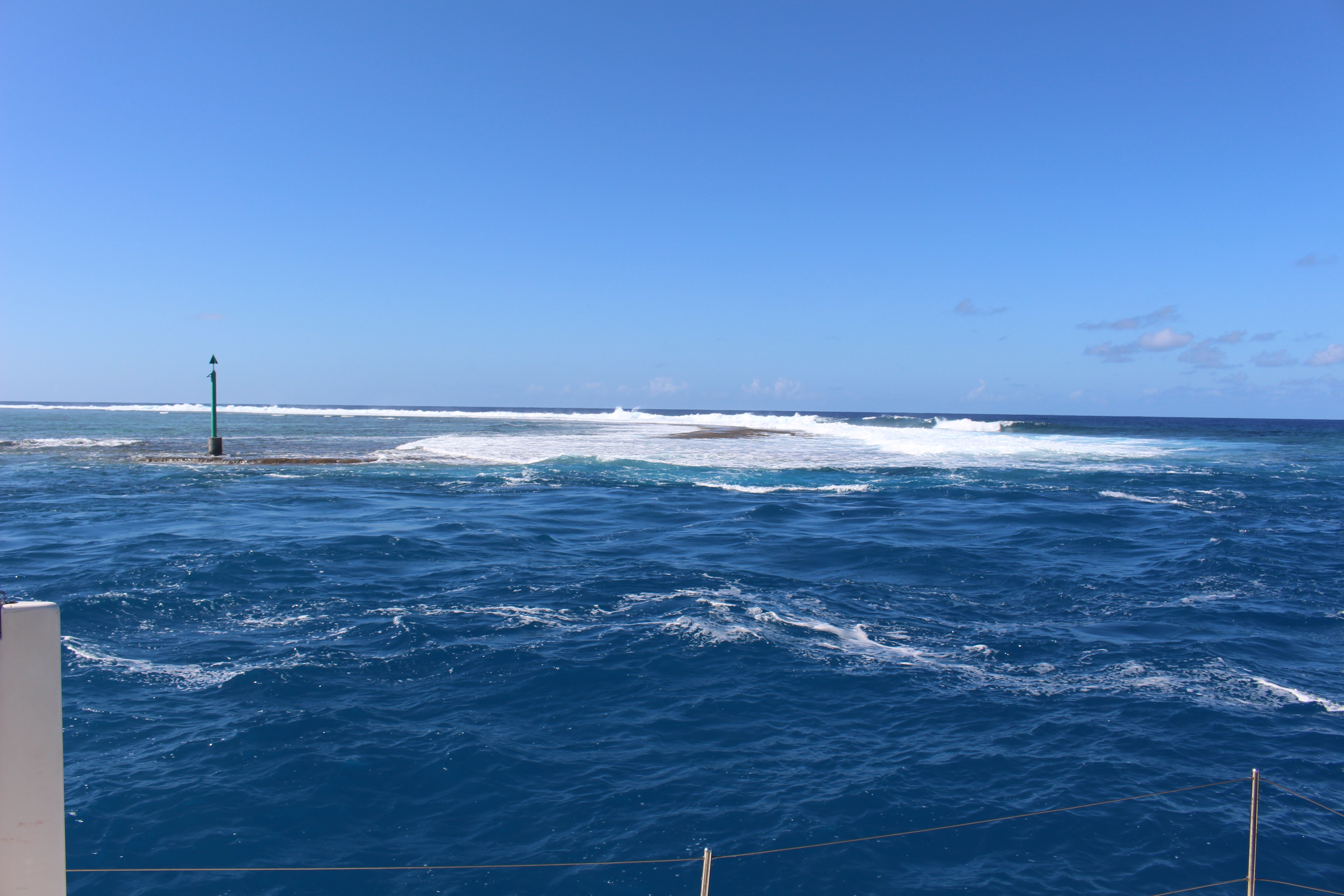 Maupiti has a challenging entrance through the reef. The reef is relatively low on the south side, so waves from the south break over the reef into the lagoon. Most of that water flows back out through the pass. Reportedly there can be a current up to 9 knots flowing out. Nine knots is faster than we can go with both motors running. In addition, the south-flowing current hits the waves coming in from the south, potentially creating dangerously steep/breaking waves. When these conditions occur we are told that even the ferry does not go to Maupiti. And if you are at the island when the conditions develop, we’re told you have to wait it out, perhaps for three days, before you can safely leave.