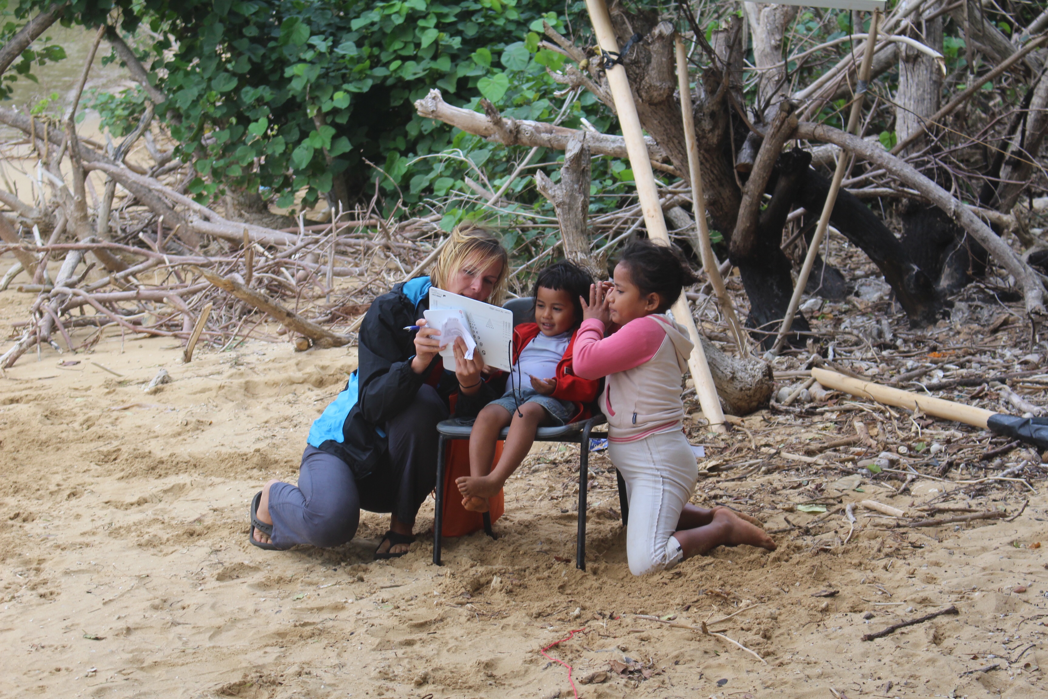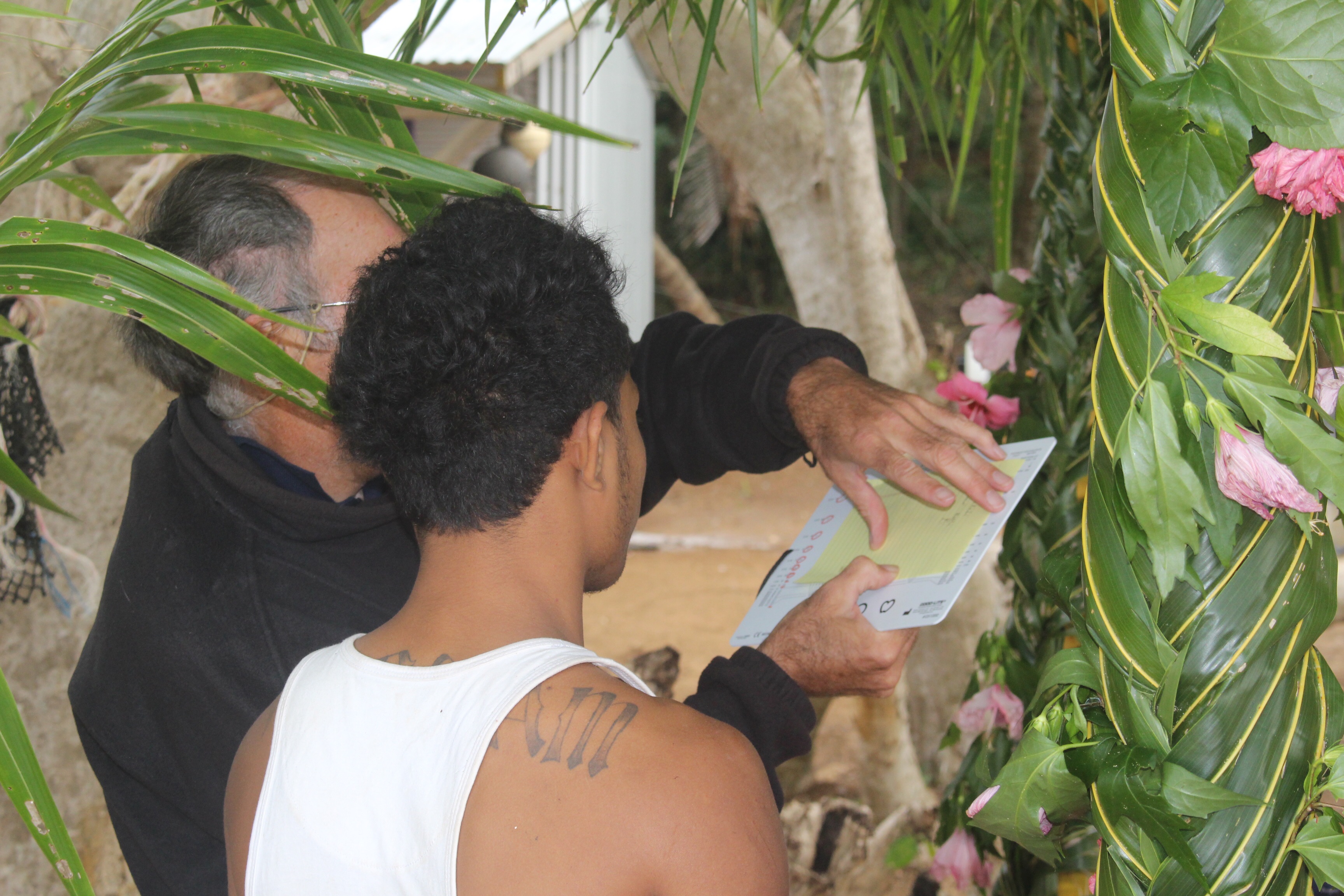 Shortly thereafter we were anchored near the other BPO boats. Most crews were already heading ashore to do eye testing of the eleven kids in the family. I don’t think I’ve mentioned that this is a service that several of the BPOers, including Bob on our boat, are doing in conjunction with a non-profit in Germany. The BPOers were trained in Papeete to test the kids’ eyesight. They report the results back to the non-profit, which makes glasses for the kids who need them. And then the really cool part — they connect with boats bound for the same islands, and have the glasses delivered. That may happen a year later, but it is eye care that the kids likely would not have at all otherwise. What a great idea!