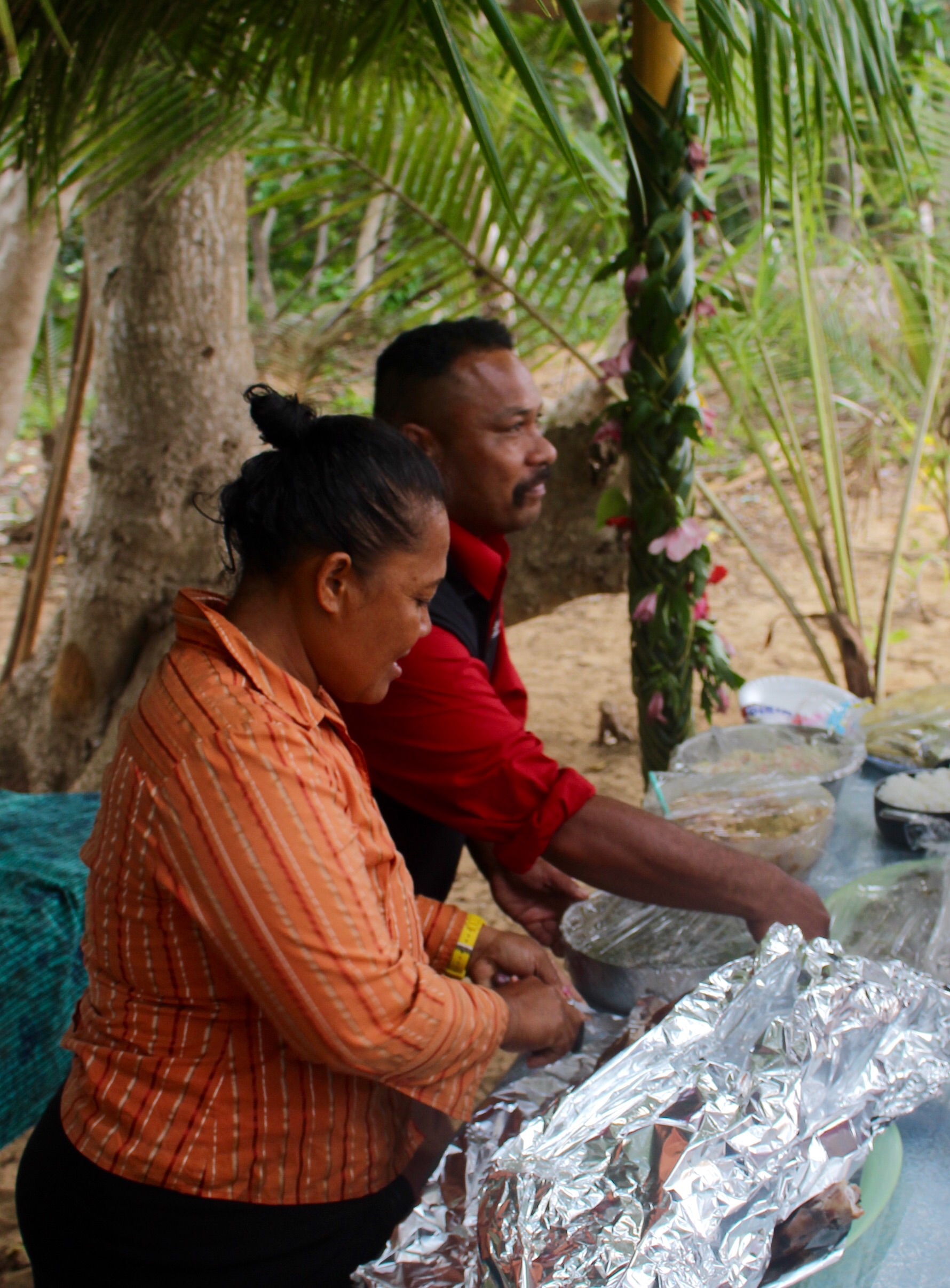 It was time for us to go, so I returned to the laundry shop and gave her the names of all the BPO boats, so if the sheet was returned she could pass it to one of them. Off we went, checking the names of all the boats we passed. We saw a likely boat in an anchorage we had in mind, so we stopped there, but no luck. Next I got in the dinghy and zoomed around toward other likely boats under sail, and to another popular anchorage. Again I saw a boat that matched the description, but it wasn’t the one. One good thing, though — I saw other BPO boats there, and they told me about a family on the nearby island that had invited us all to a Tongan feast the next day (for a fee, of course).