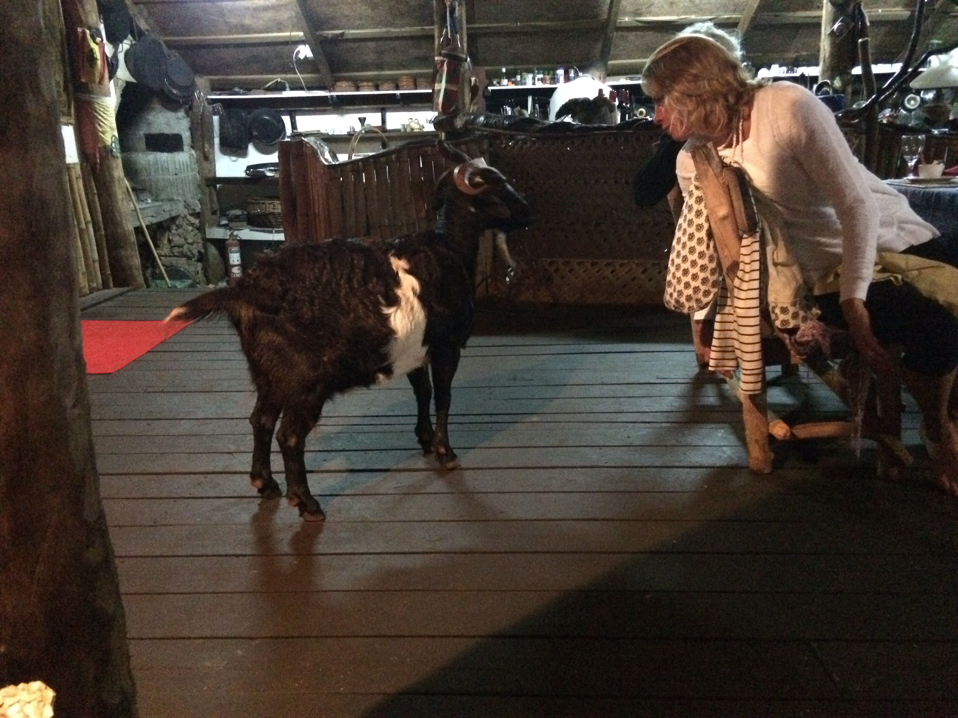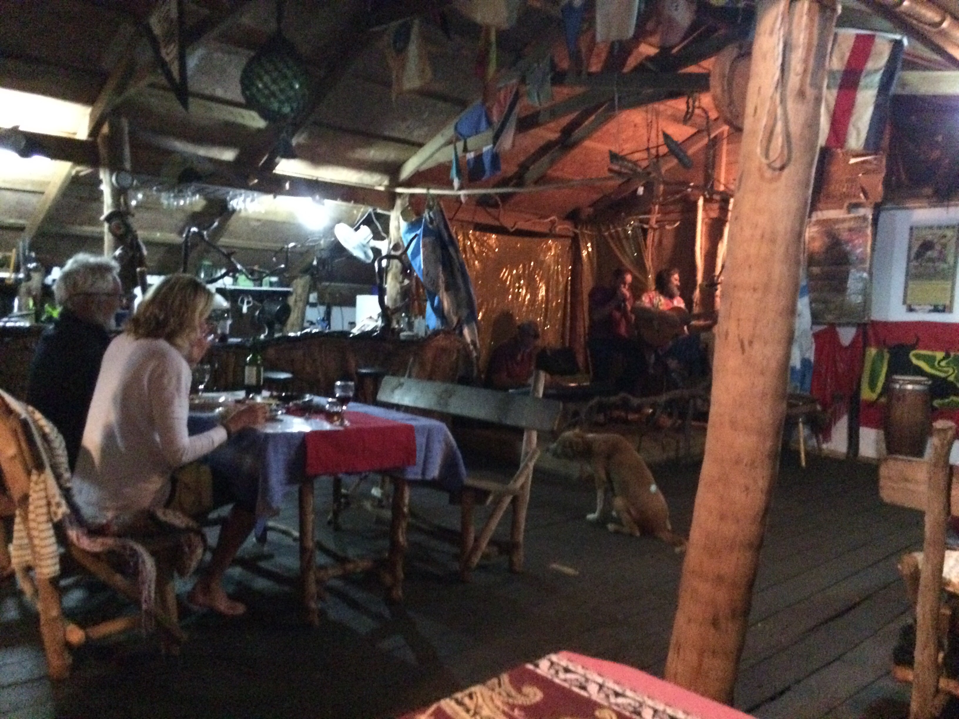 Did I mention that this restaurant is on a small island, accessible only by boat? The folks at the next table were from New Bedford. We will be visiting their boat tomorrow morning. Oh, did I mention the dog sticking his nose past the shower curtain during the musician’s tune up, and wagging his tail to the music? Or the beautiful black billy goat walking in during the music and rearing up on his hind legs threatening to butt a guest that went to pet him? All part of the movie. It’s going to be strange to watch Star Wars again some day, and think of La Paella, Anchorage #11, Vava’u, Tonga!
