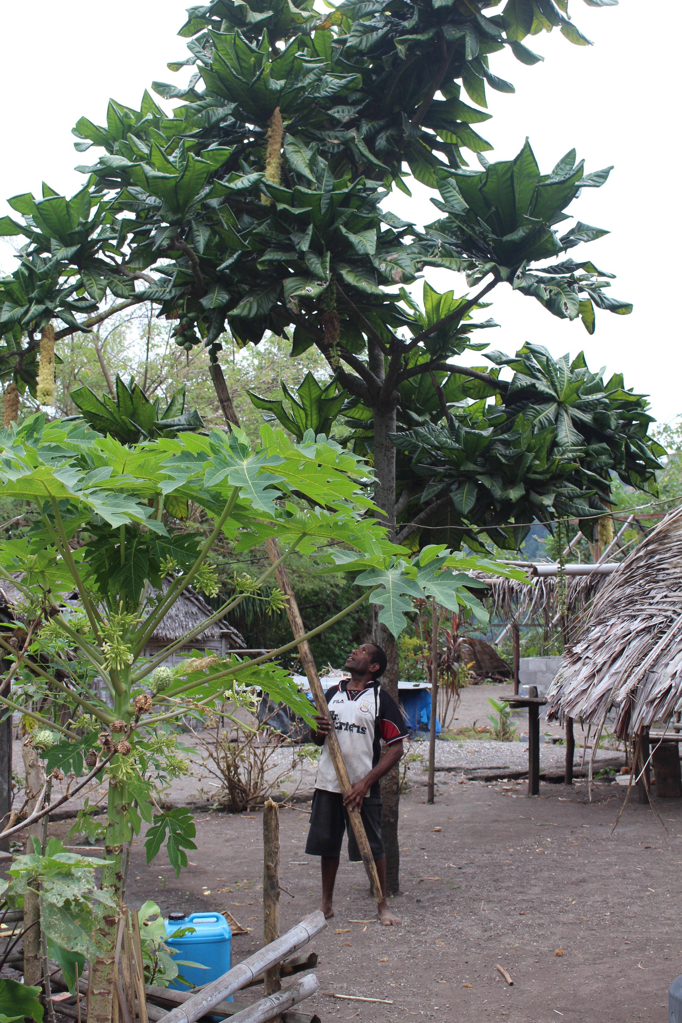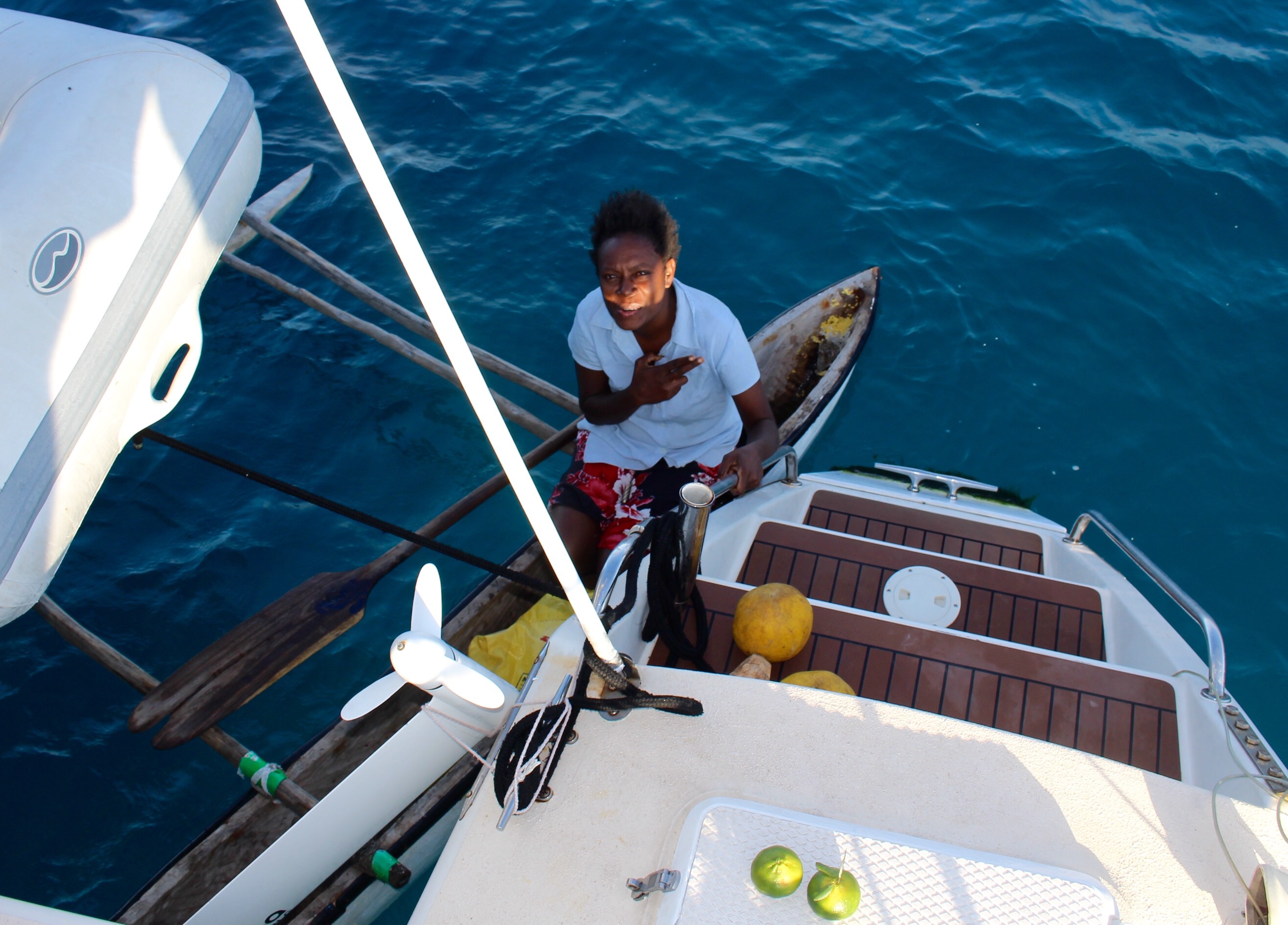 We asked about Cyclone Pam, and learned that the damage was to their crops. Nevertheless, Kathy insisted on giving us a large papaya, and she laughed, “No!” When I offered to pay her for it. But we asked Chief Joseph if we could give a gift of a soccer ball for the kids to use. He and two other men wanted to see the boat, so the five of us paddled out in our dinghy to get the ball, and to show them our home. No reluctance on their part to come inside — they wanted to see everything!
