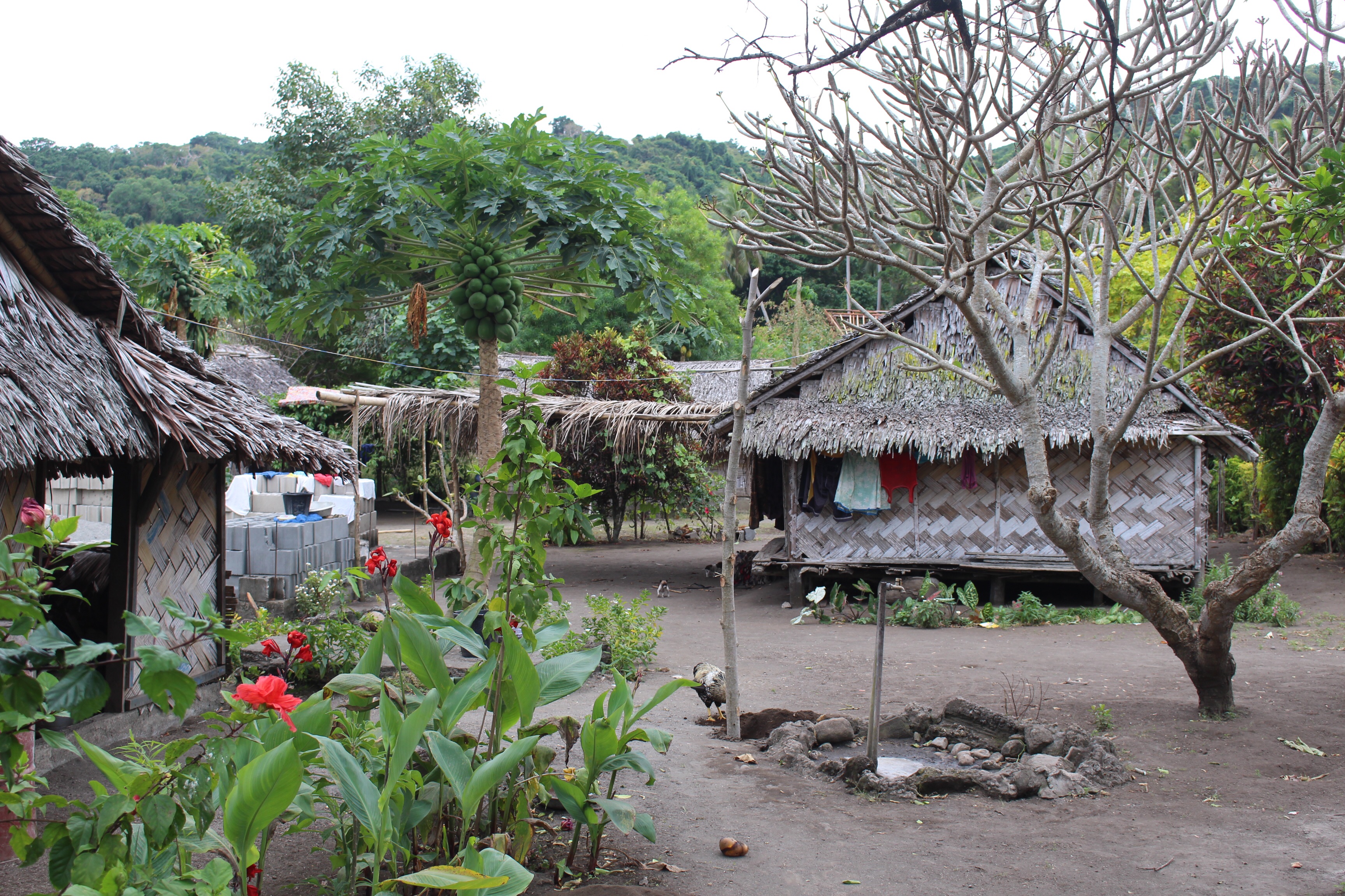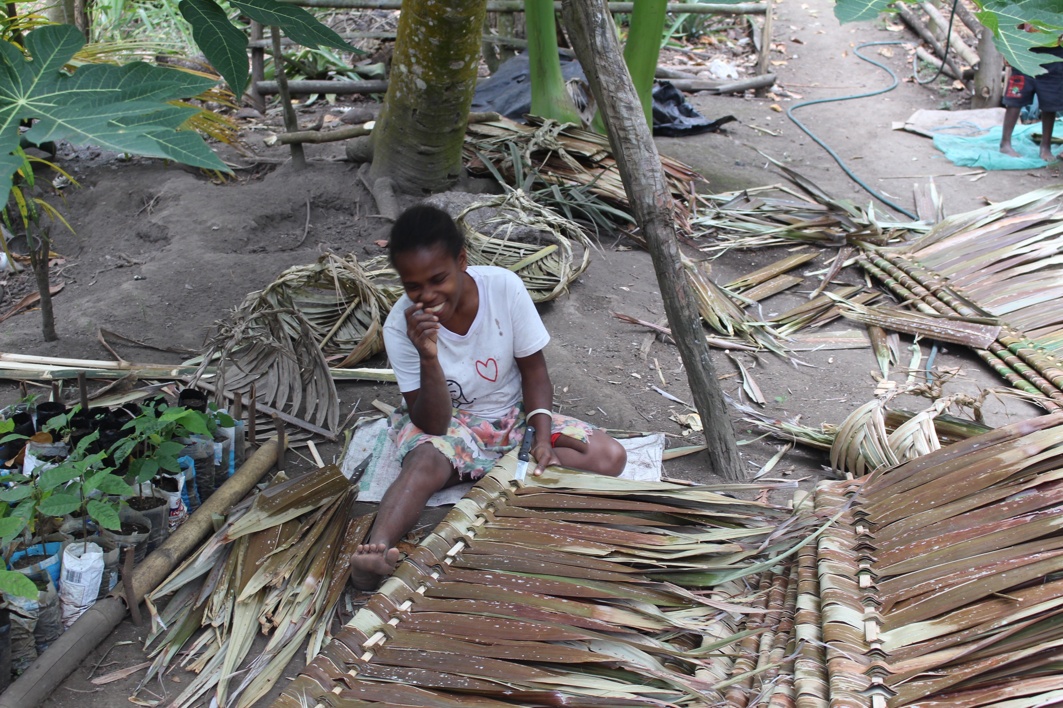 We stopped at another bay that is not mentioned in our cruising guides, by the village of Tisvel. Bob and I went ashore, and were warmly welcomed. A woman named Kathy offered to show us the village, and Joseph (who turned out to be the village chief) and David came with us. Tisvel has 132 inhabitants, including the children…only one church (Presbyterian)…pretty little houses…one little store with mostly bare shelves…lots of papaya and mangoes and bananas and pamplemousse and of course coconuts, and other fruits that I didn’t recognize…cacao (we got to taste the bright white not-yet-ready beans)…running water at 4 community spigots piped from a big tank in the bush…fat chickens…scrawny dogs…a few pigs…bamboo harvested from the bush for building thatched roofs and woven siding… The place seemed very clean and nicely laid out, and our hosts seemed to be proud of it.