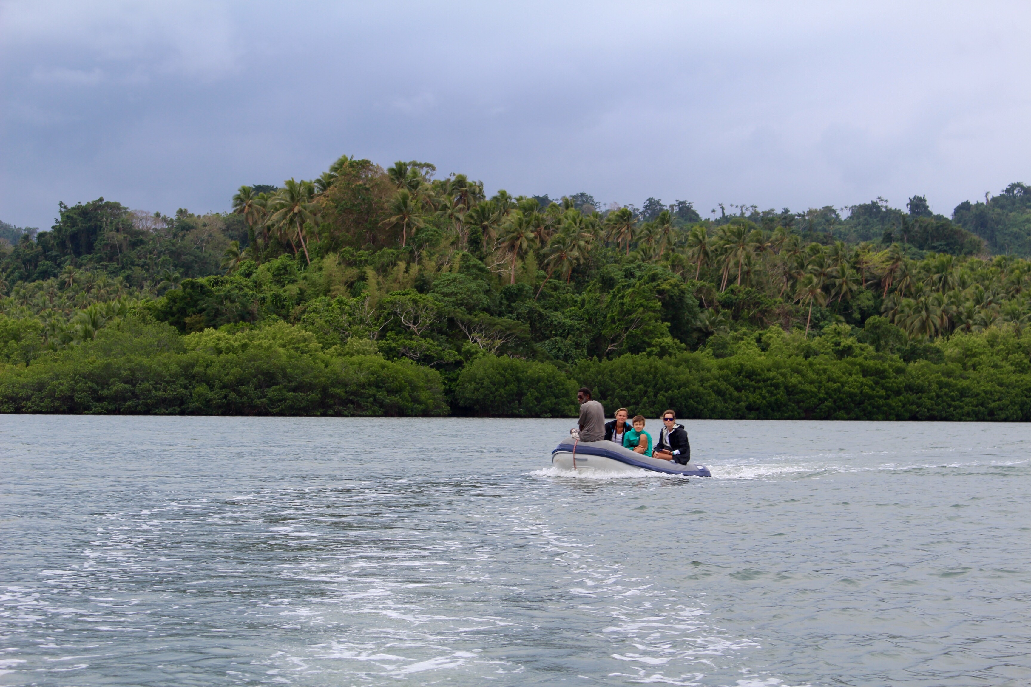 Taking two dinghies to the beach, we met Principal Chief James. Each tribe, which I believe equates to an extended family, has a chief. A Principal Chief is elected for a four year term to oversee the entire village. Or in this case it is a collection of four neighboring villages. To visit the lagoon (or to snorkel at the reef) you must get permission from the chief. But you wouldn’t want to do it without a guide anyway, because what’s cool is not the lagoon itself, but the culture of the people living around it. We negotiated a fee for our two guides for the two dinghies. James came with us. The second guide was Chief Esrom, who many years ago became Luc’s blood brother.