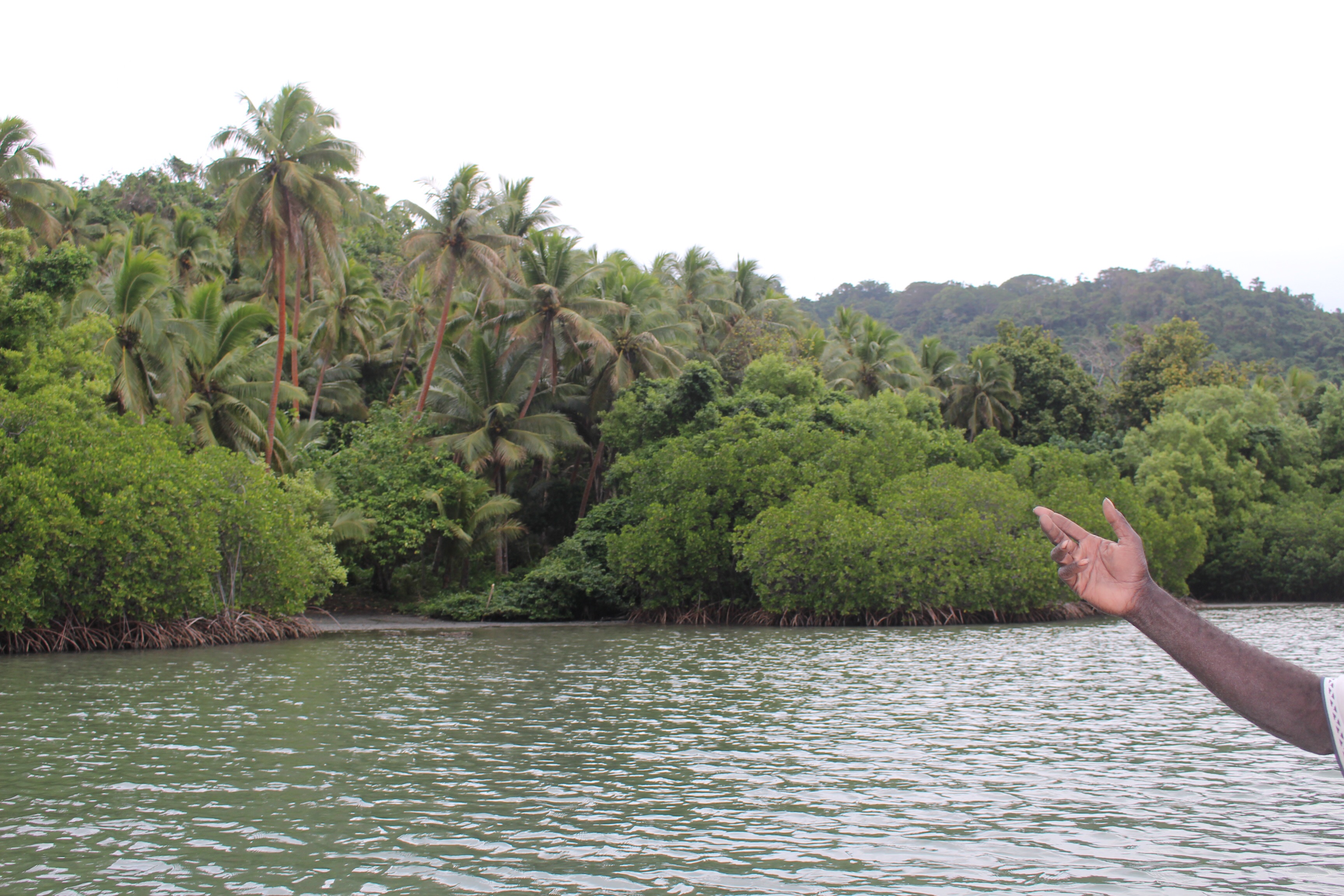 Every 100 yards or so is a little clearing in the mangroves, often just big enough to fit a canoe (with outrigger). These have been cut so that village residents can access their “garden” in the bush.