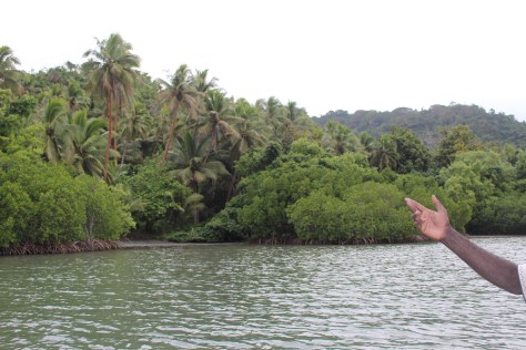 Up the little tidal river we went, James sitting in the bow and pointing which way to go to avoid the shallows, and telling us about the villages and the customs. Past a field with a small heard of goats. Past a large canoe heavily loaded with firewood, paddled by two women. Past men working on building a guest house atop the steep bank, who hooted and shouted at us in fun, but I never saw them in the dense growth. Past endless mangroves at the water’s edge, with paths cut through every so often just wide enough for a canoe (with its outrigger) to get to the muddy shore, so a family can tend their garden there.
