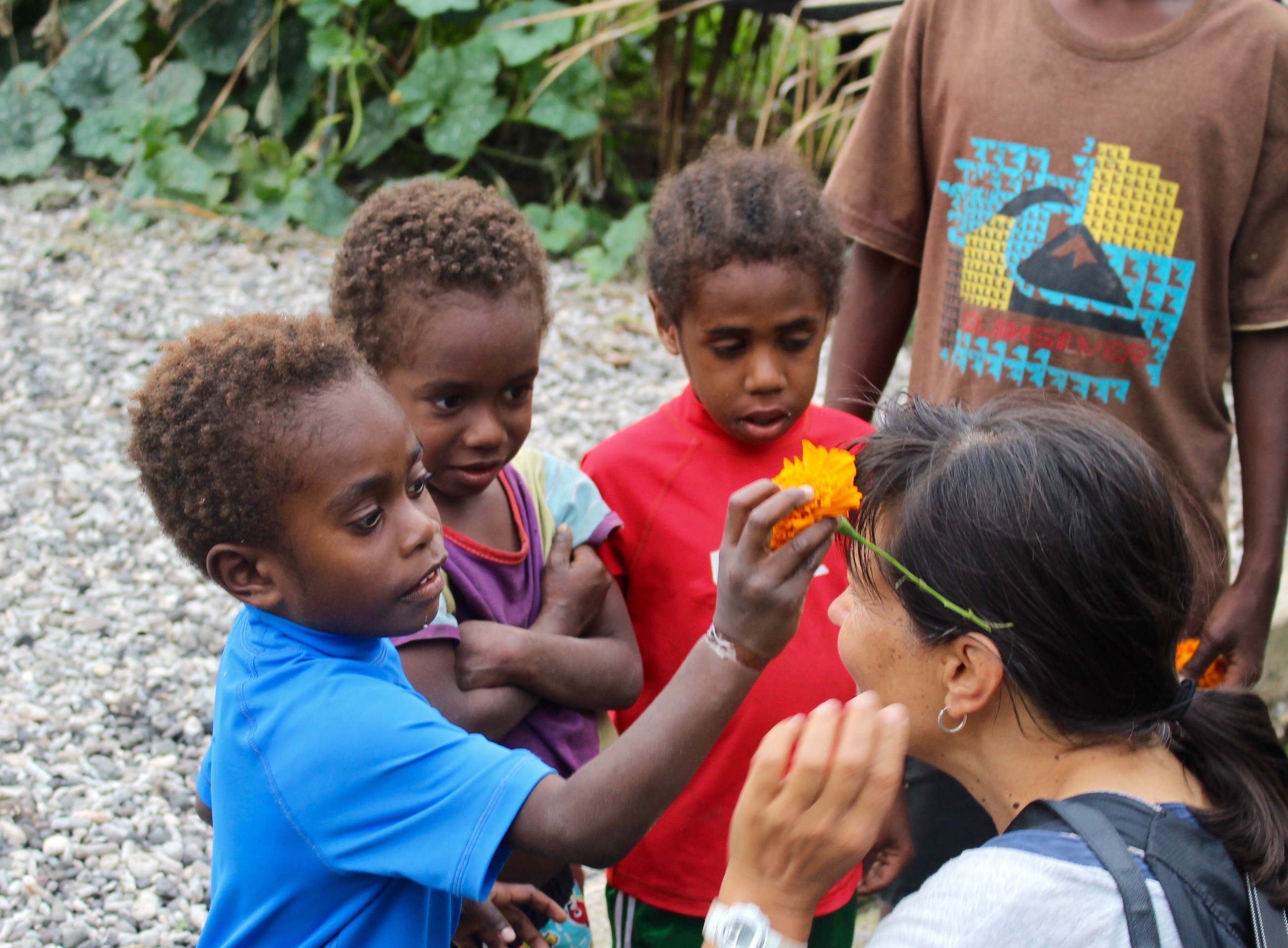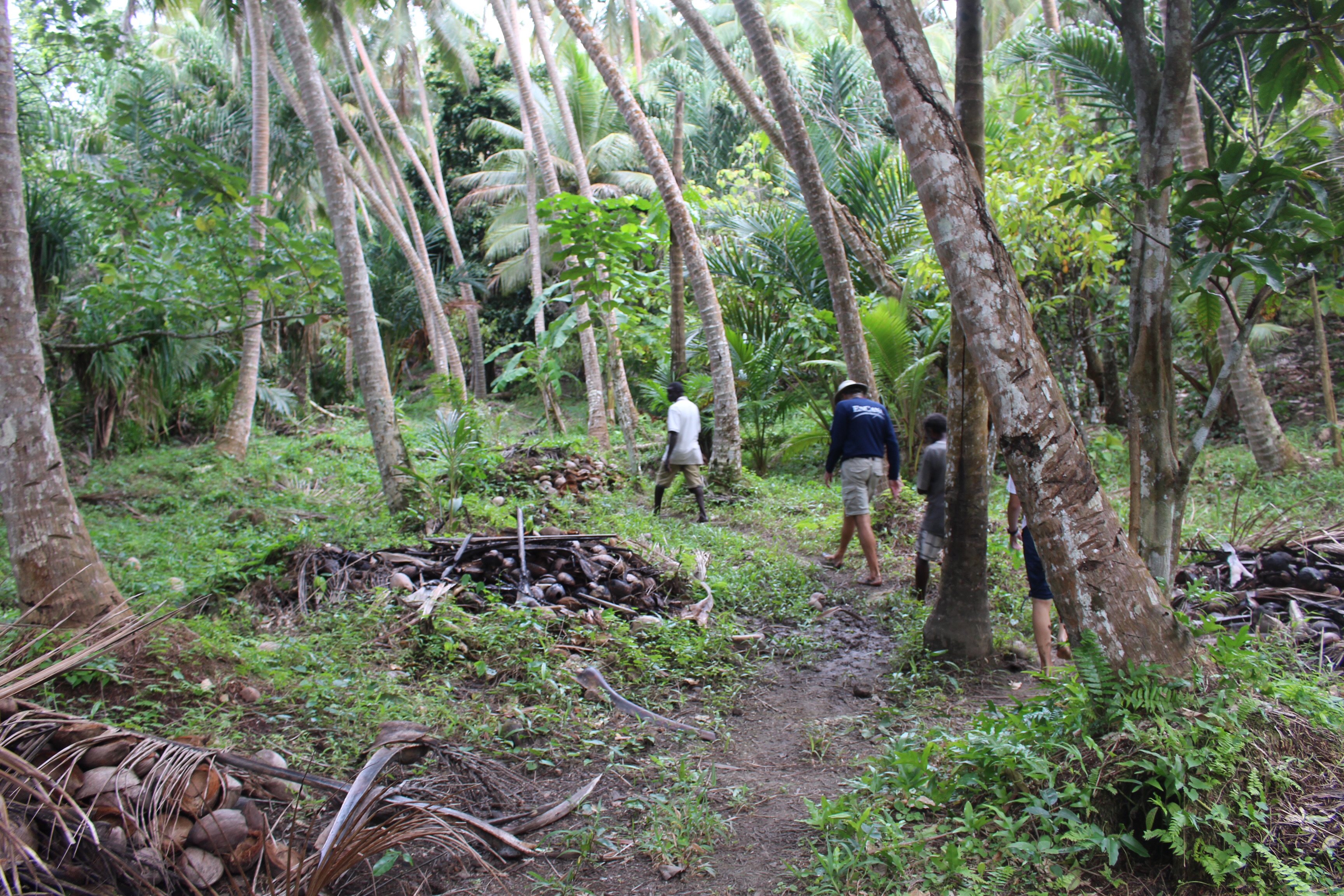 The village was up a well made set of steps to a plain above the water. We met the local chief (later we learned that he was James’ father), and after explaining the leaf on Dan’s head we were properly welcomed. That is, the children gave us each a flower, and we each received a young coconut with a reed-like straw to drink the juice.