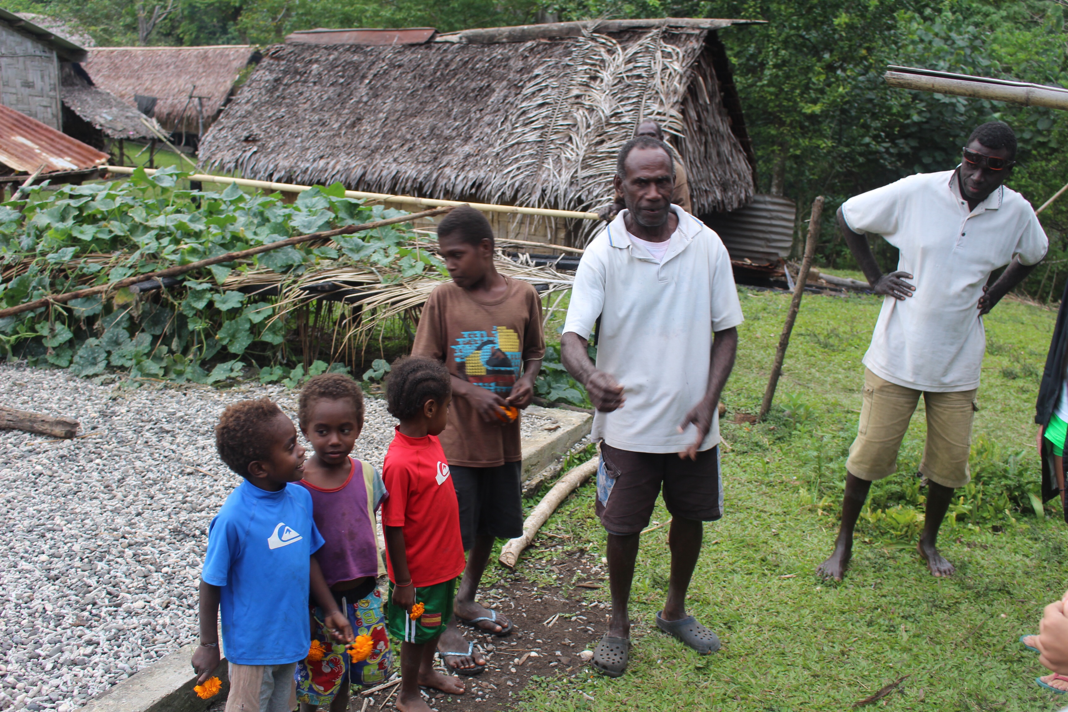 We stopped for a short walk through the bush to a watering hole, where James demonstrated that you could drip the sap of a certain vine into the water, and it would “clean the water.” That is, whatever stuff was floating on the surface would move away from the sap, leaving a clear surface for drinking. As we walked out, James told us about a custom, that if you kill someone in the bush (not clear to us if this referred to slaying an enemy or other forms of manslaughter), you place a certain leaf on your head when you are returning to the village. This announces that you have killed someone, and you are expected to go to the chief to tell the story. Dan volunteered to wear such a leaf into the village — James assured us he would explain that this was merely a demonstration.