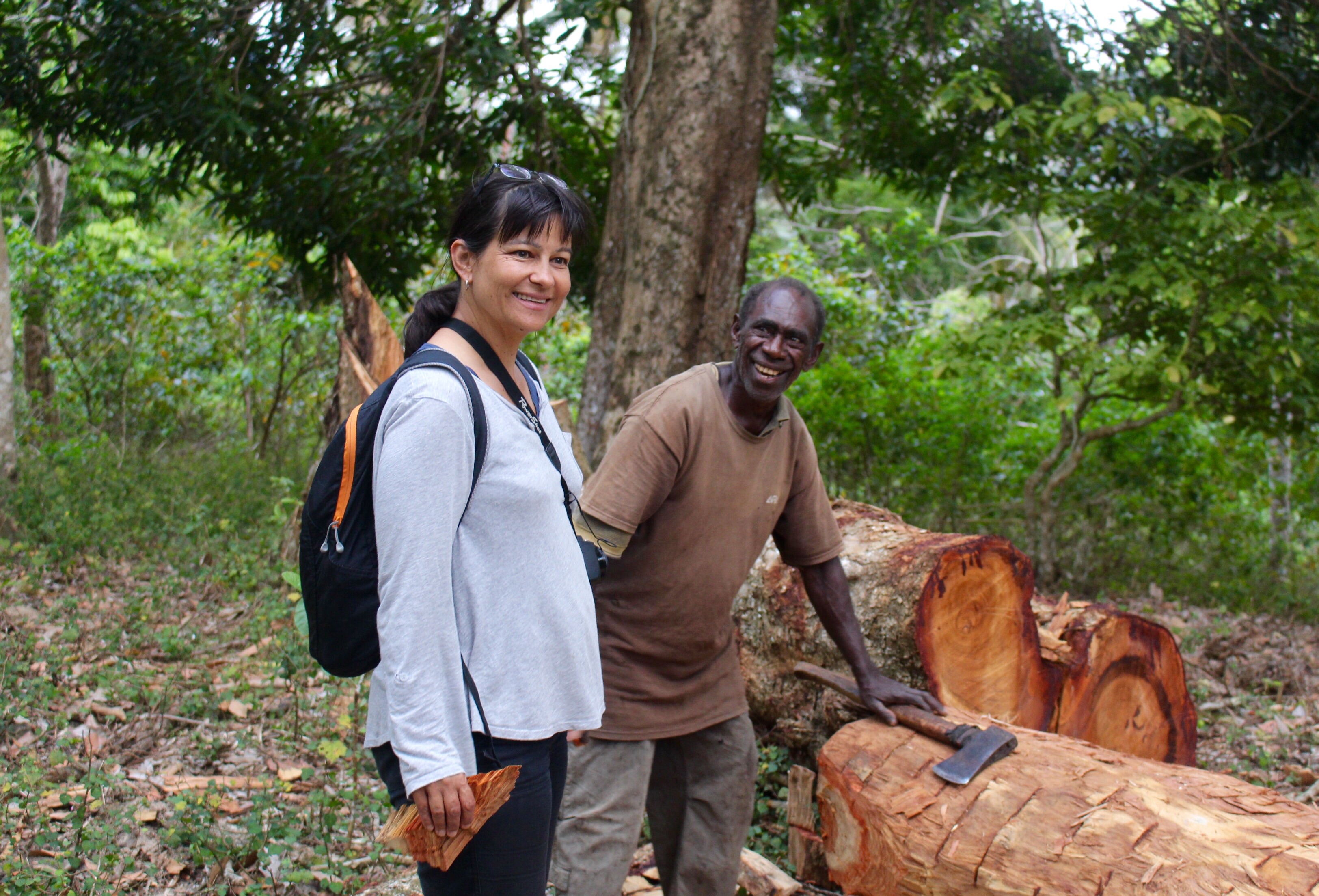 We walked through the little village and into the bush, to see a canoe being built. Before the first missionaries in 1895, canoes (and drums) were hollowed out by burning the inside wood. That approach gave way to the adze. Now more often than not the tool of choice is the chain saw — even for the inside. But our canoe builder was using an axe to strip the bark of the “blue water tree” log. The name does not refer to the distance the canoe will travel. Rather, it is what happens when you put the bark of the tree in the water. If you wait a few minutes, the water begins to turn blue. They demonstrated this for us. The blue water tree is the best wood for canoes – they will last 15 to 20 years. Canoes are also built from the “white wood tree,” but these they say last maybe 3 years. It takes a month for a man to build a canoe. Many men are capable of making a canoe, but (this said with a knowing look) only a few can make a special canoe.