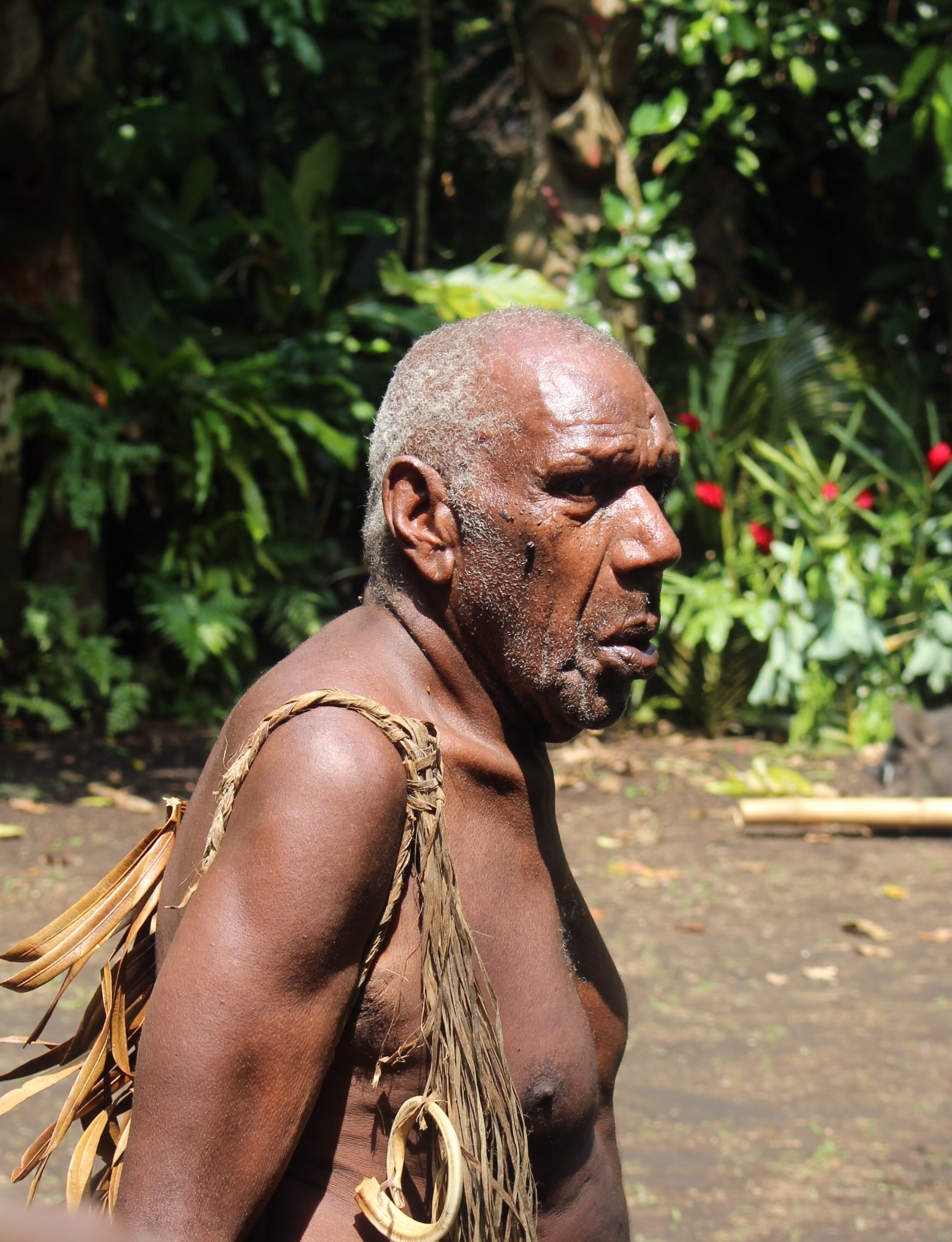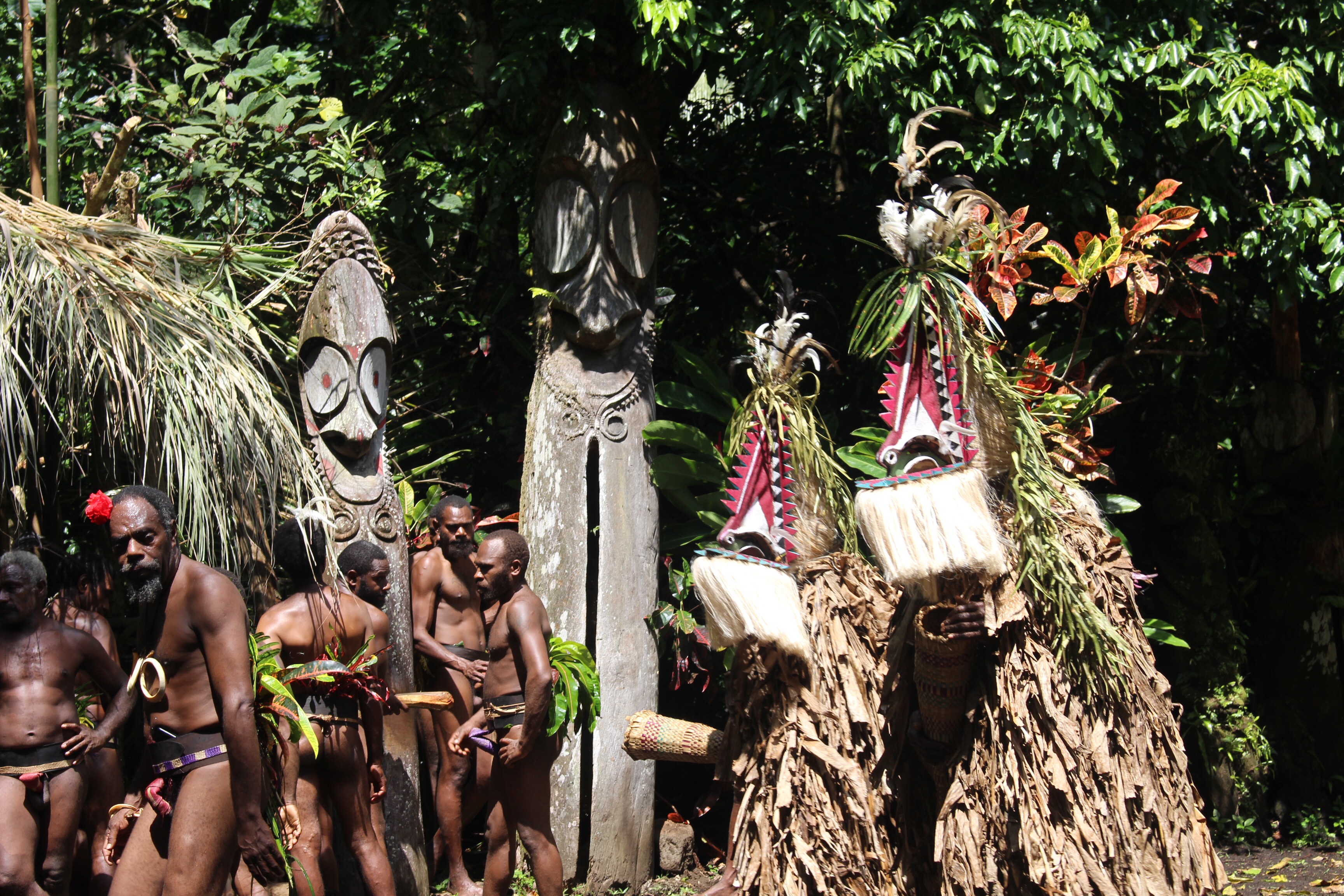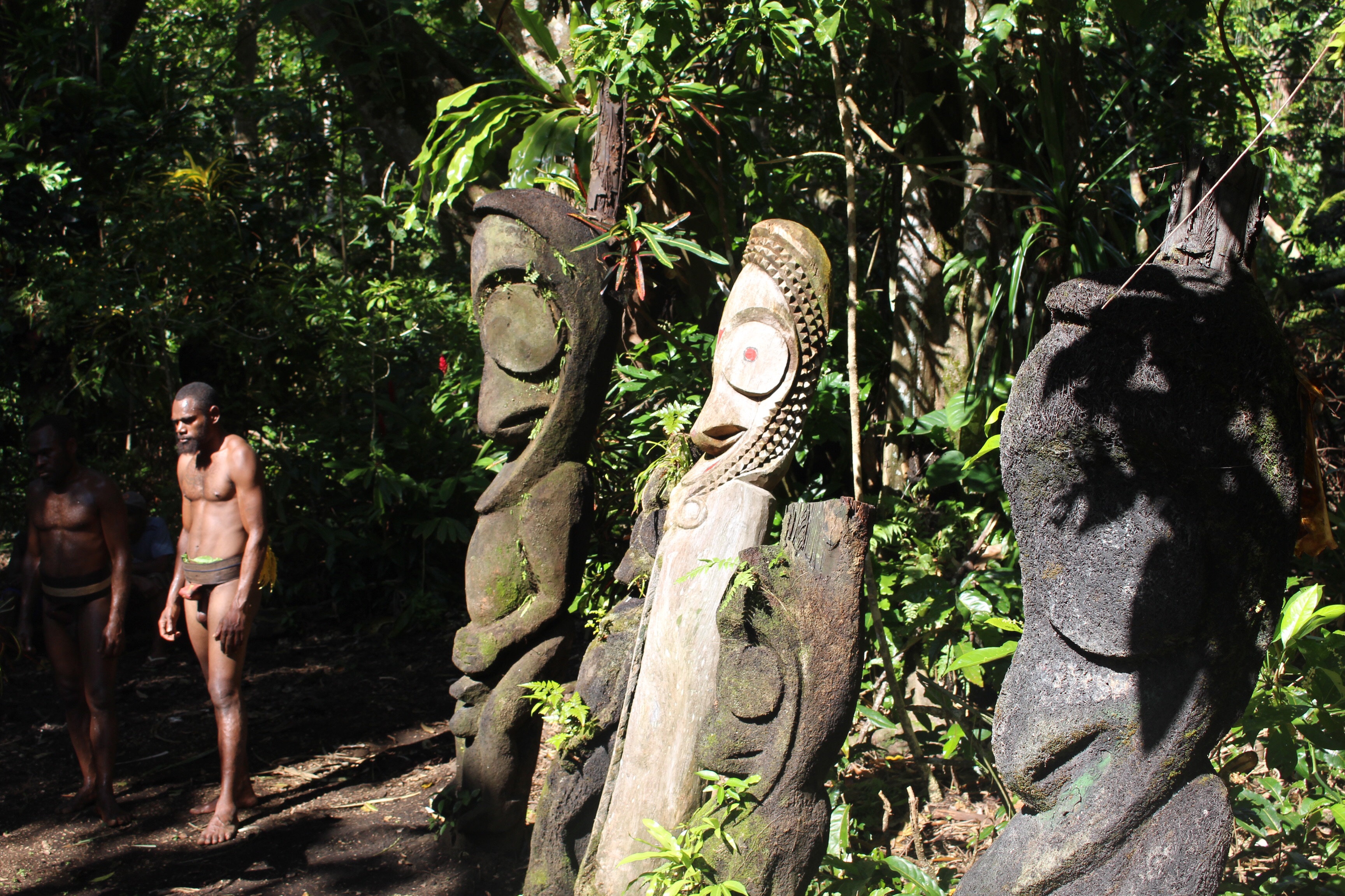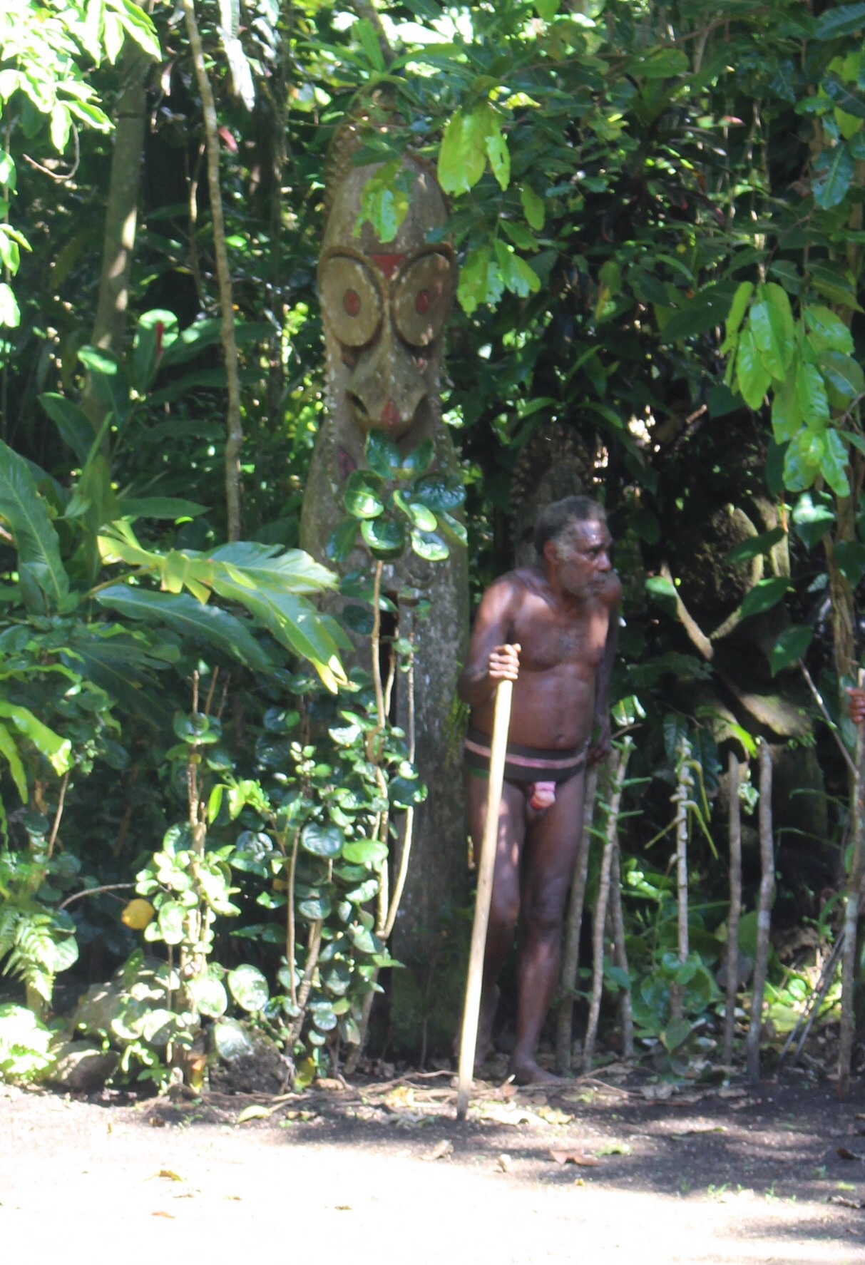 In the morning we all meet ashore and set out for the festival, about two miles away, with a guide. Lots of people and some little shops along the way. Everyone smiles and says hello. If you look directly at the children and say hello, you get rewarded with a beautiful smile and a wave. We leave the road and follow our guide half a mile through the bush. We are told to wait in a clearing near two carved drums; Luc says we are close to the ceremonial grounds.