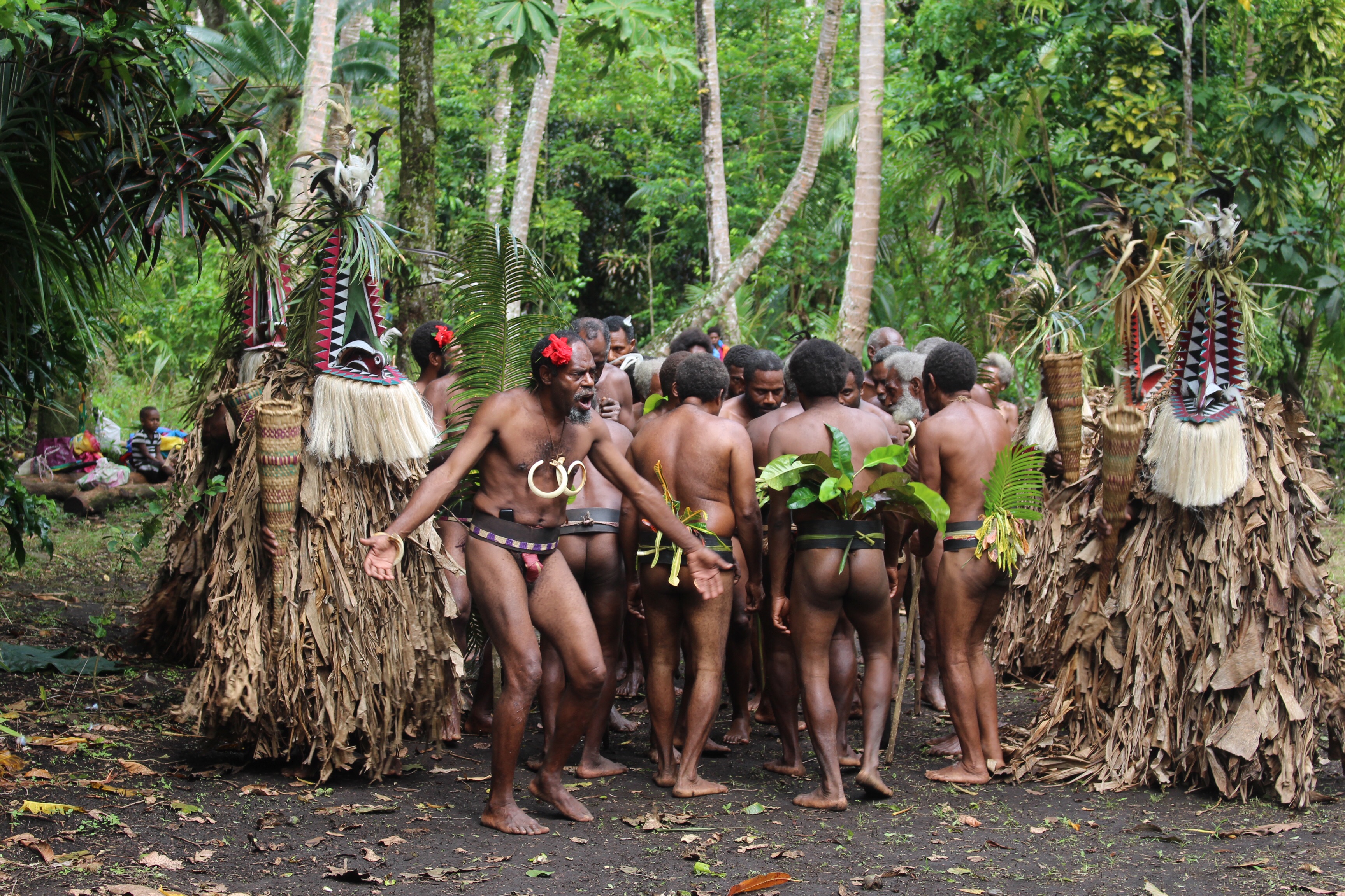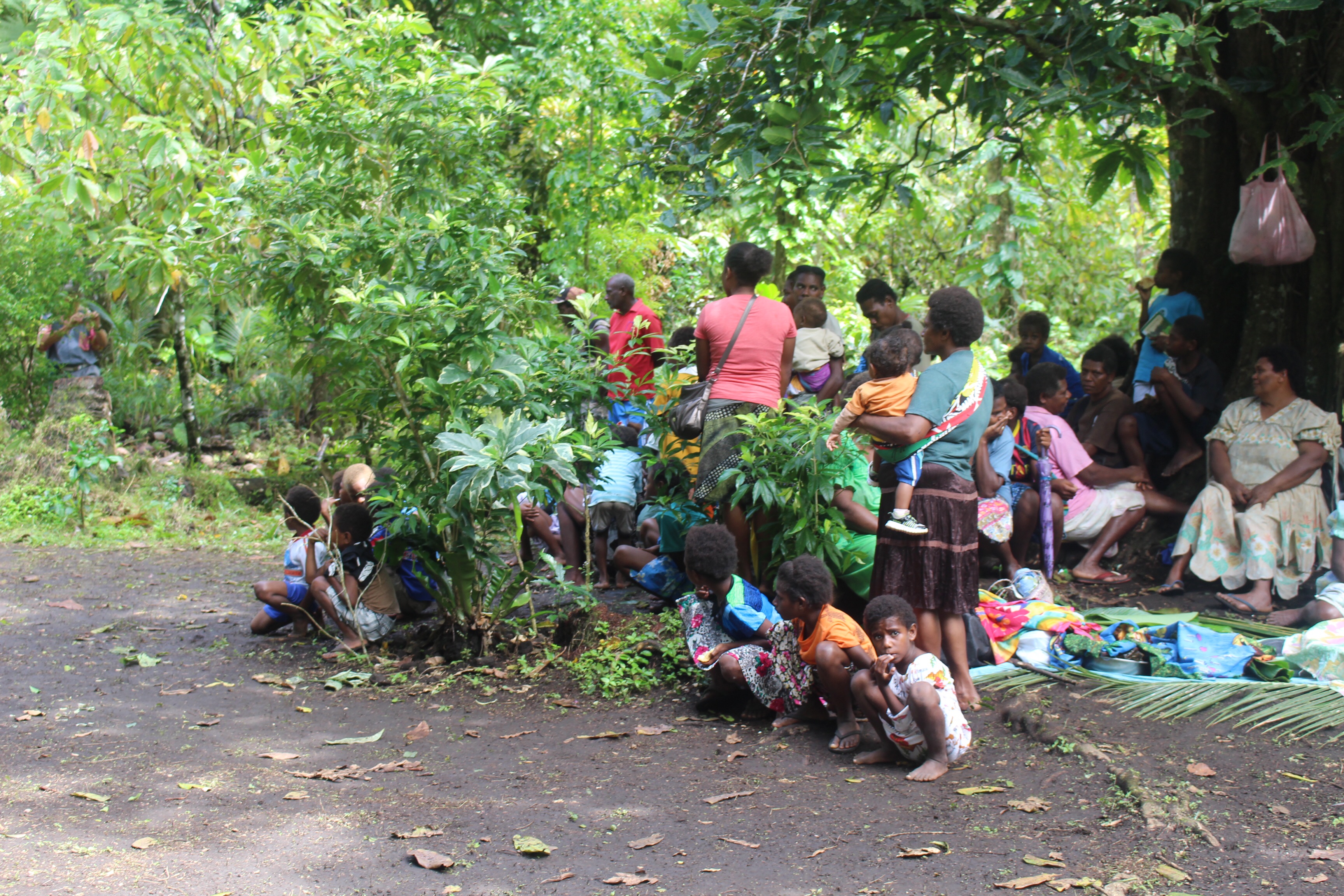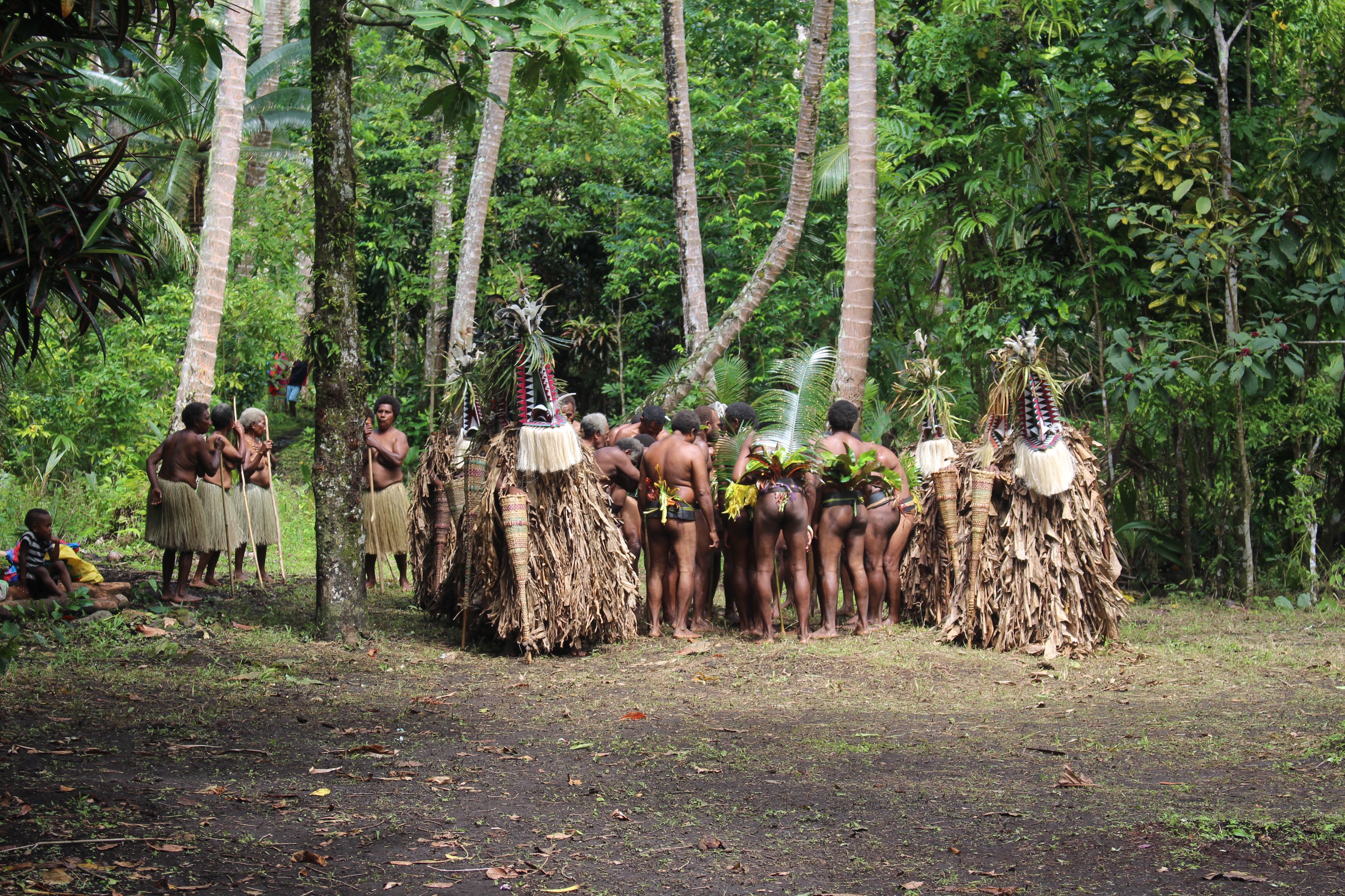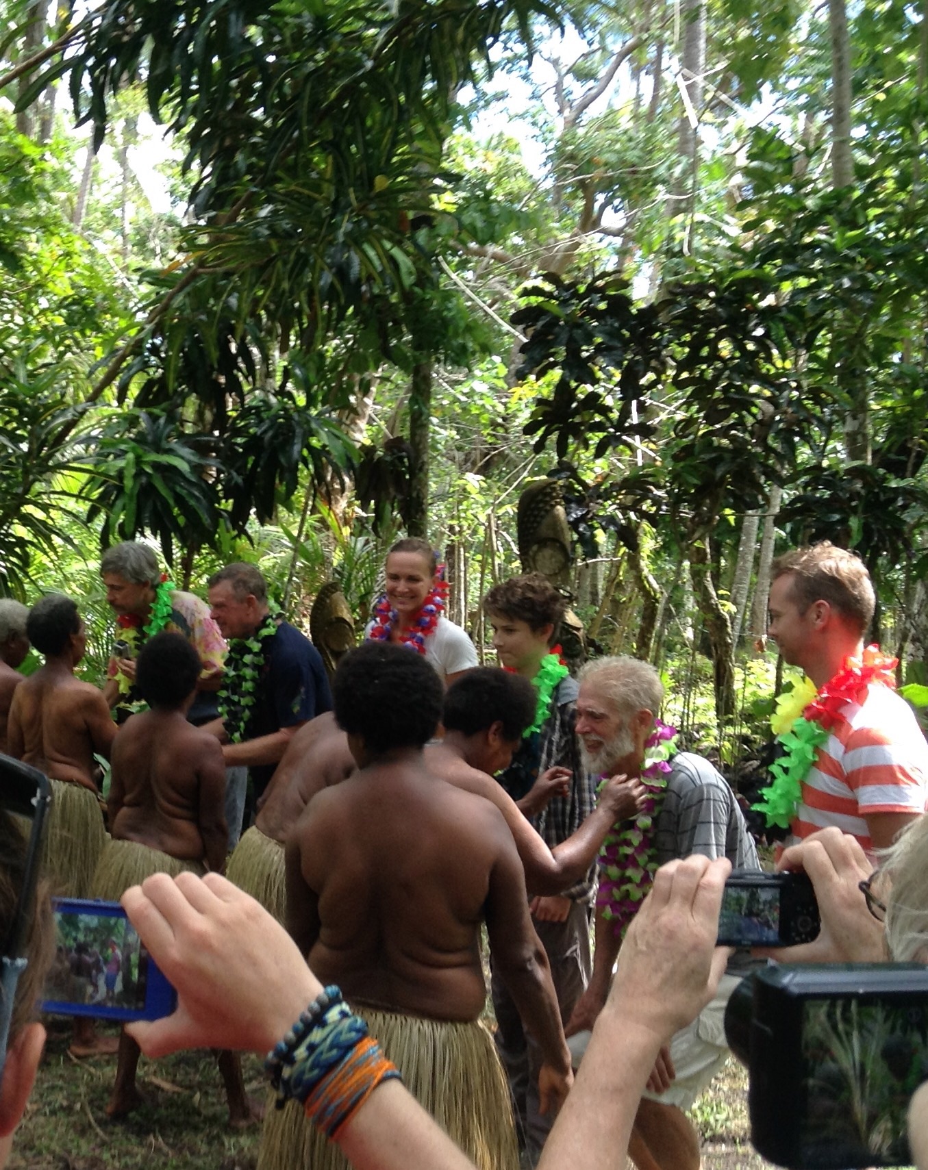 In the morning we all meet ashore and set out for the festival, about two miles away, with a guide. Lots of people and some little shops along the way. Everyone smiles and says hello. If you look directly at the children and say hello, you get rewarded with a beautiful smile and a wave. We leave the road and follow our guide half a mile through the bush. We are told to wait in a clearing near two carved drums; Luc says we are close to the ceremonial grounds.