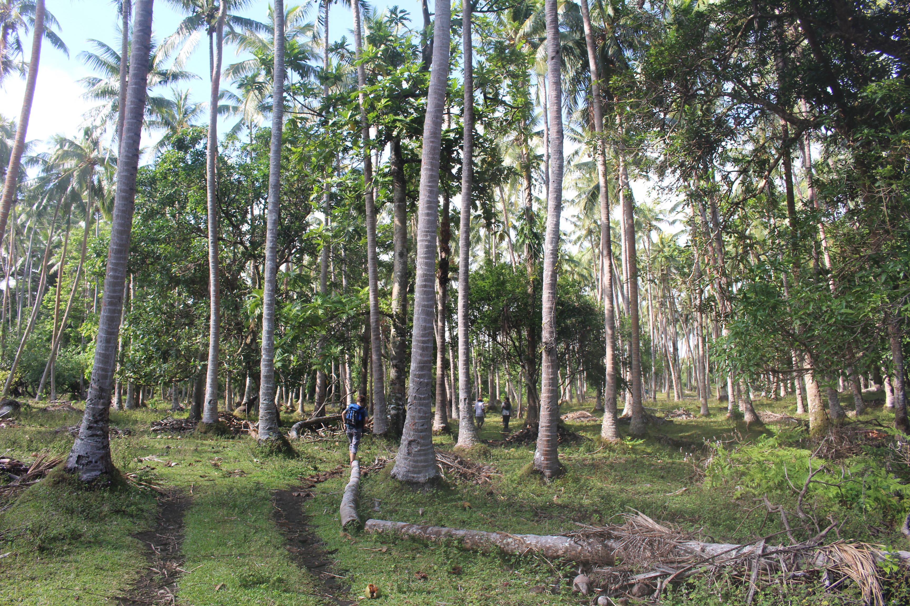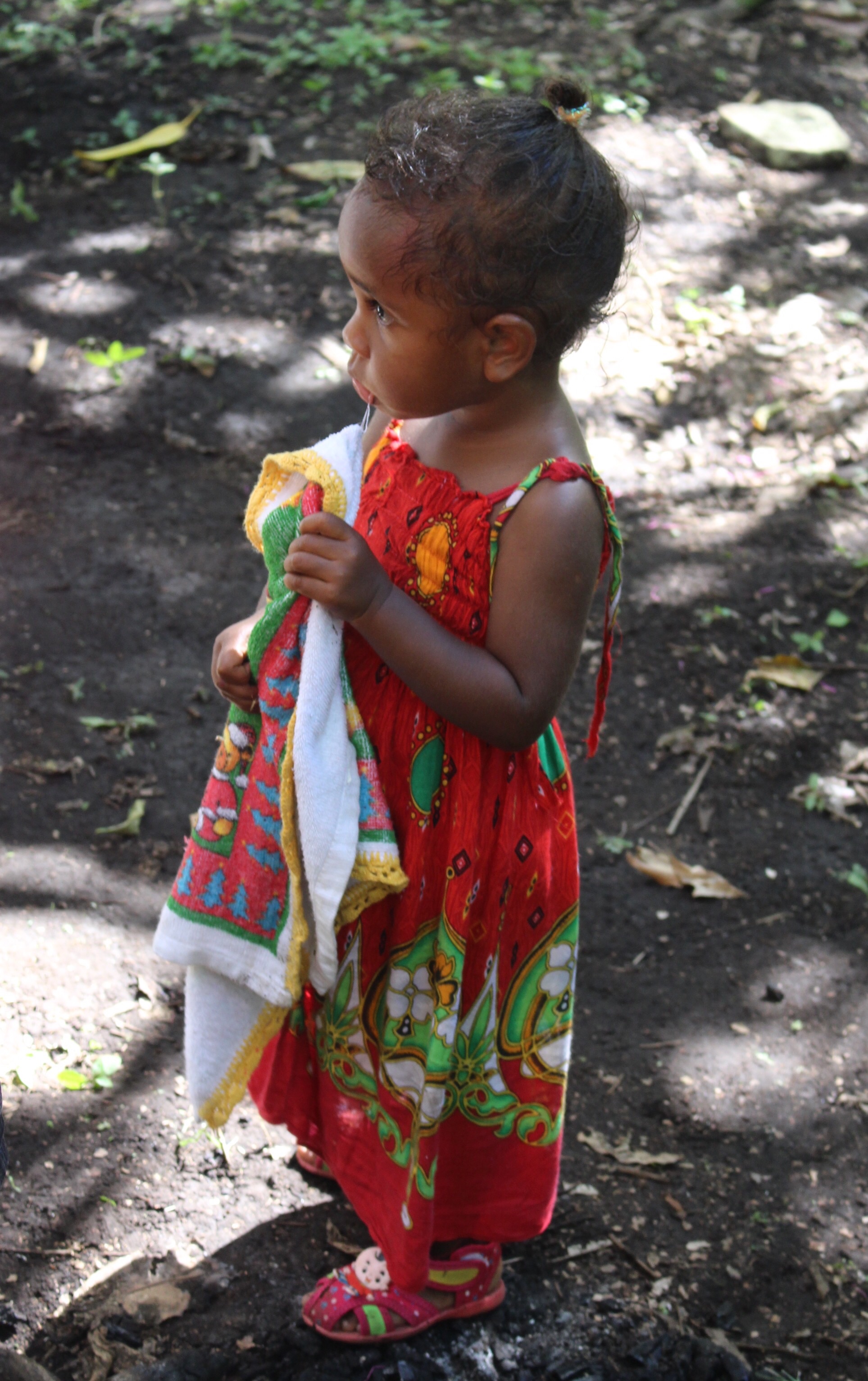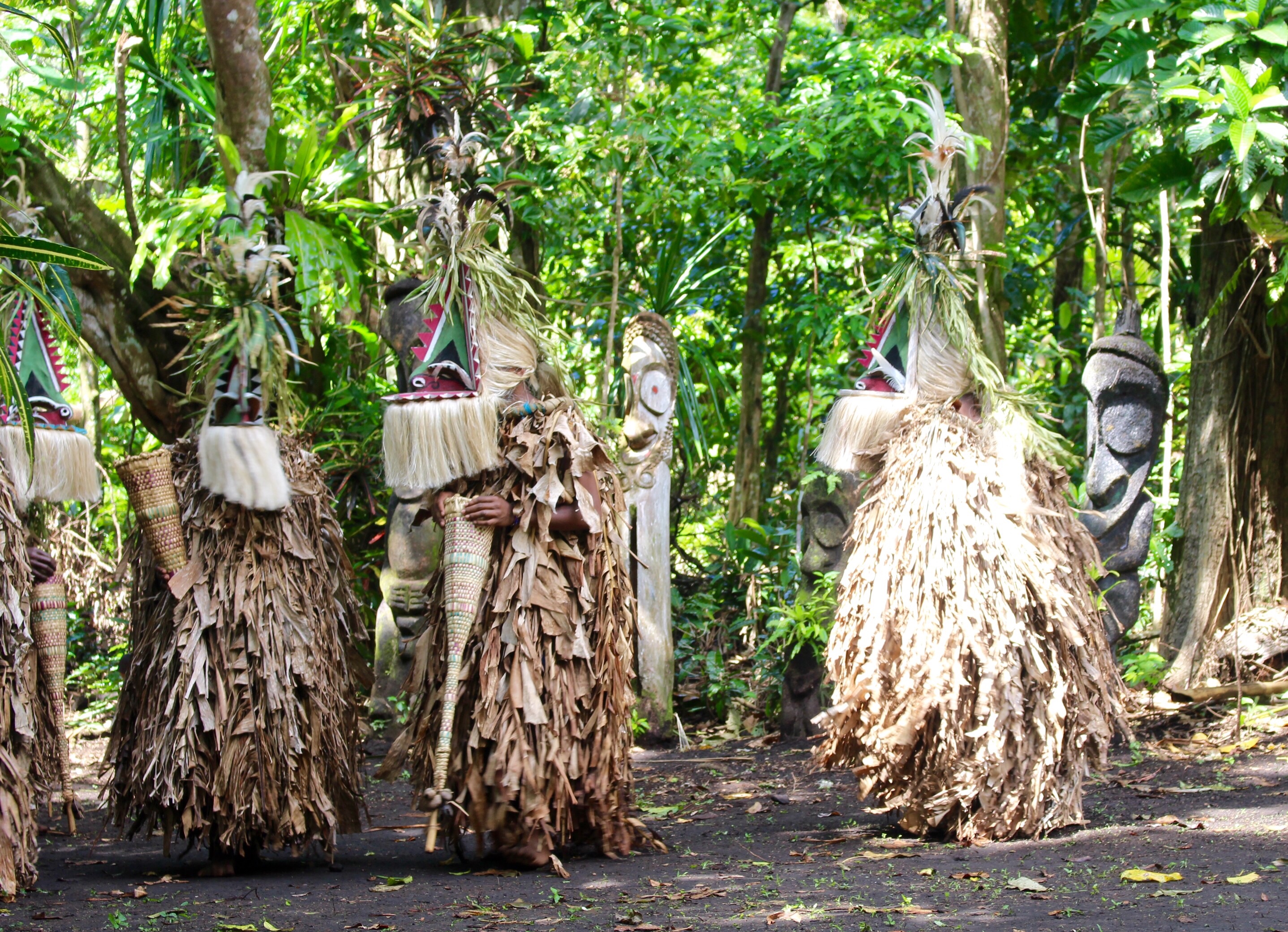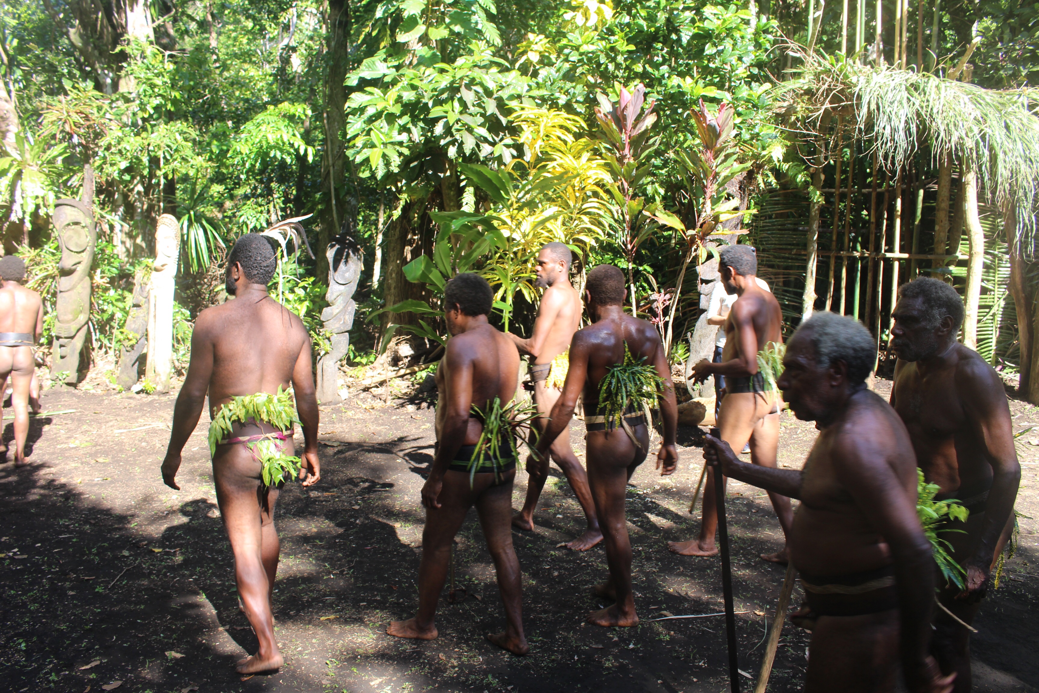 In the morning we all meet ashore and set out for the festival, about two miles away, with a guide. Lots of people and some little shops along the way. Everyone smiles and says hello. If you look directly at the children and say hello, you get rewarded with a beautiful smile and a wave. We leave the road and follow our guide half a mile through the bush. We are told to wait in a clearing near two carved drums; Luc says we are close to the ceremonial grounds.