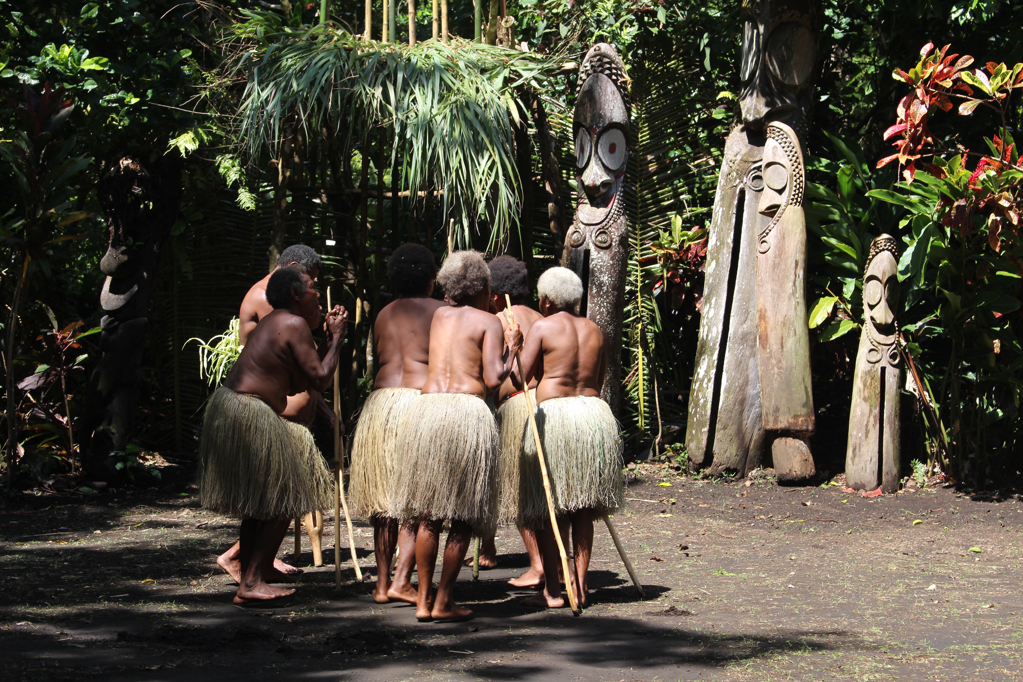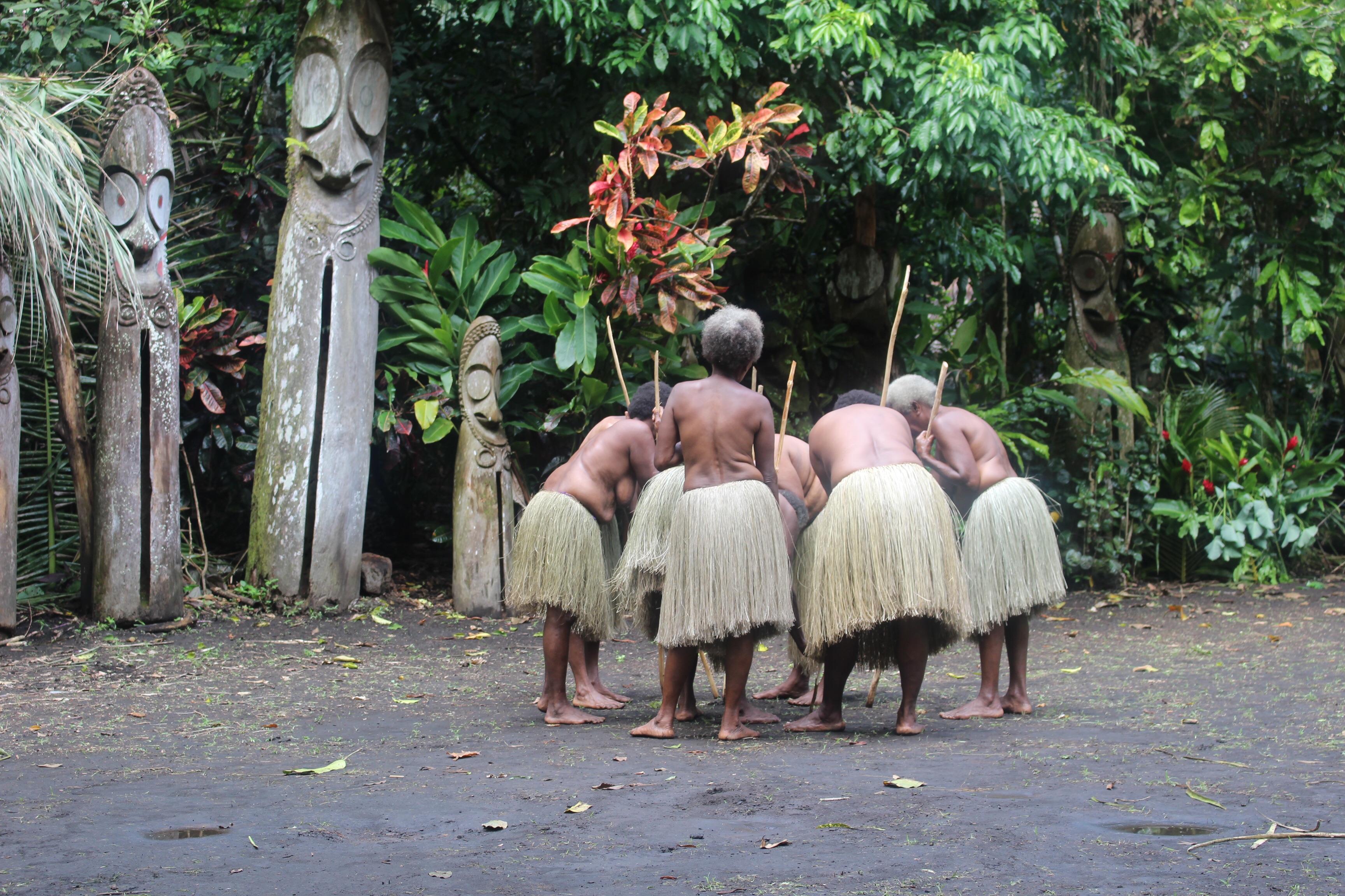 Our group is told to follow the men, one of whom begins beating a drum, and we are led into a clearing that is obviously the ceremonial grounds. Many large carved drums on the periphery; some improvised benches for us; some locals on their own mats.