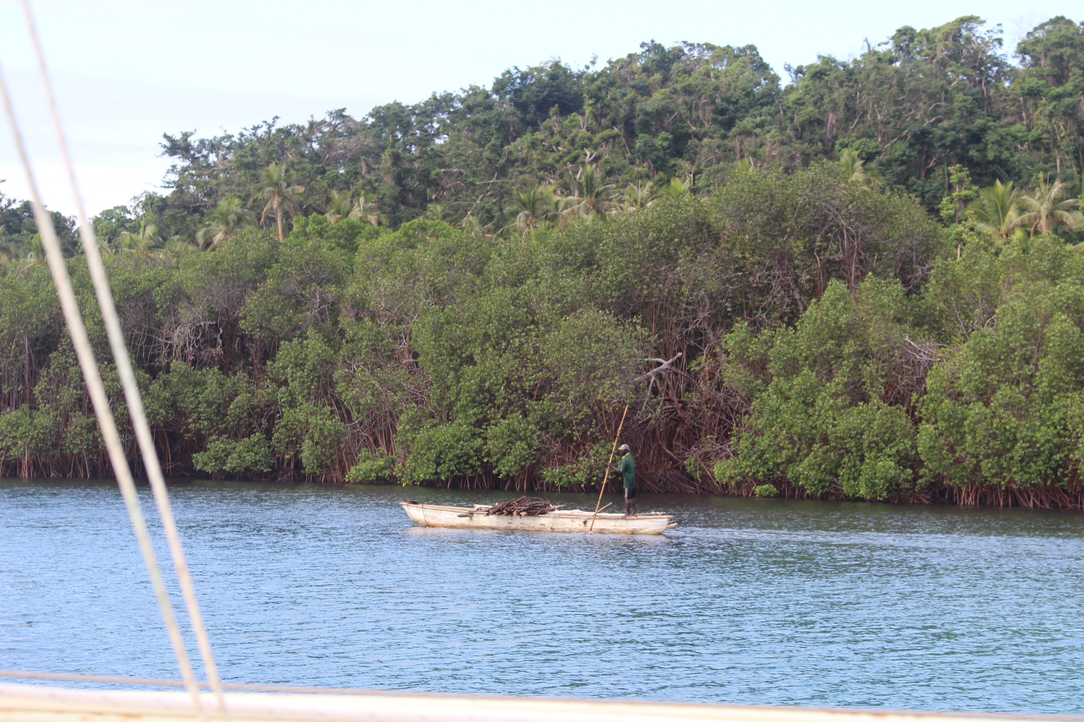 A canoe paddled by shortly after we anchored, and we had a chat. It was a bigger canoe than I had seen before, and the first I had seen that carried a sail. The gentleman had his garden nearby, but he lived on an island a couple miles upwind. Easy getting to the garden; hard work getting home. He mentioned that he had also caught some small fish for his dinner. Given how empty our cupboards were, I asked if he had caught enough to sell some to us. He stared at me and said, “You are serious!?”