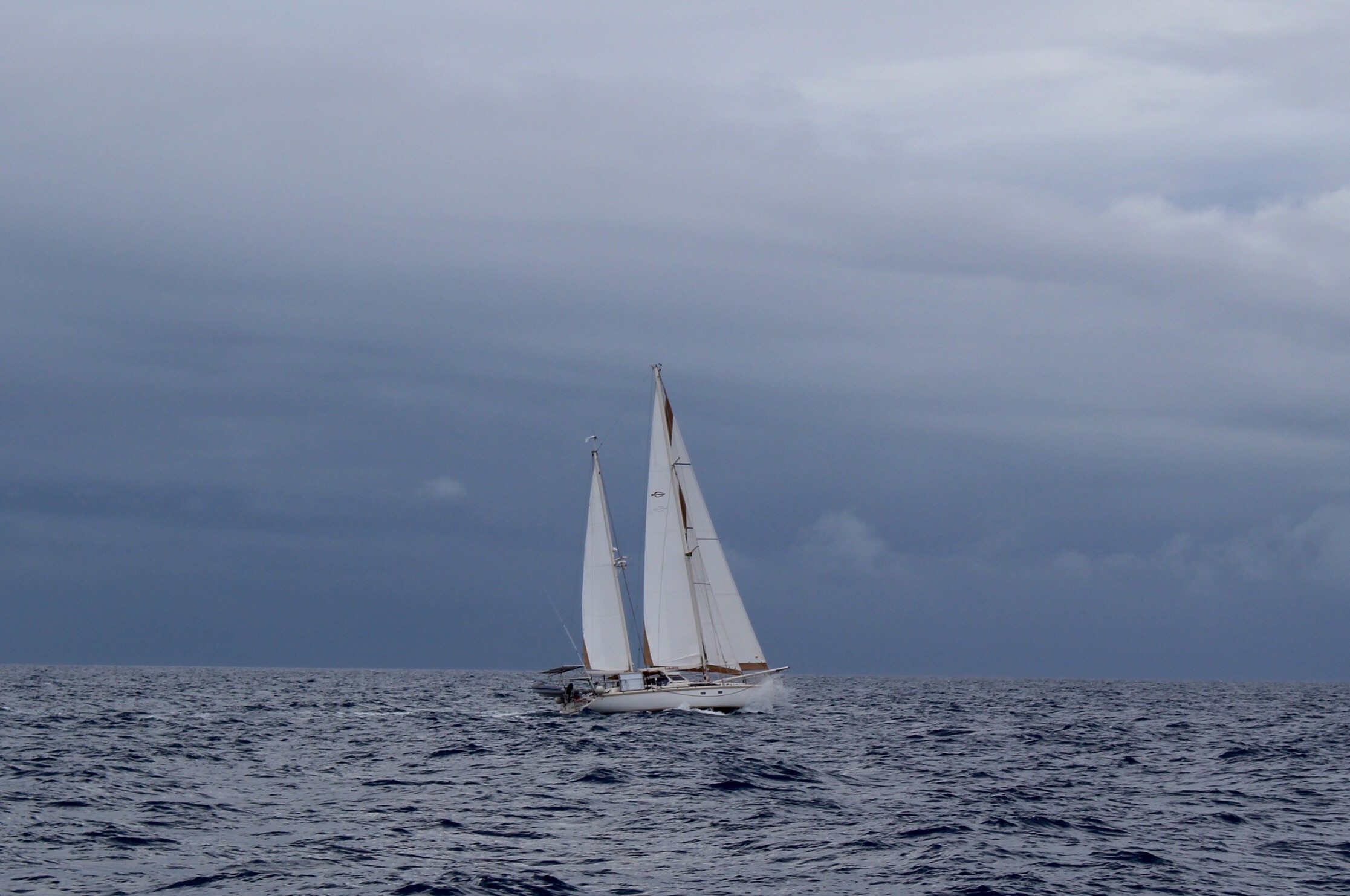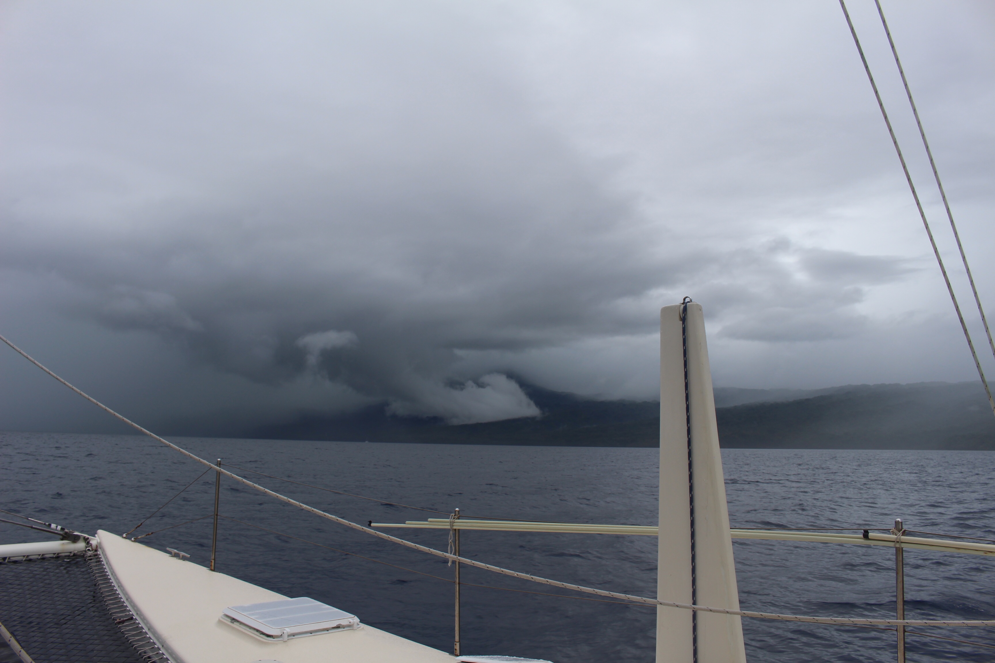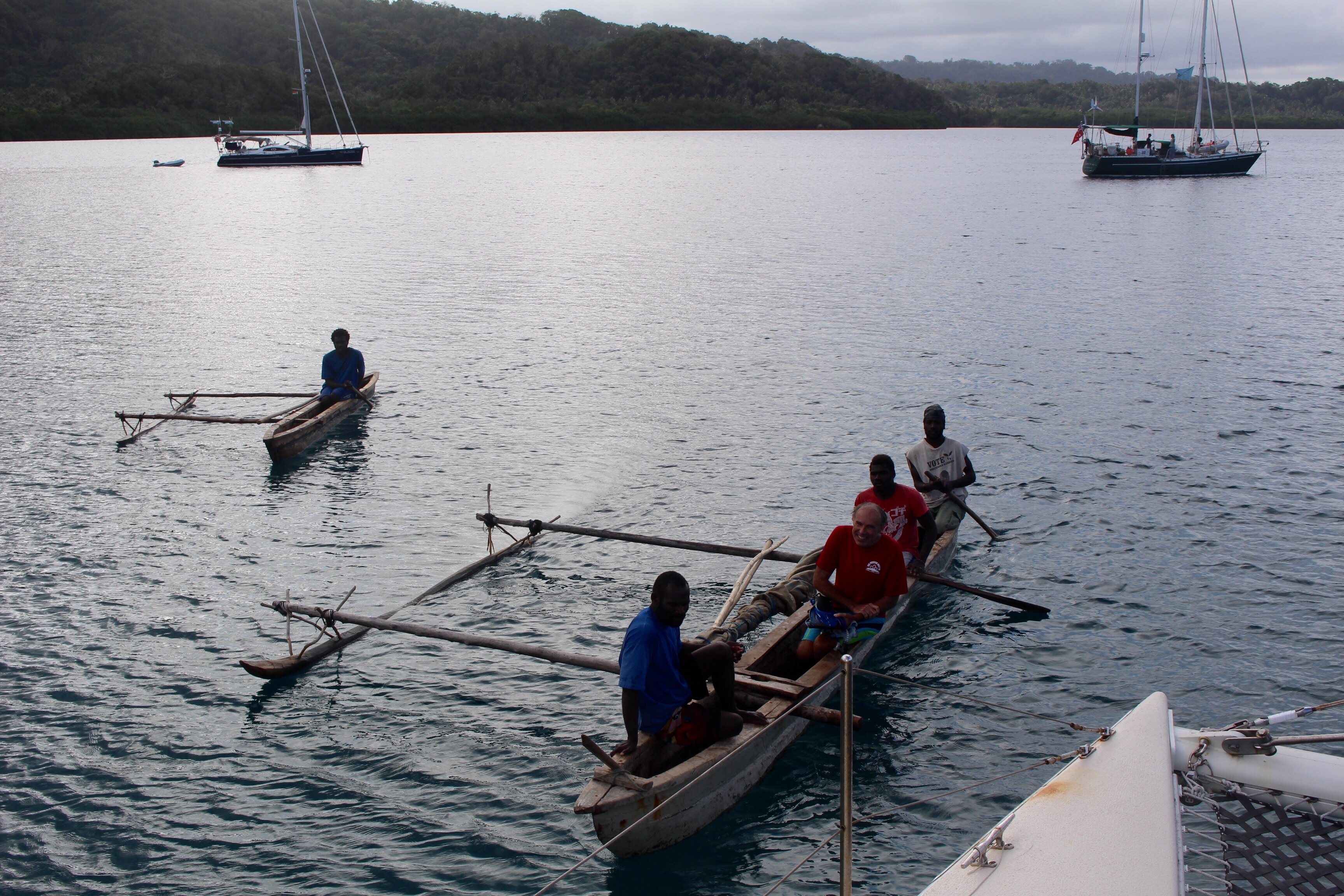 Getting there was no small task. We had to beat into a very stiff wind and choppy seas the first day. Put our repaired shroud to the test. We all anchored at the Maskalyne Islands, about half way there, with the pleasant prospect of the next day’s sail being downwind.
