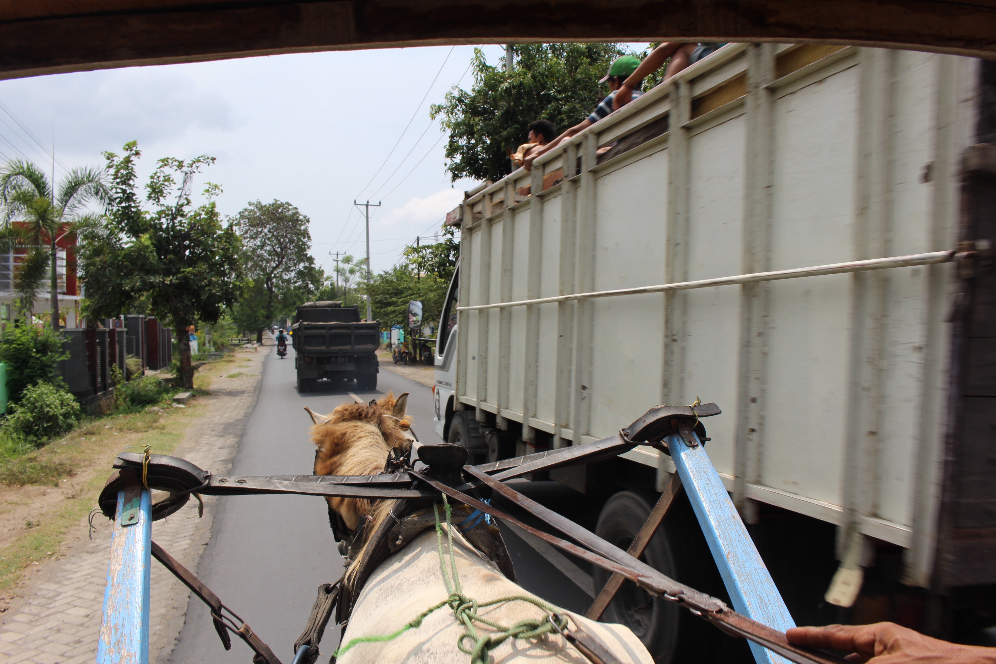 Riding in Indonesia is a scary/fun challenge. We’re used to driving on the left at this point. But in Indonesia that seems to be about the only rule. Lots of creative driving, especially when it comes to passing, which is pretty much all the time. If the road is wide enough for, say, one car plus two motorbikes, many drivers expect that combination to fit, without any regard to “sides” of the road. So, for example, a car might pull half way into the right lane to pass a motorbike, despite the fact that a motorbike is approaching — it will still fit in the remaining half a lane. In fact, cars tend to pass like this even if there are TWO oncoming motorbikes, side by side. This arrangement won’t fit, but it is assumed that the two oncoming bikes will get into a single file when they see a car approaching in their lane.