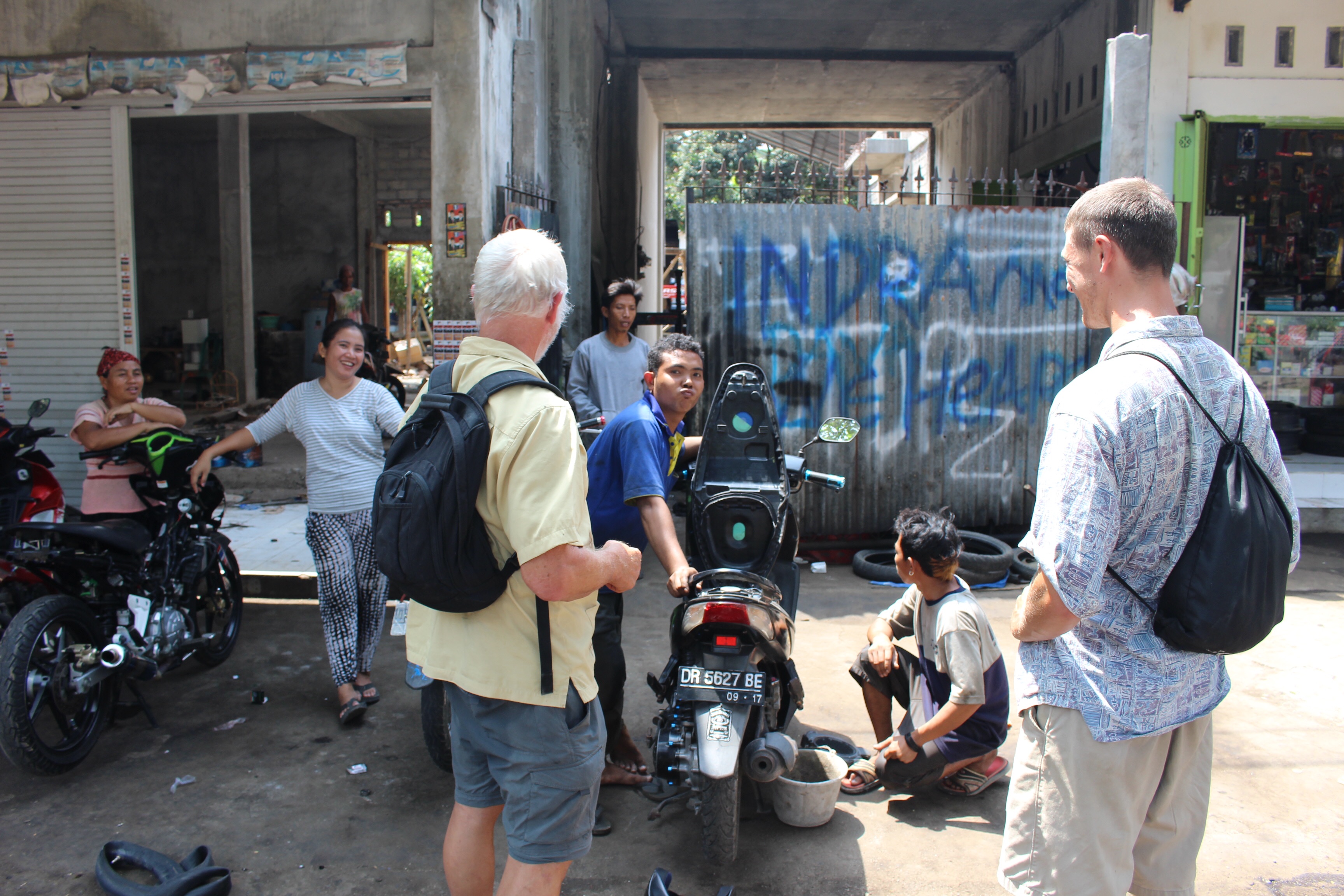 It became a quest to make it to this waterfall. Tim’s bike overheated. We (Jesse) found a bike shop where they added coolant. But before long it overheated again. Jesse found another shop. This time the guy pulled the cover off the engine, exposing an air filter thoroughly clogged with dust and volcanic ash. He cleaned it out with compressed air, and the problem was solved.