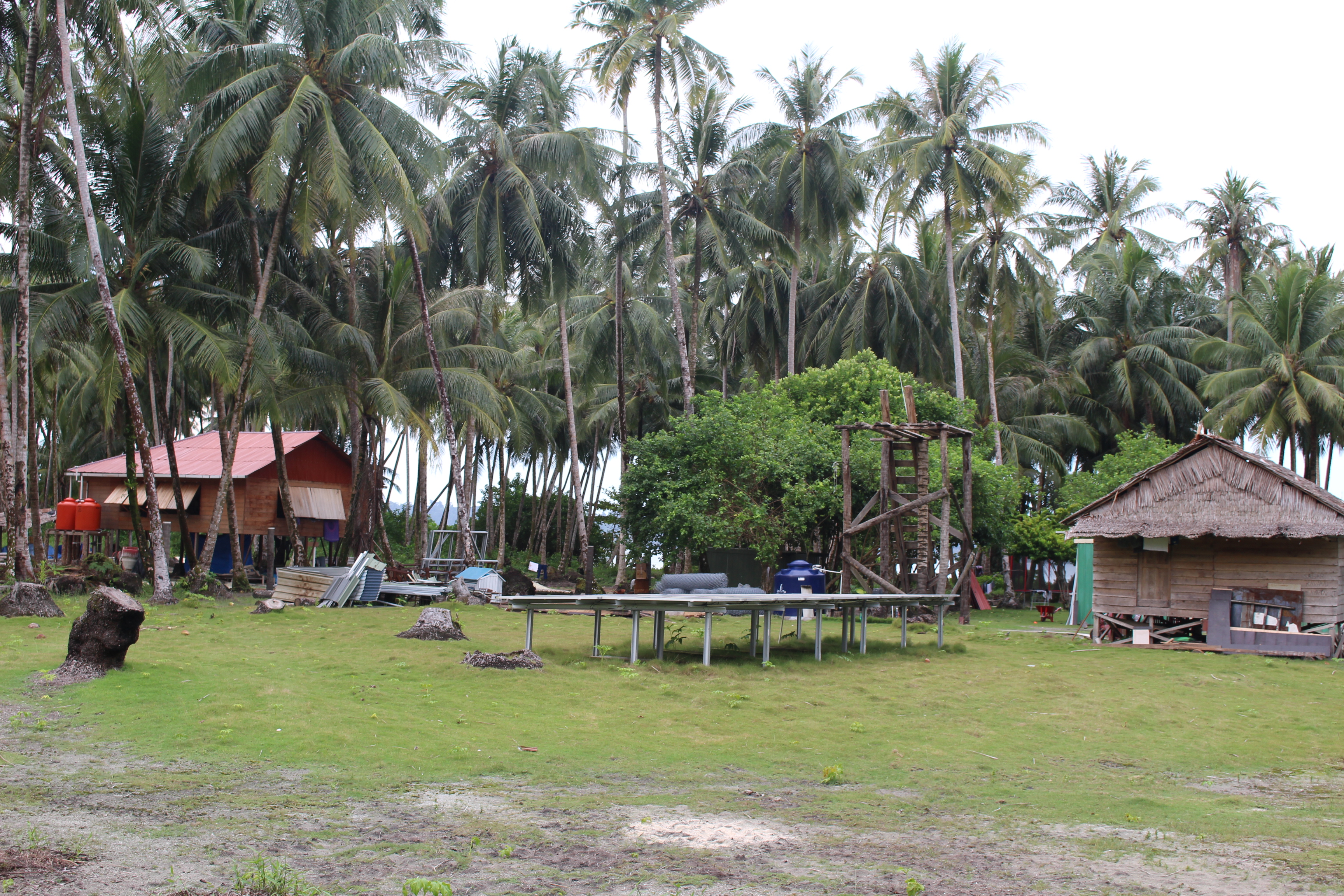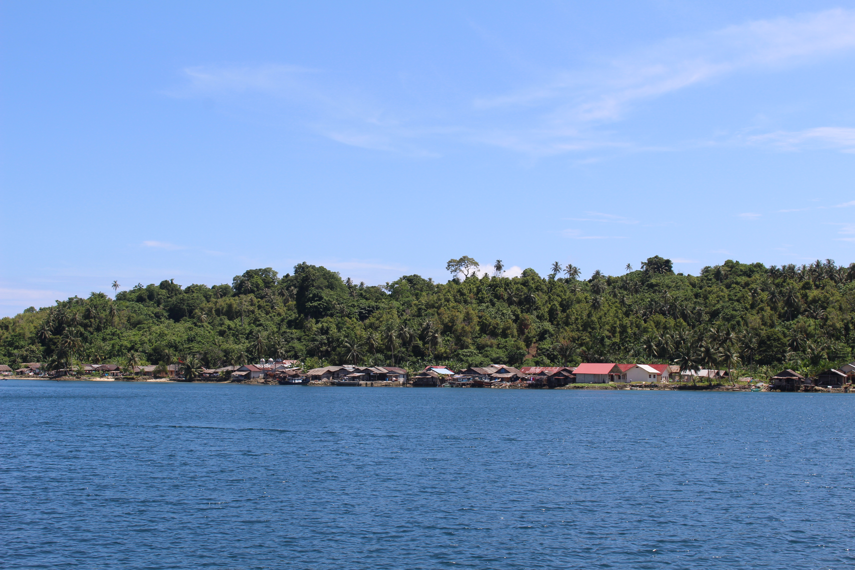 We left Lagundri at dawn, 55 miles to our next planned stop at Sipika in the Telos island group. After motoring for two or three hours, a breeze came up, and then grew to 20 knots — almost unheard of hereabouts, except in squalls. We had a nice sail, but the wind wouldn’t let us point to our destination. So we decided to “go with it” and head for the east side of Pulau Tanahmasa instead of the west. As the sun was getting low we entered a very inviting bay that has no name on our chart. Also the chart suggests that it is too deep for anchoring, but we found a good spot just inside the northern point of land, off a little village. We are anchored just a quarter mile north of the equator. Across the bay is another village, in the Southern Hemisphere. We decided to name this anchorage Equator Bay.