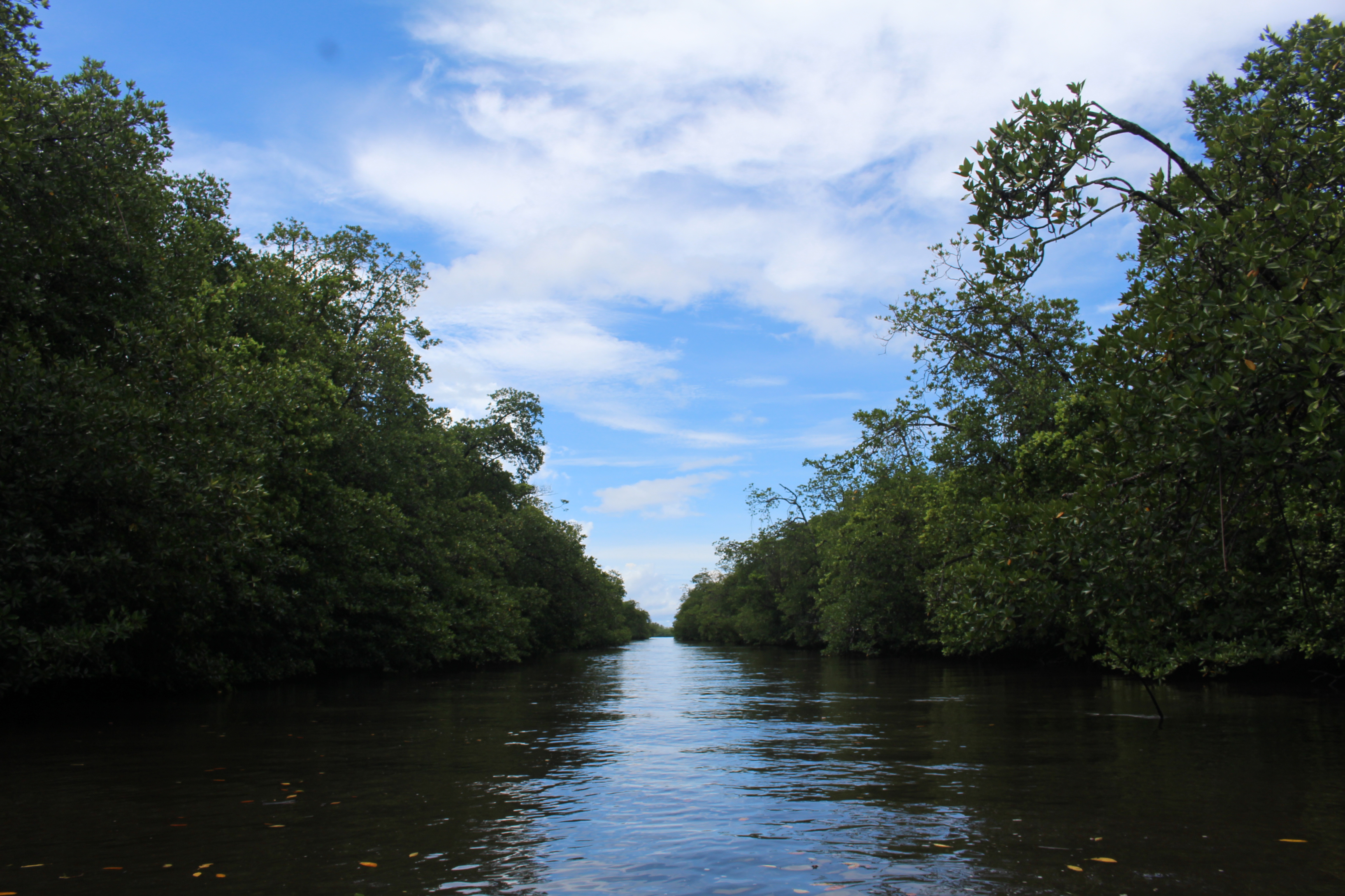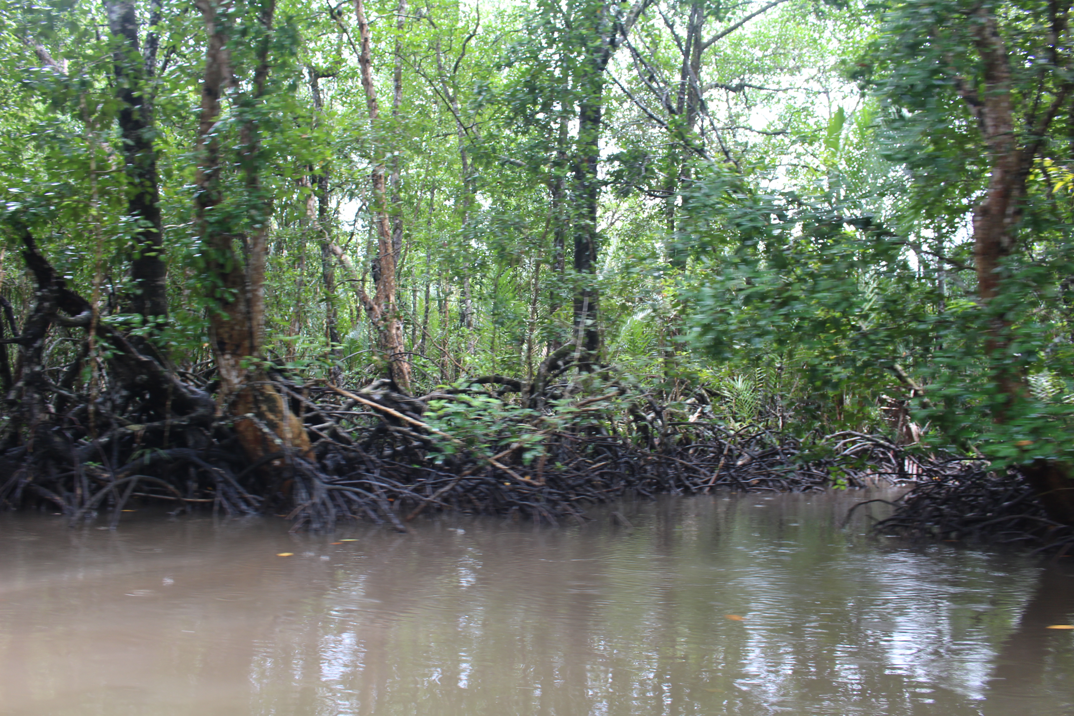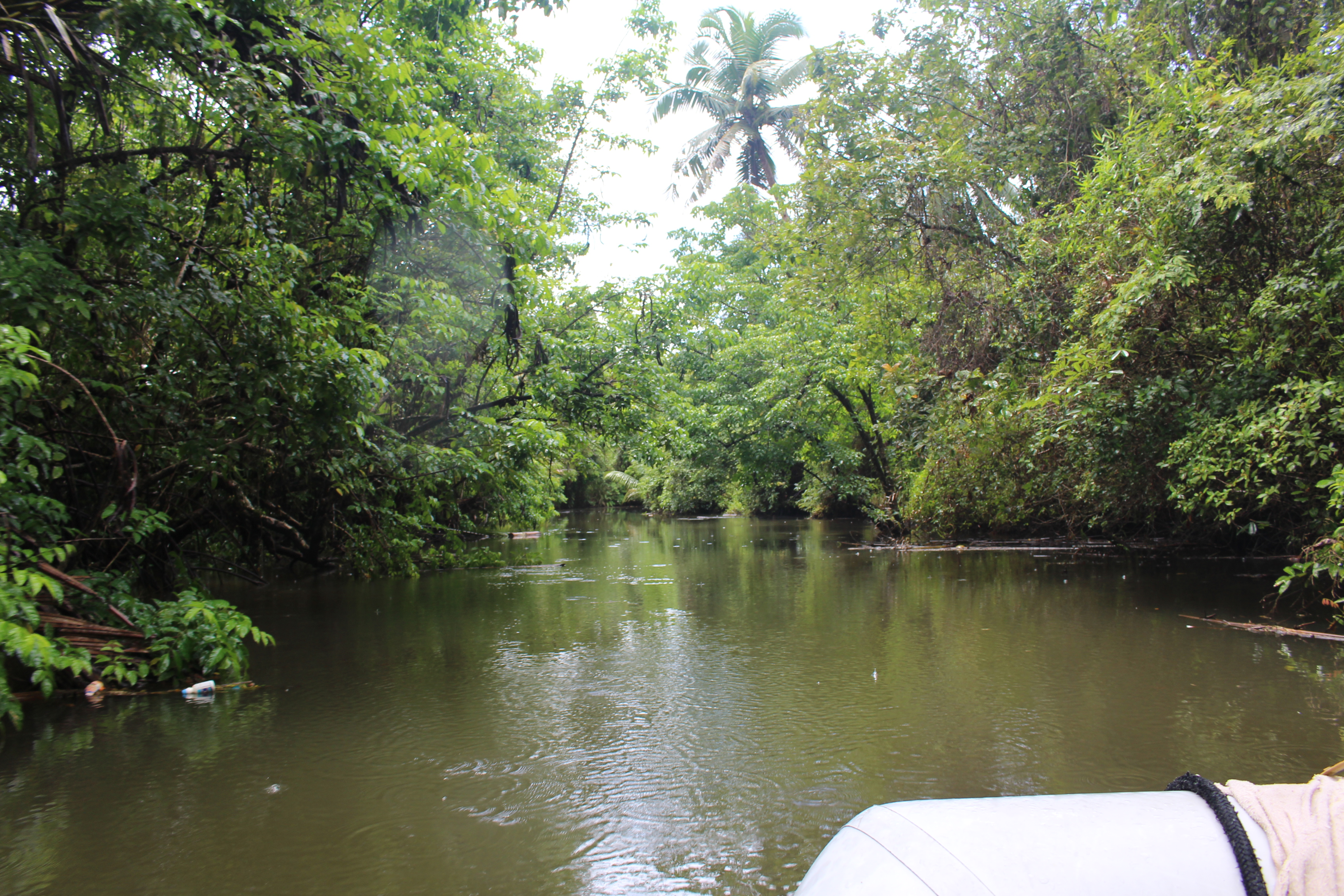 When the morning rain subsided, we decided to try for the village. But first we had to find the mouth of the river — hidden among the mangroves. We found an opening, but we didn’t know if the three paths had separate mouths, or if we would encounter forks upstream. In any case, upstream we went. After maybe a mile we passed a boat coming down. The men aboard smiled and pointed upstream, so we judged we were on a good path. In another half mile there was a fork, so we stayed right, even though the larger flow seemed to be left.