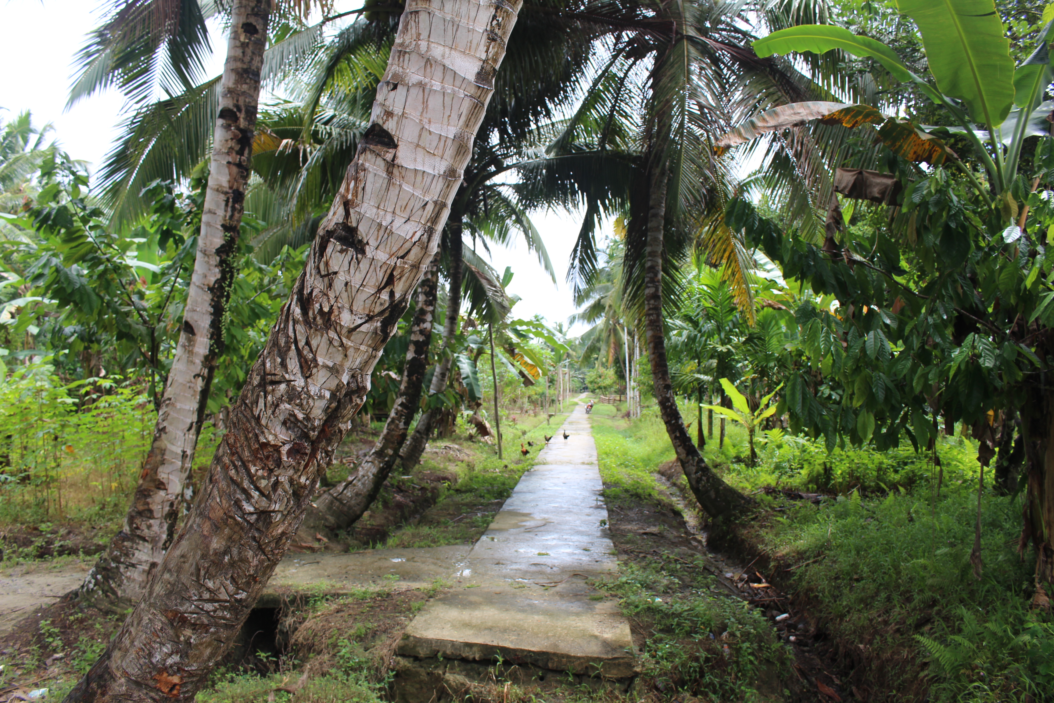 We had read that the Mentawai were “semi-nomadic” but that much seems to have changed, as they have well built houses and other signs of permanence. They grow bananas and coconut and cacao and some things we couldn’t identify. We saw some people carrying big bags of copra out of the jungle, probably bound for the ferry as a cash crop. Lots of chickens roaming around. Wires for electricity, but the only satellite dish we saw was at the “tavern.” Kids had book bags, and were clearly coming home from school in the rain. There were a couple motorbikes (even though no road, per se), a couple bicycles, someone had earbuds listening to music. But the signs of modernity were very limited. Funny how it seems that those with the least are the happiest and friendliest…
