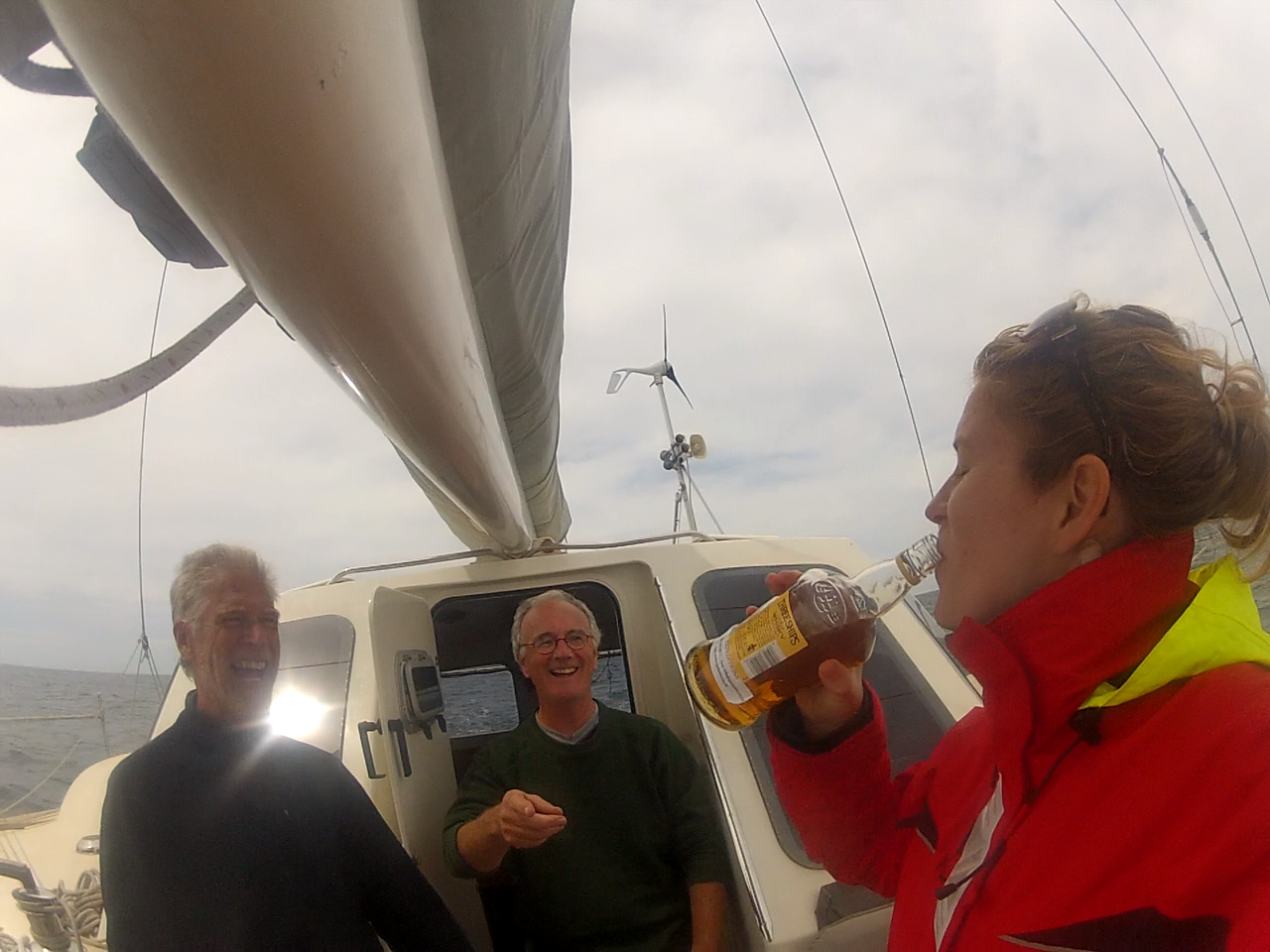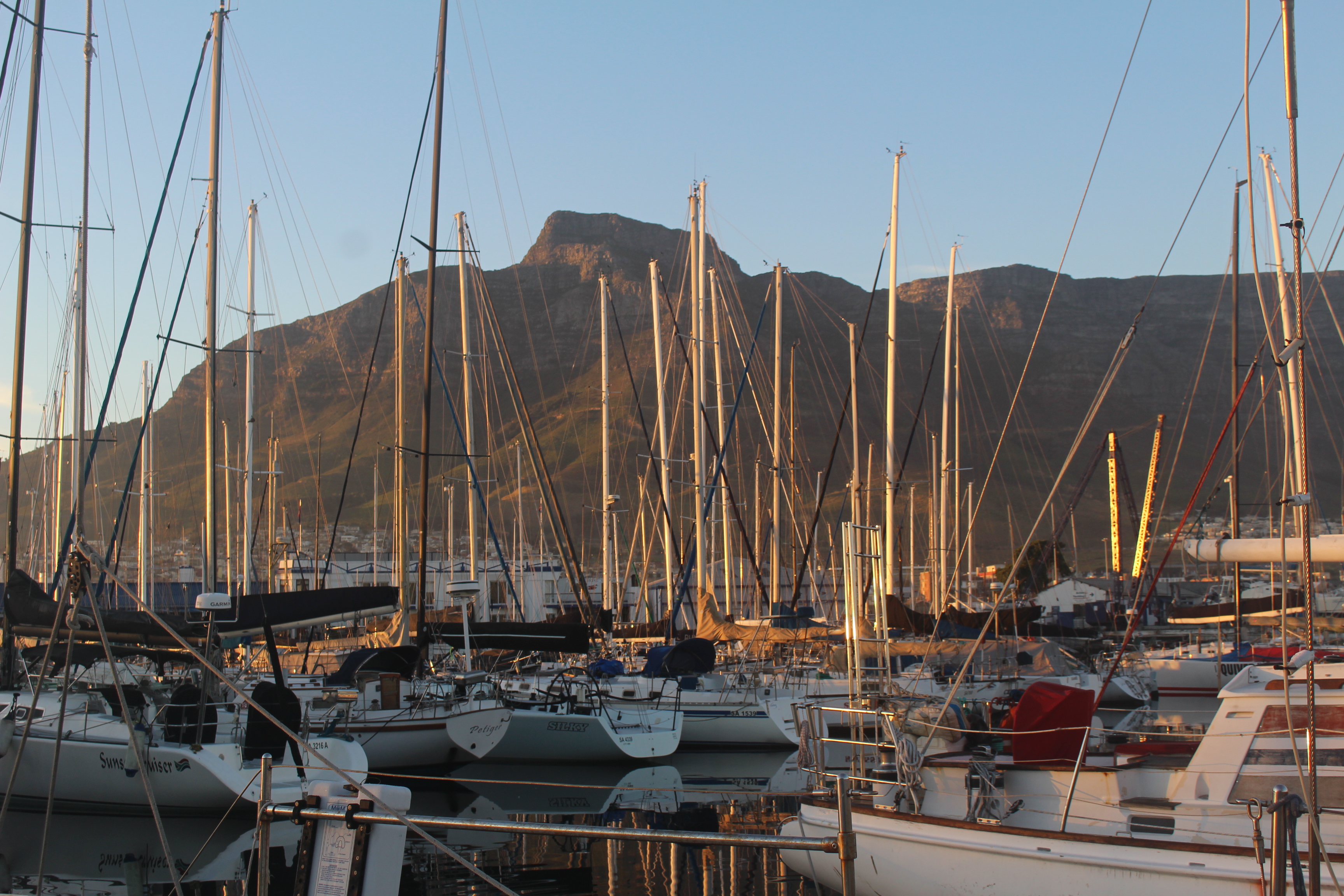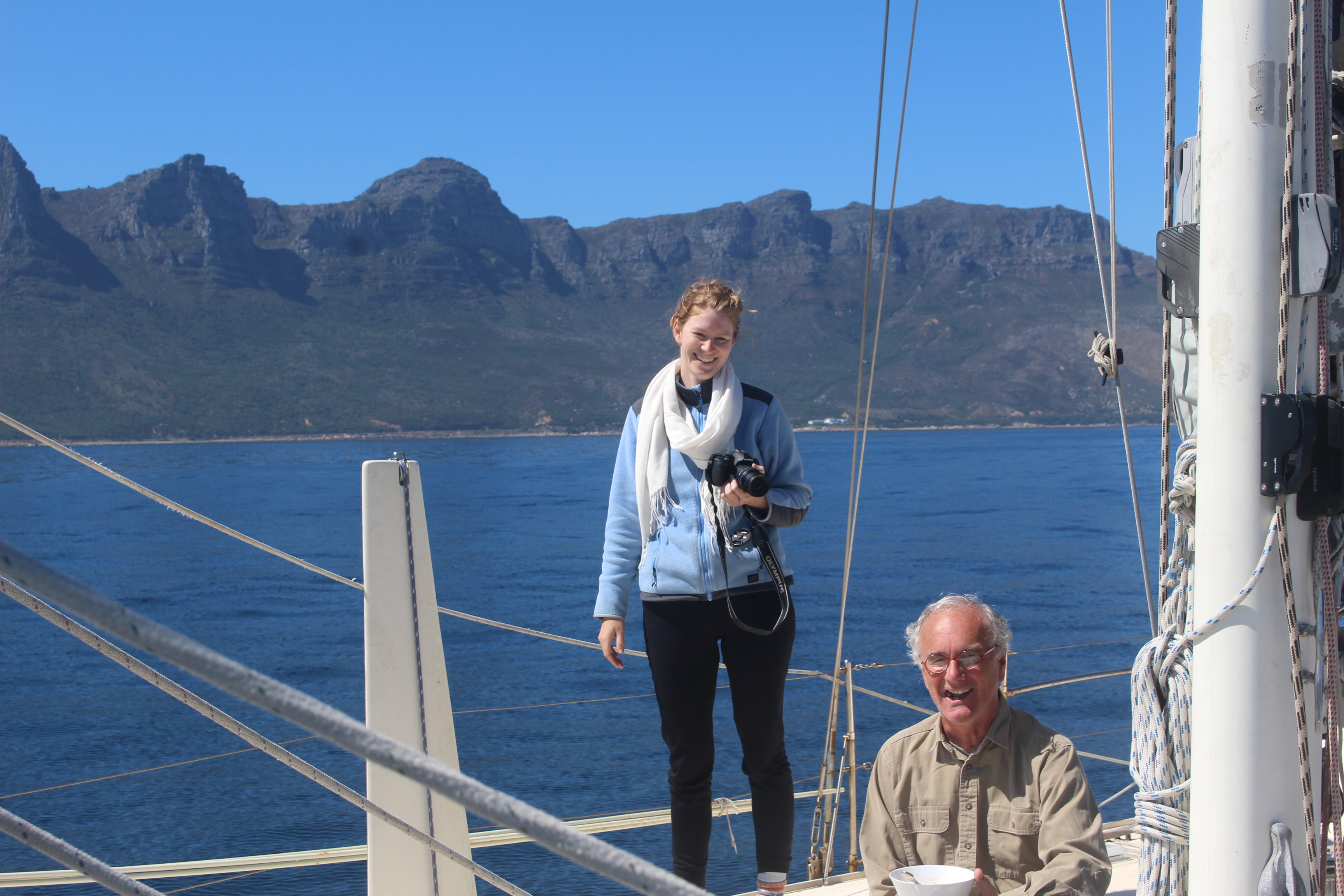 Long story short: here we are comfortably berthed at the Royal Cape Yacht Club. We were very, very lucky getting in here. Our reluctant starboard engine quit, but we arrived amid a rare occurrence…almost no wind…so we could maneuver in on one engine.Ceremonial tot off of Cape Agulhas, courtesy of Nora’s GoPro.And a tot for the sea(s). Indian Ocean on the right; Atlantic on the left!Yet another whale-in-the-distance photo. Tahawus reported a whale within 50 feet of their boat, but we had no such heart-stopping excitement.Plenty of seals as we neared Cape Town. They like to hold their flippers up in the air. It looks like they are soaking up the sunshine, but I read online they do it to cool themselves; I dunno.Nice sailing into a nice night.And the crew is feeling good!Table Mountain coming into view.