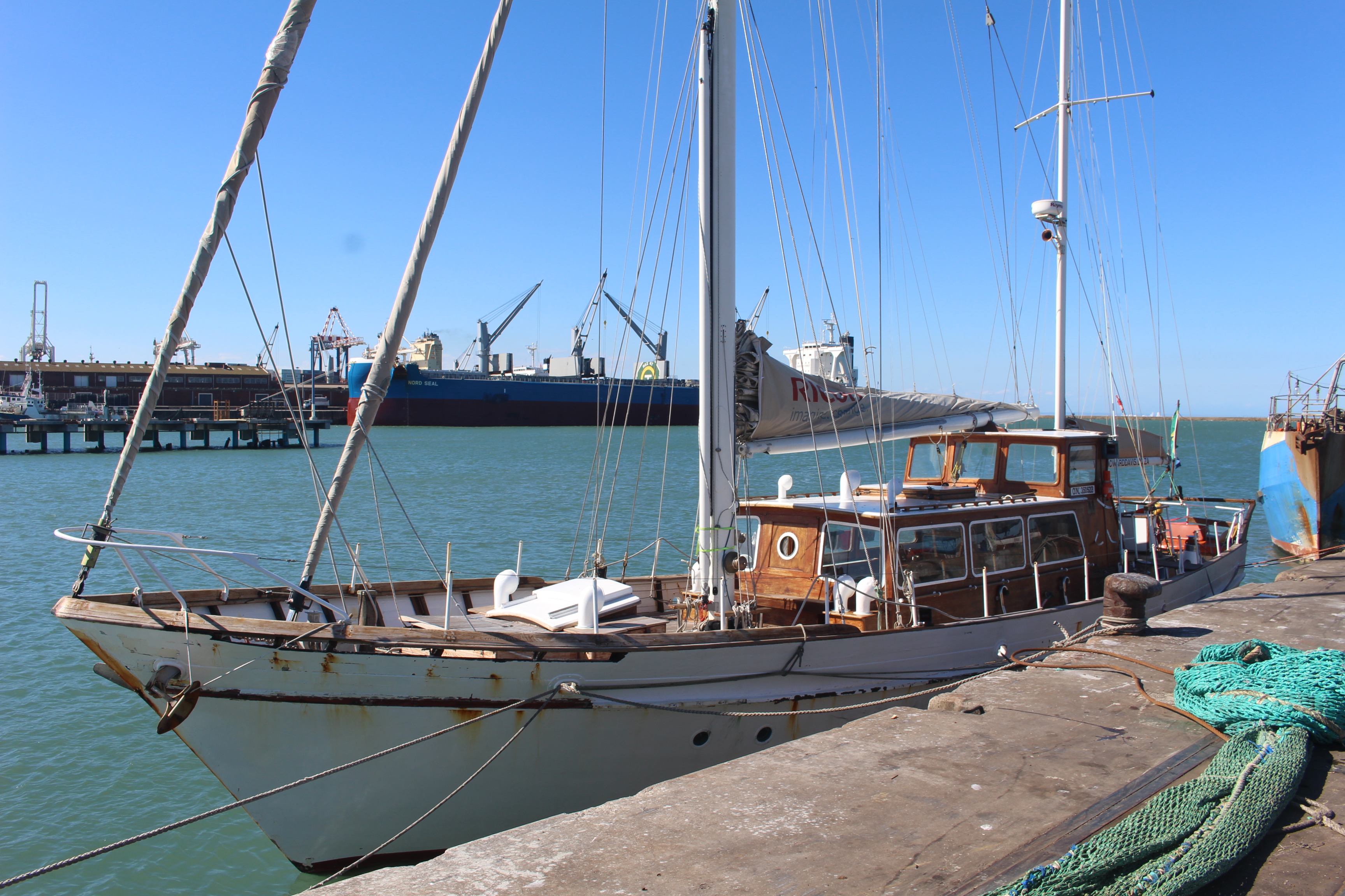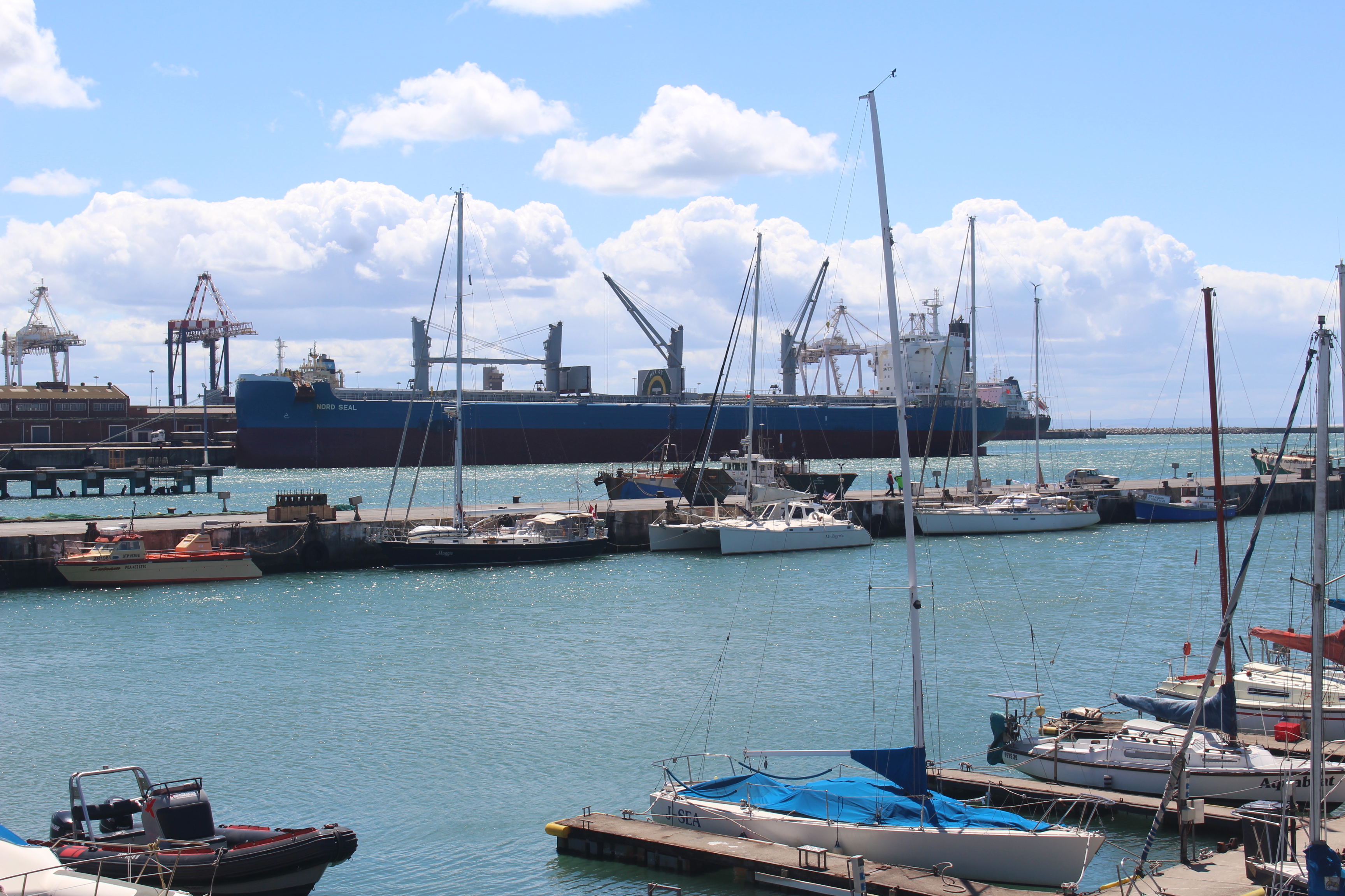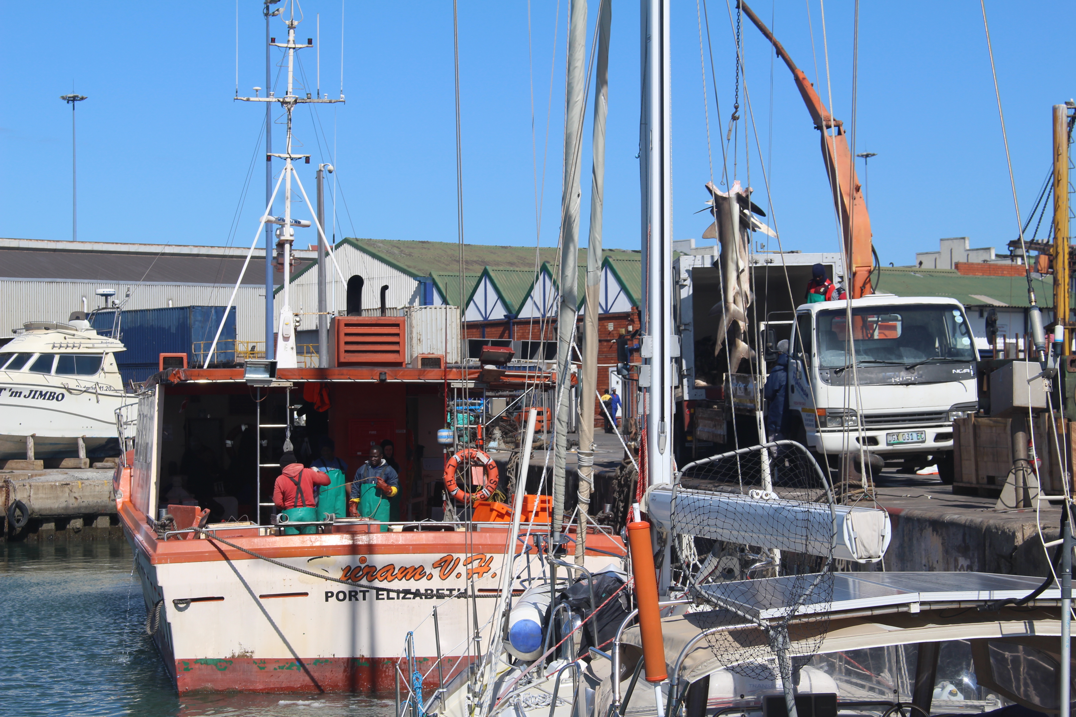 We’ve been in Port Elizabeth for a week. Aside from a day of exploring, and some tasks on the boat, and of course hot showers and good meals at the yacht club, our focus has mostly been on the weather. It looked like we had a window for Cape Town, but that window closed as it got closer. We remain tied to the fisheries pier. We are lucky, we are told, that the fleet is out, or there would be no space for us. I think the successful fishing boats are starting to come in, though. A big one came in last night, and the pier came alive with workers shouting and trucks and horns and a general cacophony. This morning there is a smaller boat in, unloading big sharks.
