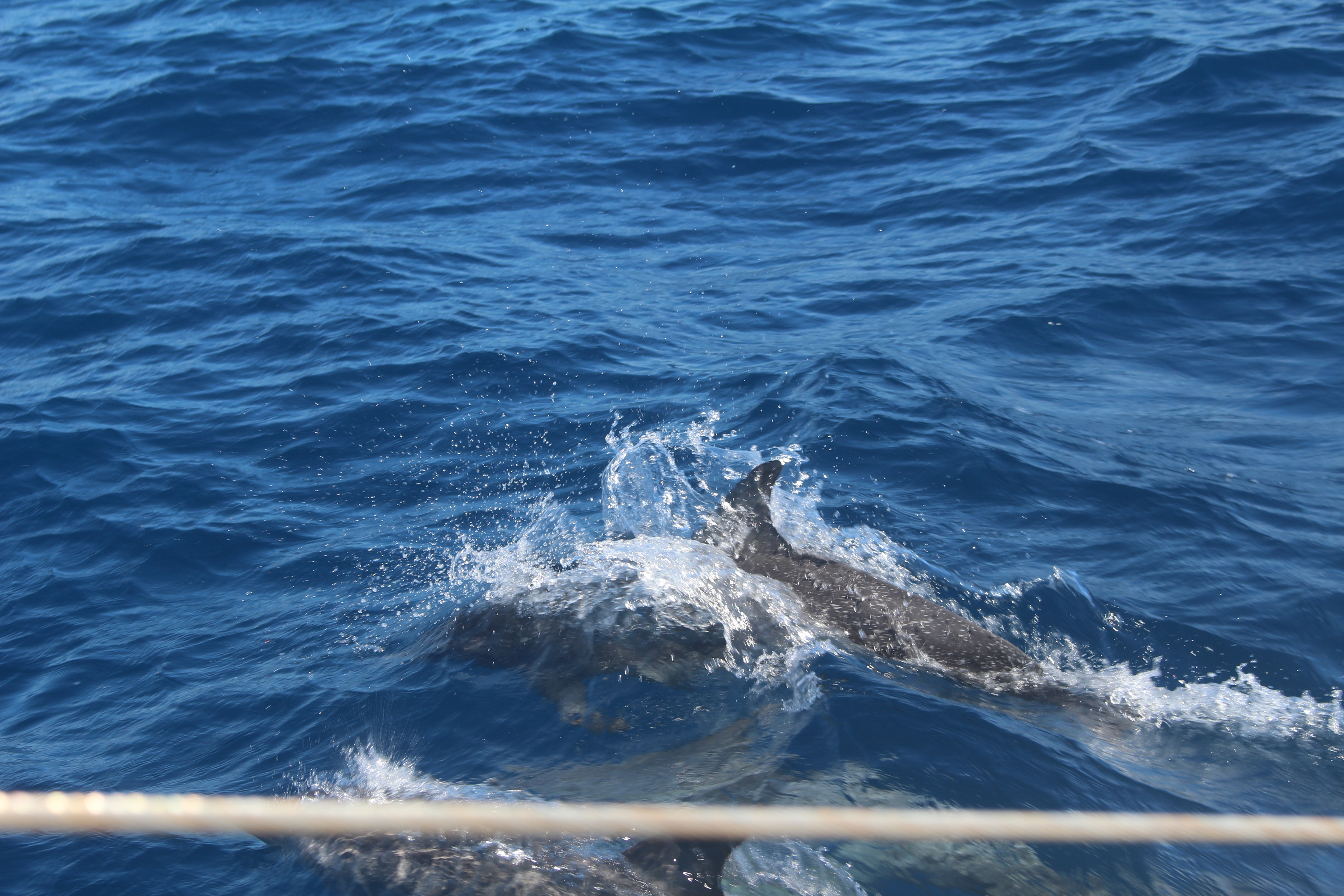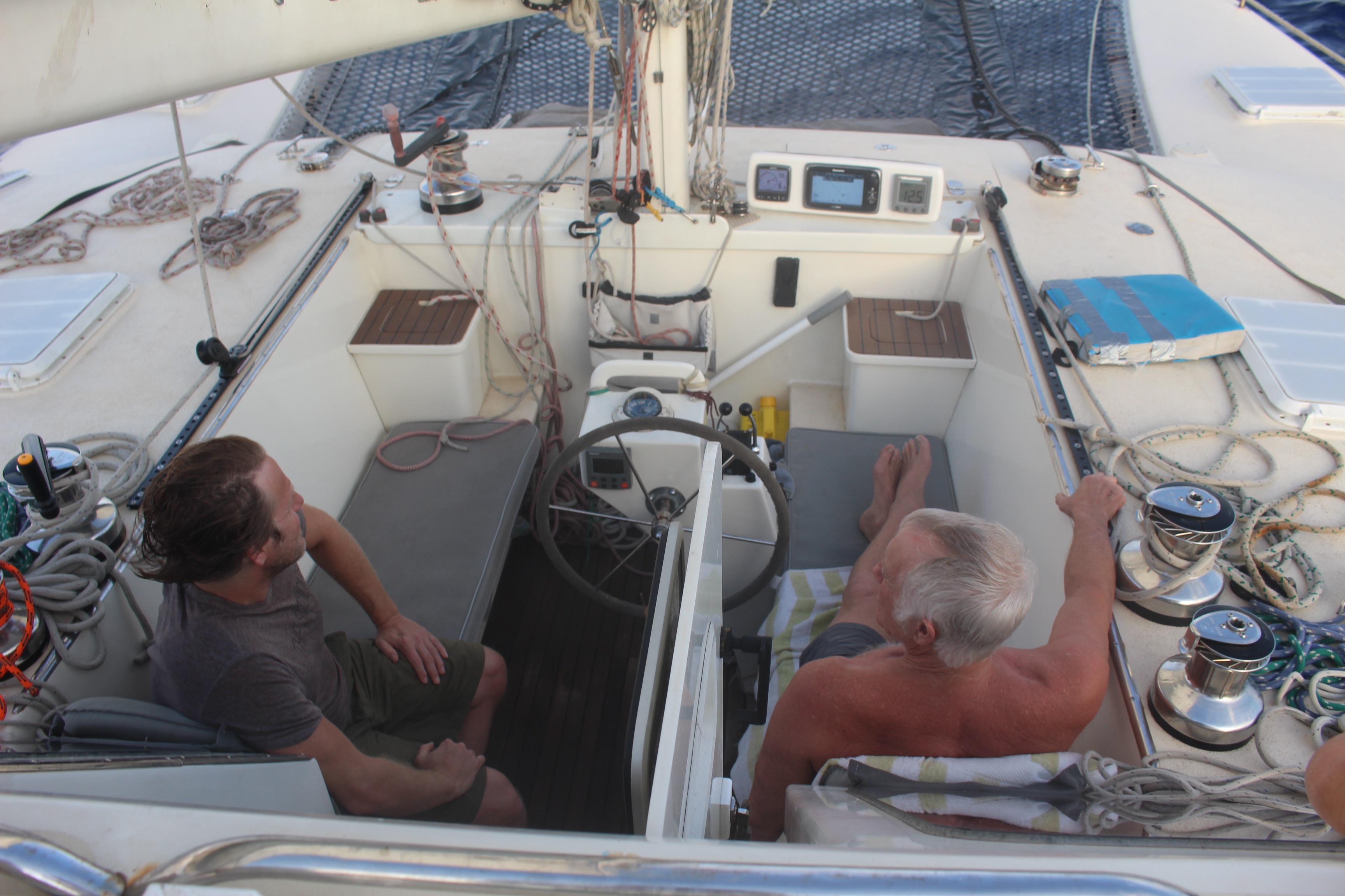 I tumble out of bed and pull on a bathing suit, the most comfortable outfit in the heat. Tim and Josh are in the cockpit talking. I check the chart plotter to see if we are on our desired course, and are there any ships approaching. After a brief “Good morning!” Tim says we should set the spinnaker. The wind has come aft again; the jib is at times backwinded by the mainsail. It takes us 45 minutes to furl the jib, drop the main, rig the spinnaker sheets, set the spinnaker and get all the lines squared away.