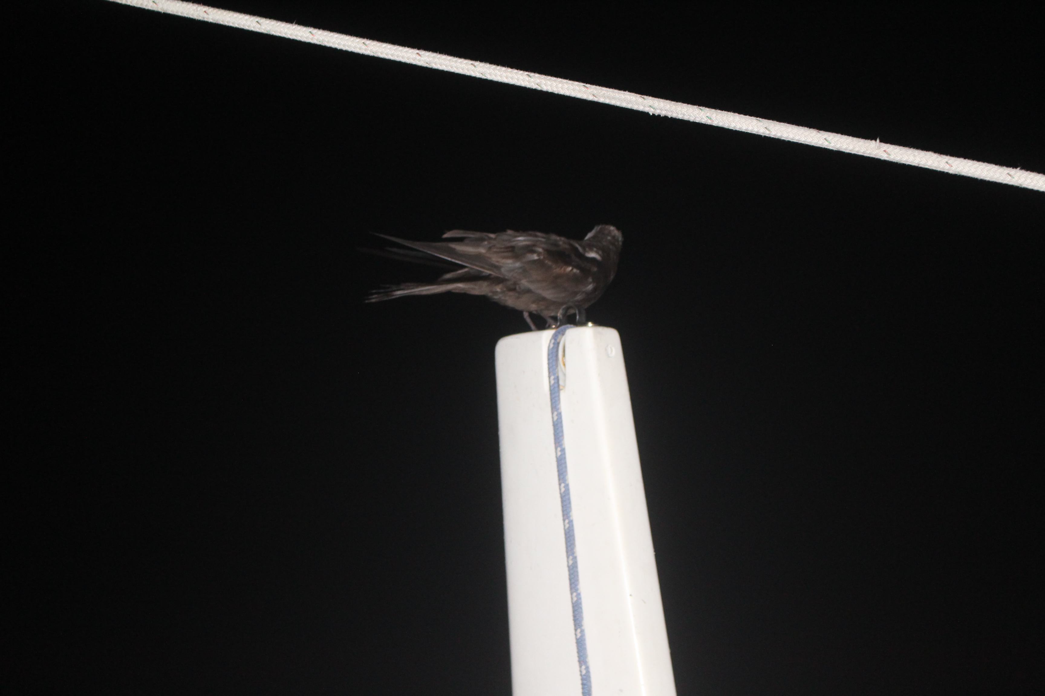 At twilight some ugly dark clouds appear to windward. We discuss whether or not to dowse the spinnaker. Tim says yes; I hesitate because no squalls so far have “packed a punch.” But this one is more threatening than any we’ve seen, and in the interest of sleeping well, I agree with Tim. Just as we are bringing it down the wind increases. We get the sail stowed as gusts rise to 30 knots. I’m very happy that we got it down! But of course 15 minutes later the wind is back under 20, okay for the spinnaker, and before long it is down to 14. No matter, where there is one squall there’s likely more, so the spinnaker stays down and we double reef the mainsail for the night.