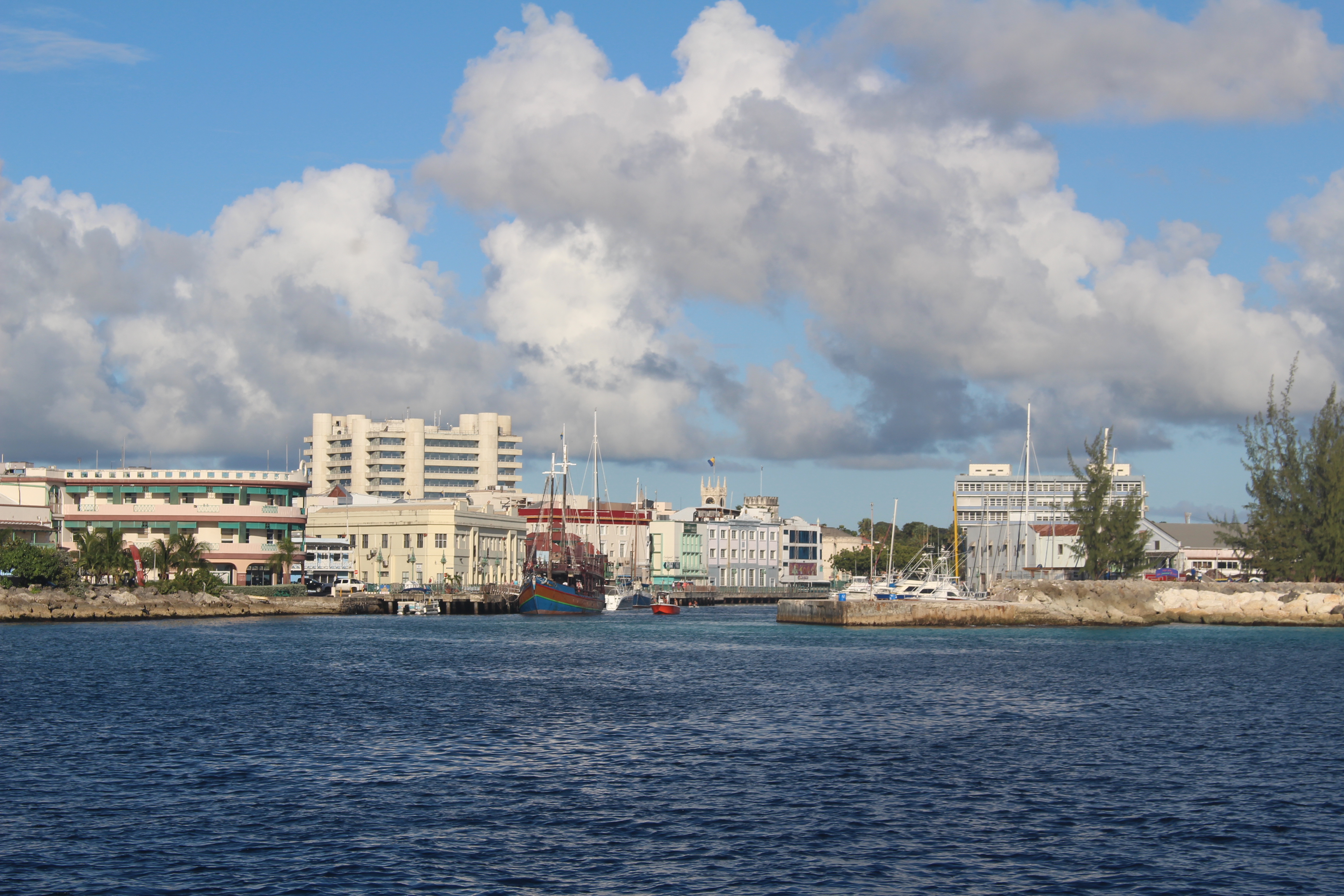 Another interesting thing happened yesterday afternoon. We saw a 177-foot military-style vessel steaming the other way. But it changed course to head very close to us. I listened on the radio, expecting them to call and “interrogate” us. They did get on the radio, but they were talking with another nearby ship. Still, they were circling up behind us, so I decided to call them and ask what their intentions were. They explained in broken English that they were on a military exercise, looking for a white boat with two {something I couldn’t make out}. Had we seen such a vessel? I replied that I wasn’t clear what size vessel they were looking for. Their response was to take this as a “No.” They thanked us and steamed away, to my relief. But two minutes later they hailed us again, asking where we are registered, where bound, where from. I braced myself for more, but that’s all they wanted, and we were done with our encounter.
