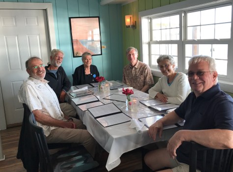 Then on to Beaufort, NC, where we stayed in the fancy/expensive marina right in the historic heart of town. And where my distant cousin Emily, whom I had never met, came to visit, along with husband Bob, my sister Nancy and her husband Frank. They all treated the crew to a superb dinner — much appreciated! I could easily have stayed a while in Beaufort, and taken Bob up on his offers to show us more by land or sea. But we were on a mission, so off we went in the morning, on up the ICW to Pamlico Sound. We had the current with us through the narrow channel, and the wind with us once we got into the open water, so we made great time.