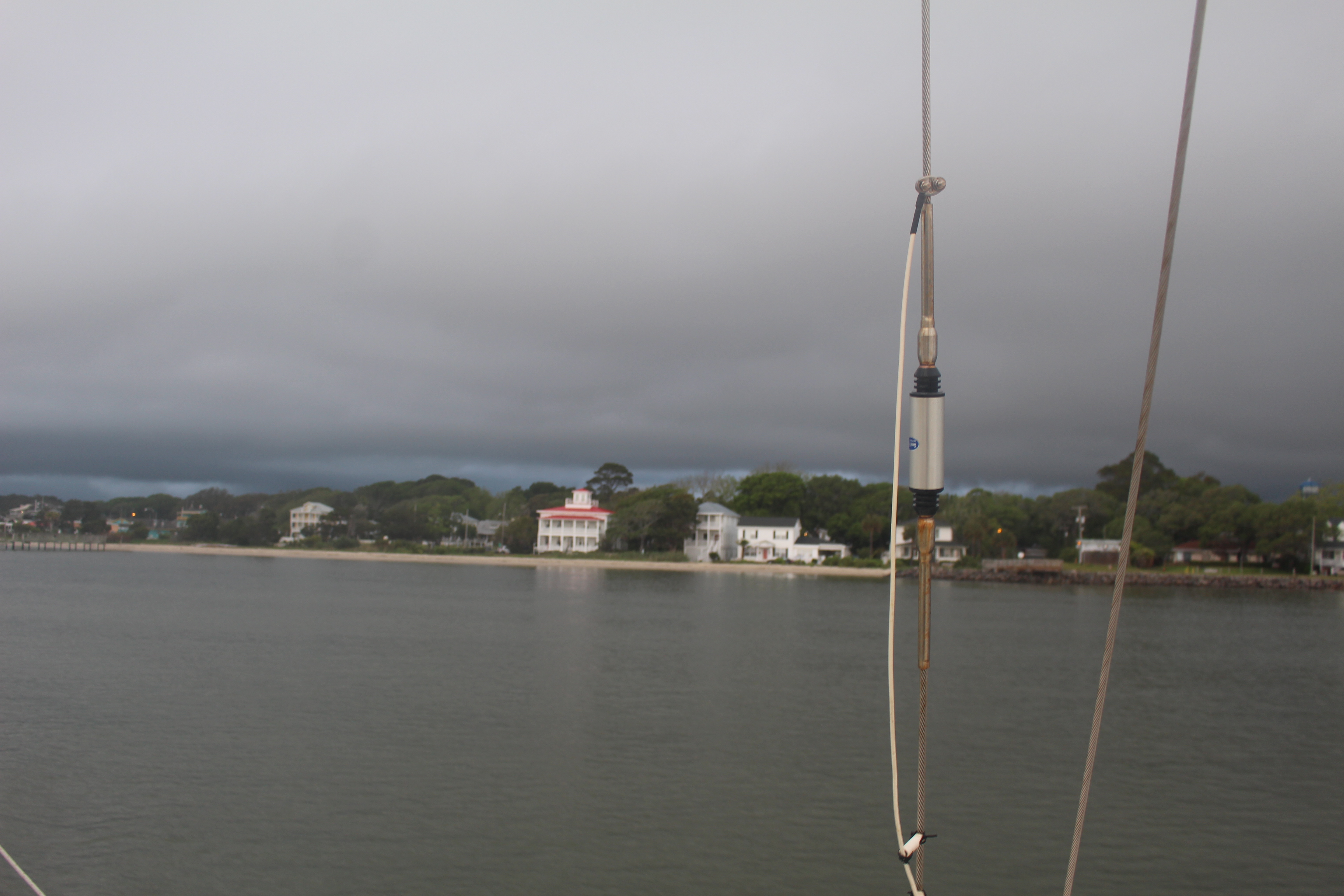 But first we had to get here. In Southport we had a fun dinner with Pip, who had sailed aboard Ransom in the BPO to French Polynesia. Then up the Intracoastal Waterway to Wrightsville, where we anchored for two nights to let some stormy weather pass over. Lots of reading for two days. Then on up the ICW to Swansboro. We anchored there, but dragged in the shifting current, so we tied at the town dock. That worked out well for getting groceries and for doing some cleaning of the side of the hull alongside the dock.
