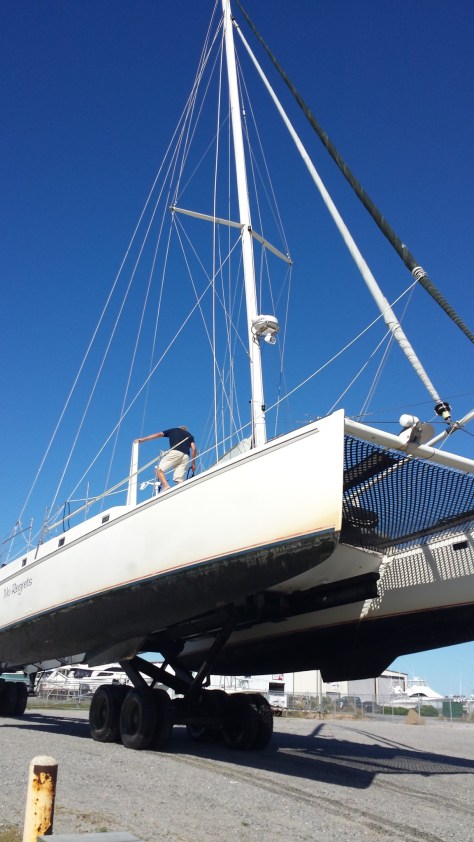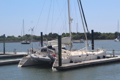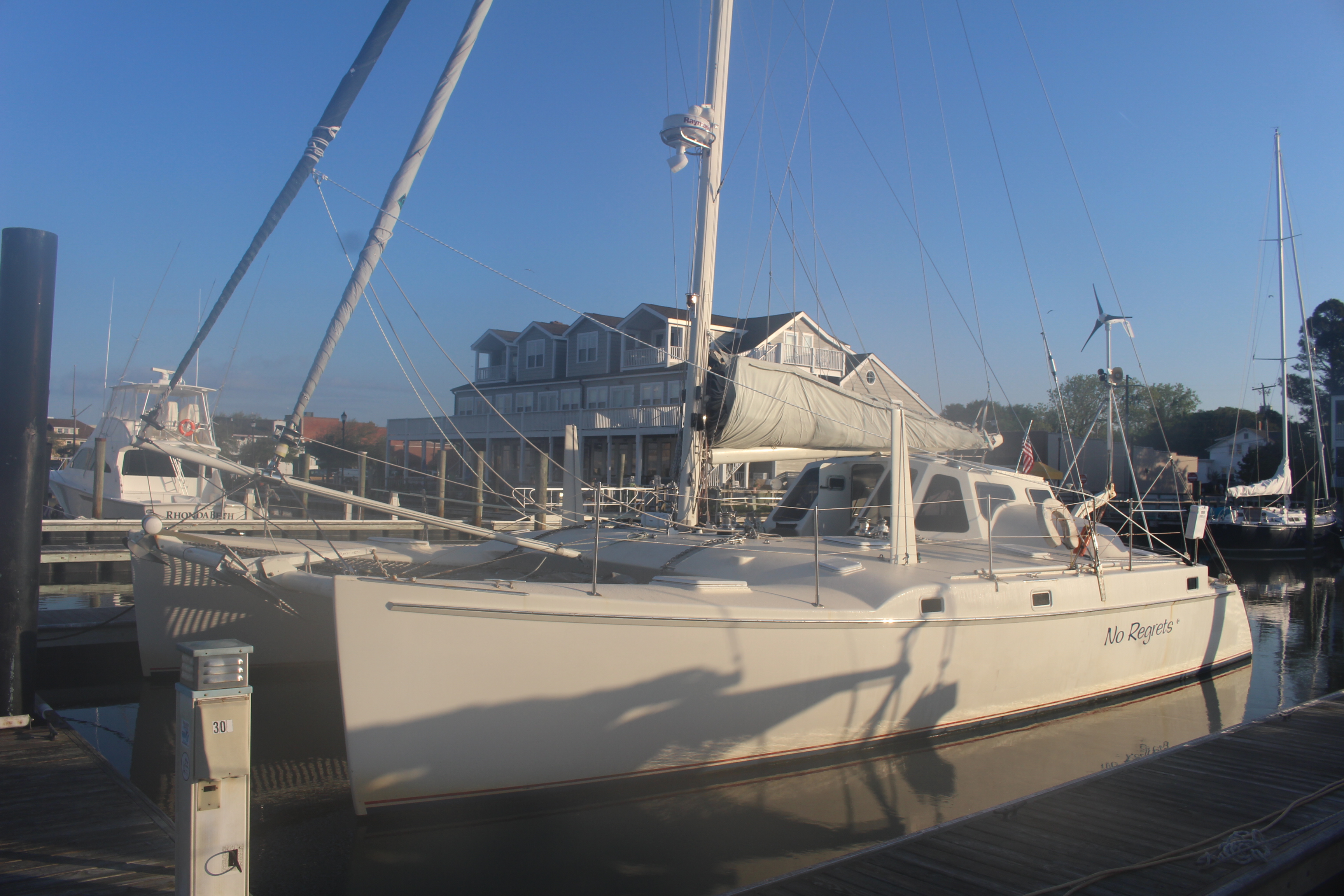 And…there is a sweet little trimaran parked right next to No Regrets. I wonder if she might be for sale………..