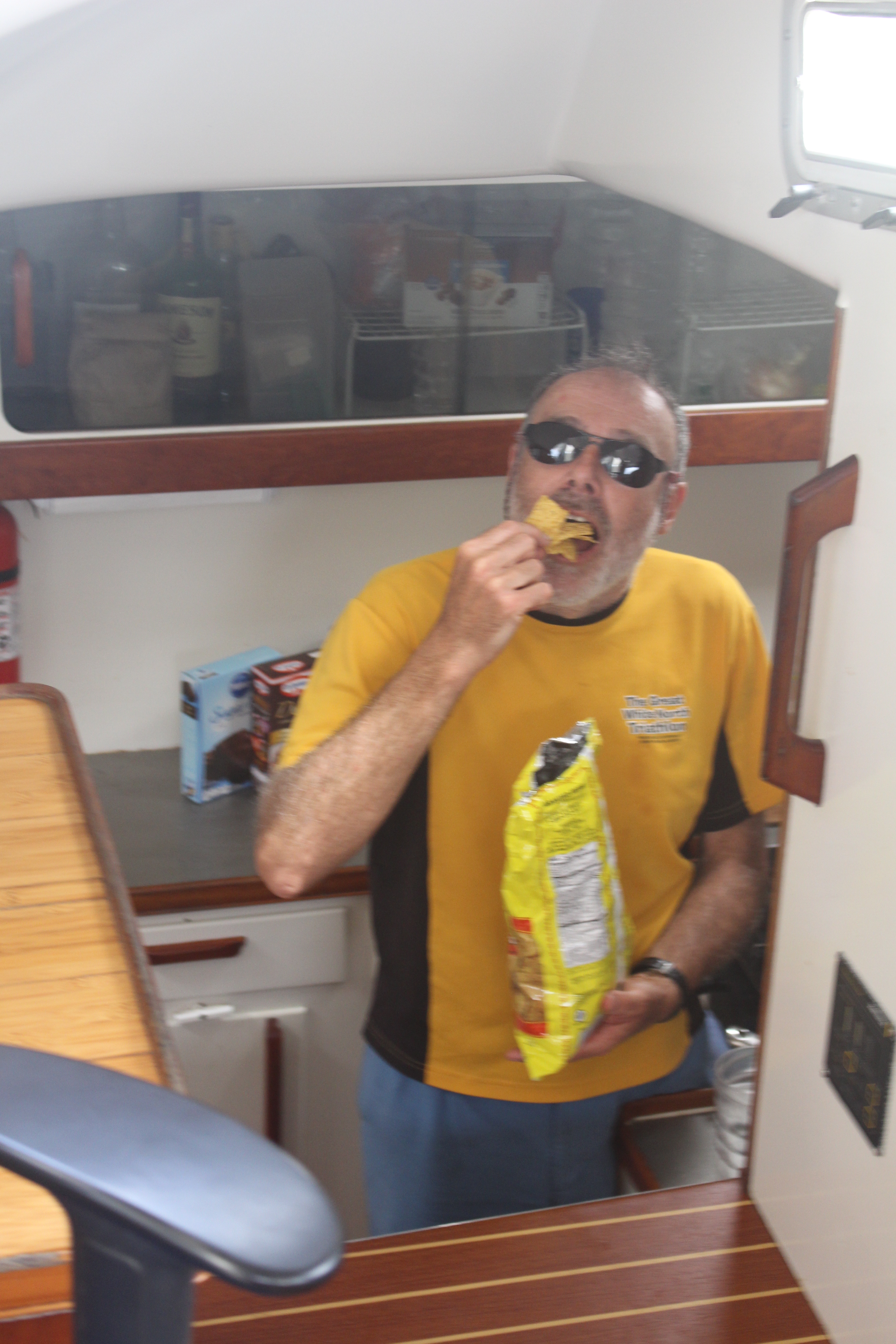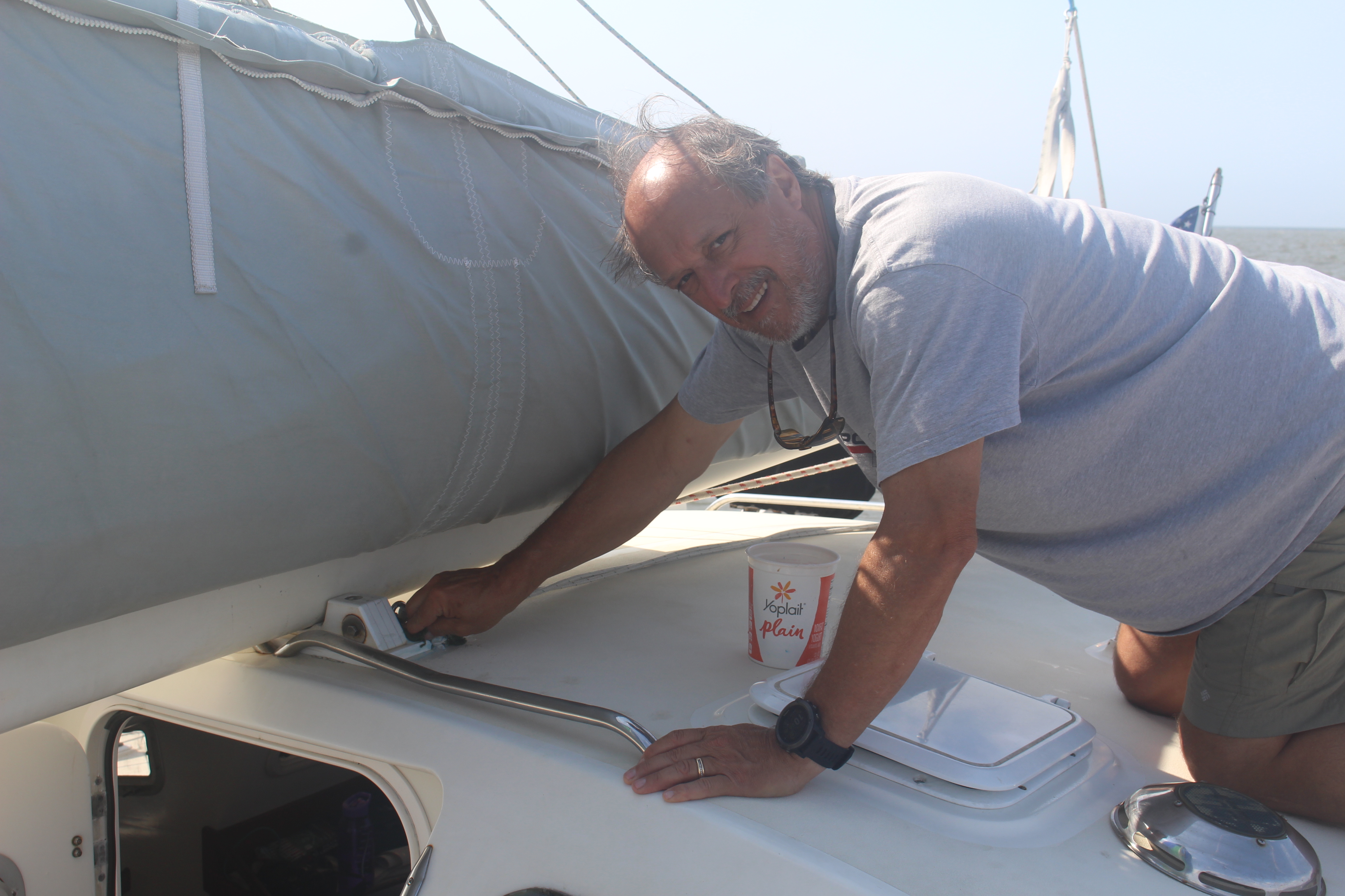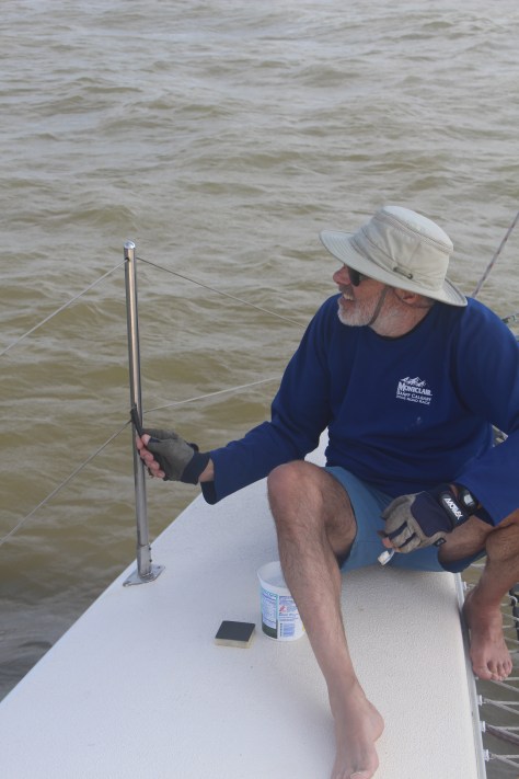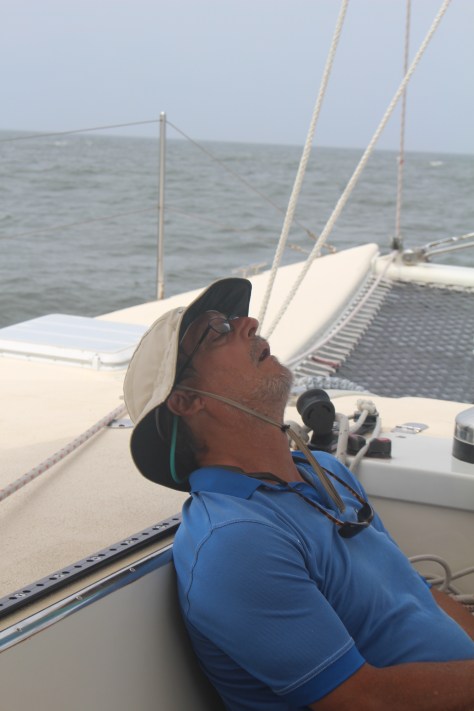 Pamlico Sound anchorage #2Maybe Joe is watching the spinnaker, but I think he’s dozing off…Meanwhile Bob is foragingNo surprise that the crew is tired and hungry; they’ve been working hard polishing the stainless steel, and other cleaning to try to get the boat ready to show to potential buyers.