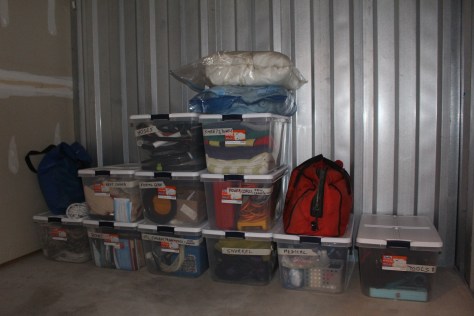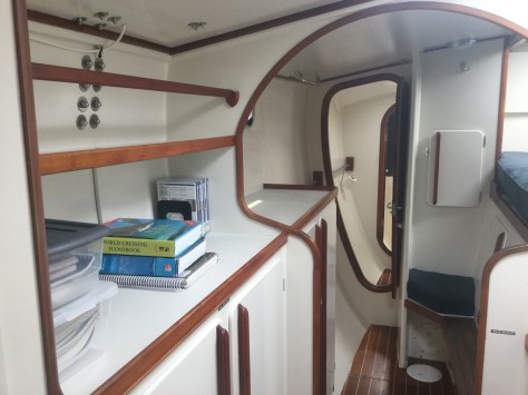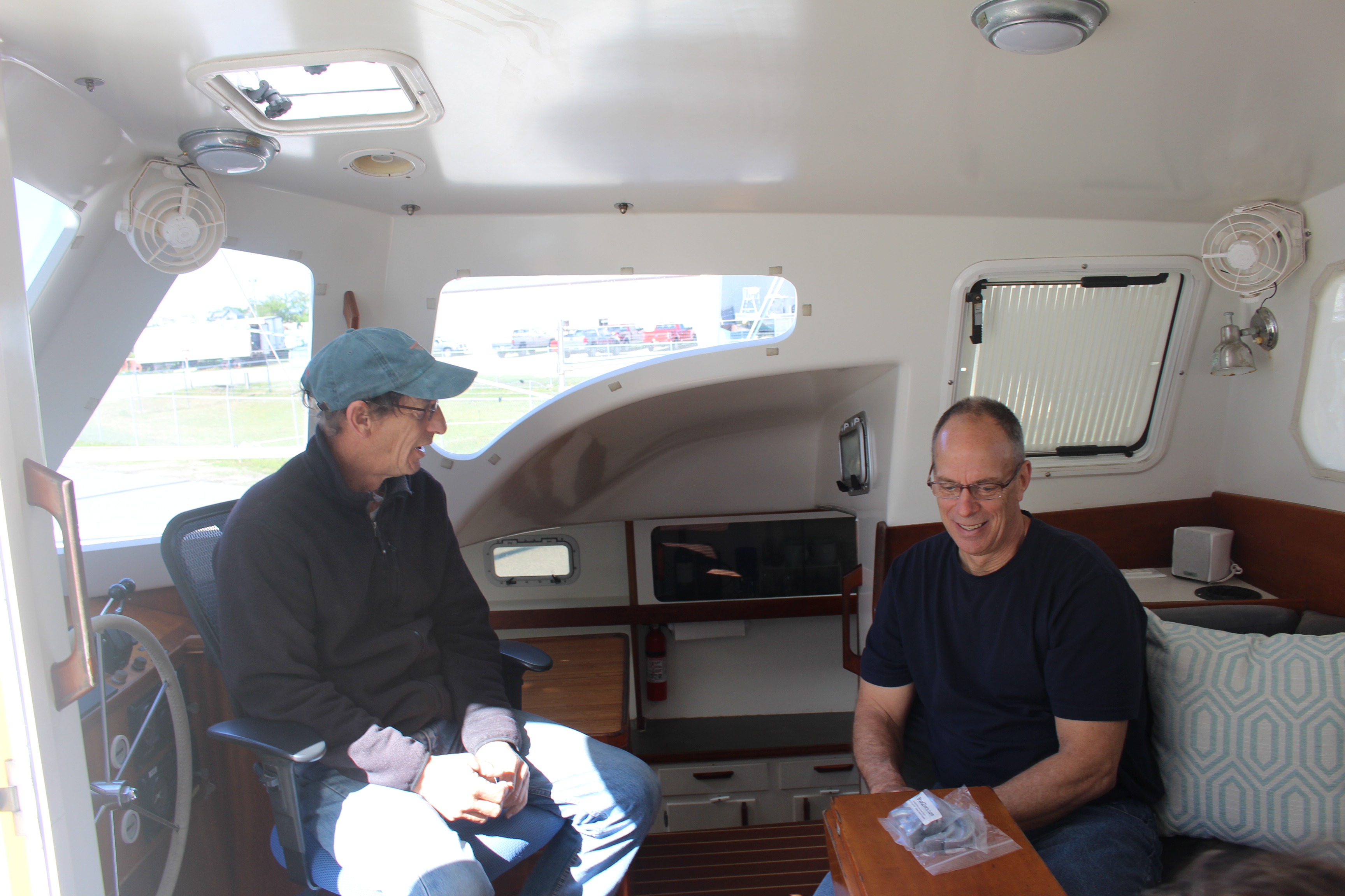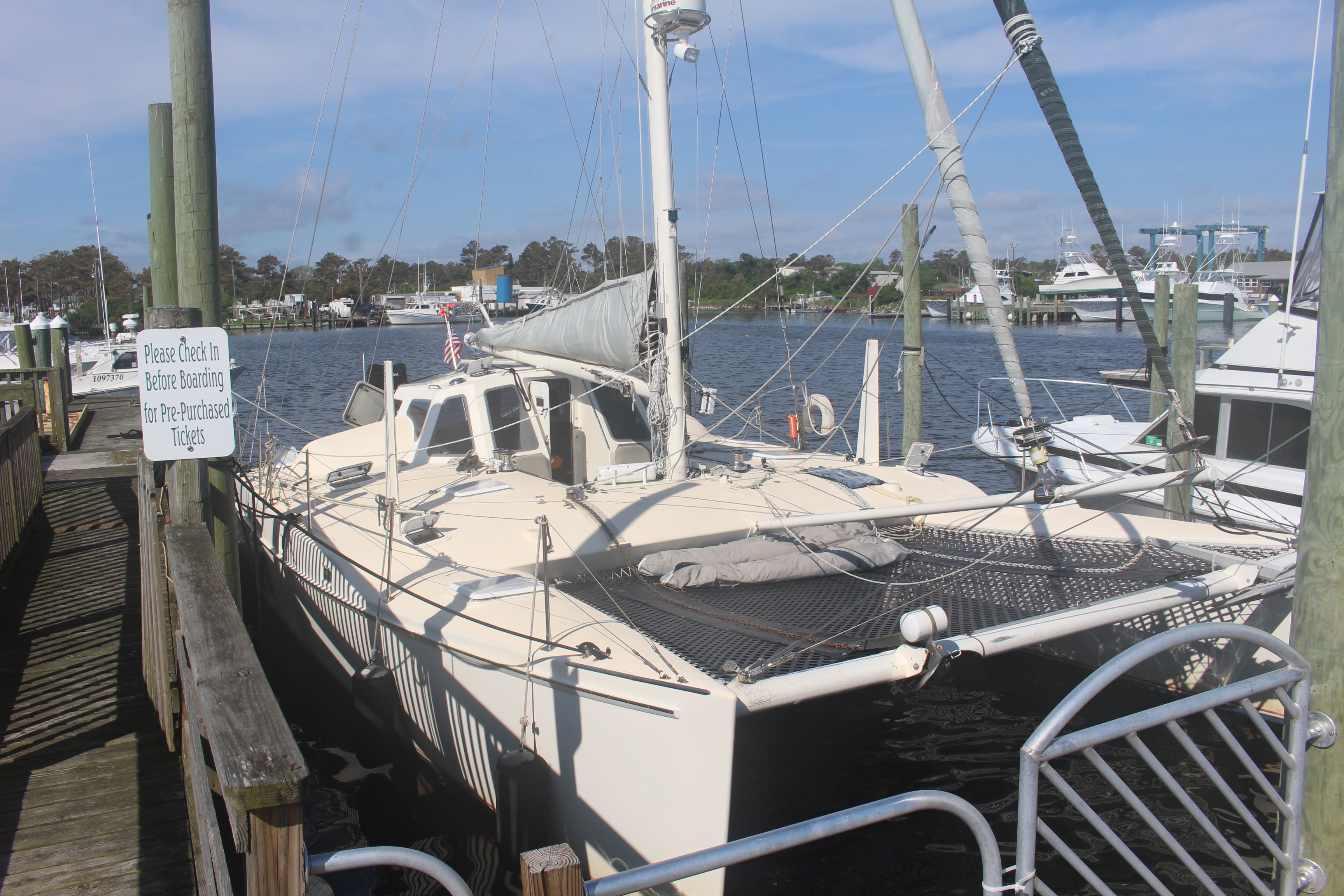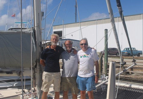 A good start on offloading the “boat stuff” to a storage unit.Leaving things neat and clean aboard.You never know what you might find hidden behind the gear under a cockpit seat!John (builder) talks with Tom (buyer) about what can be done to make the boat like-new.Everybody happy — Zeke, Jane, John, Chris and Tom. Goodbye, No Regrets!The pretty little trimaran parked right next door, that caught my eye…Dreaming of more…
