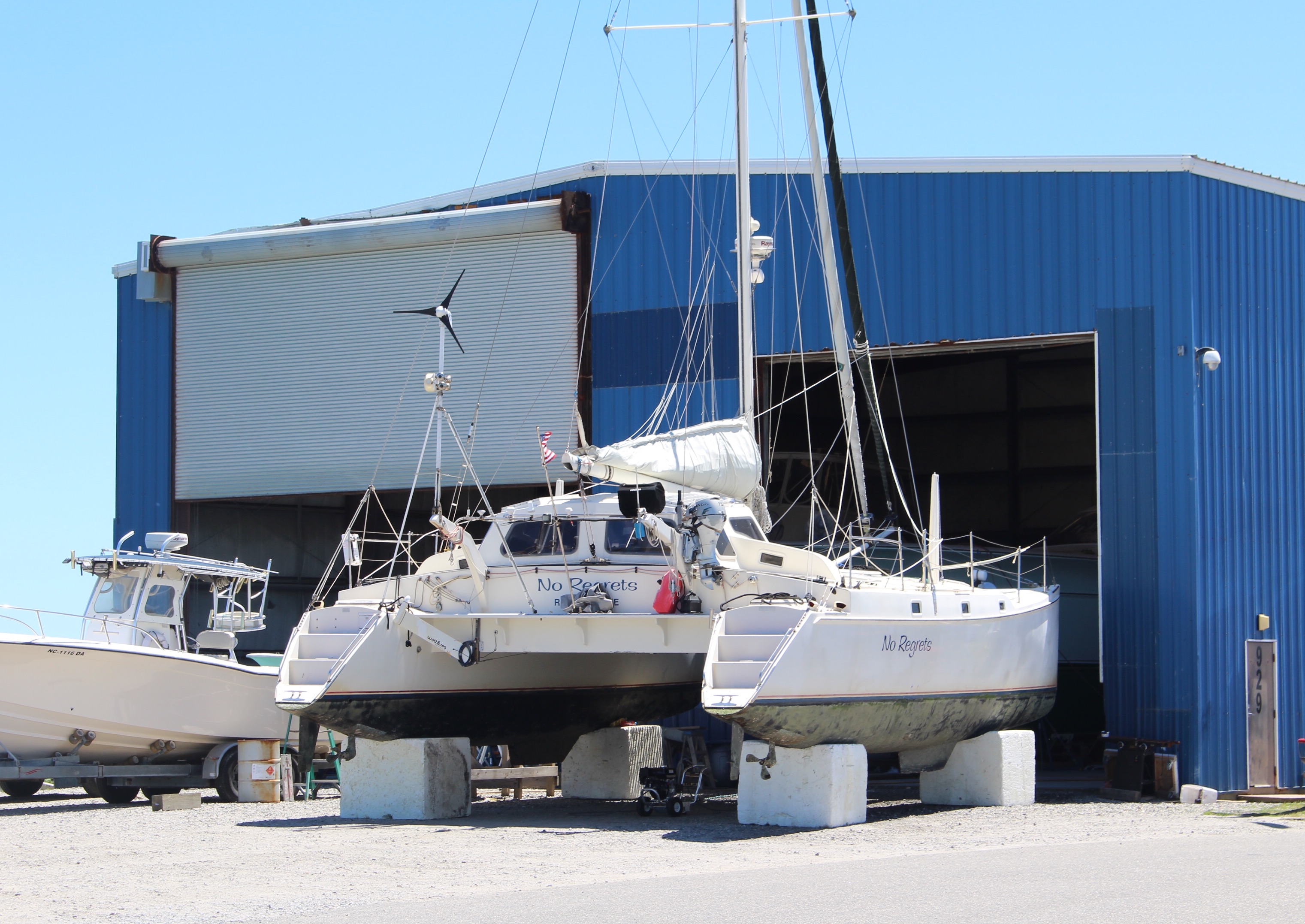 We chose to come to Wanchese (near the Outer Banks of North Carolina) because John Lombardi works here. John built No Regrets eighteen years ago. We thought he would be the perfect person to do the work needed on the boat. Might be fun for him, too, to see one of his creations many years later.