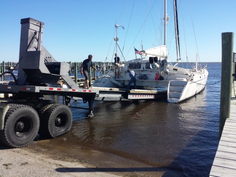 She cleans up pretty well!Approaching Roanoke IslandOBX Marina, Wanchese. One other sailboat in the neighborhood; hundreds of sport fishing boats.The happy Bahamas to NC crew.Getting into position to haul the boatUp, up……and away!