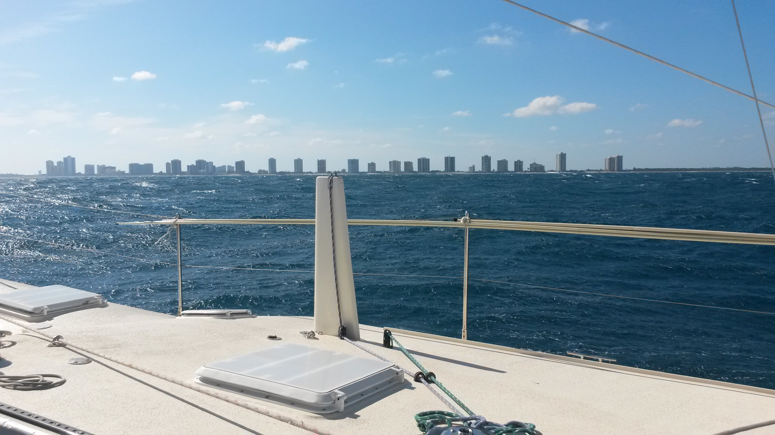 Sailing along the Florida coast south from St Augustine, we had one of the most delightful sailing days ever, and the forecast was for continued clear skies and 15-20 knot favorable winds. As the sun set we took down our spinnaker and sailed with the more easily controlled “screecher” (a big forward sail, that can be rolled up with minimal fuss if the wind gets too heavy).