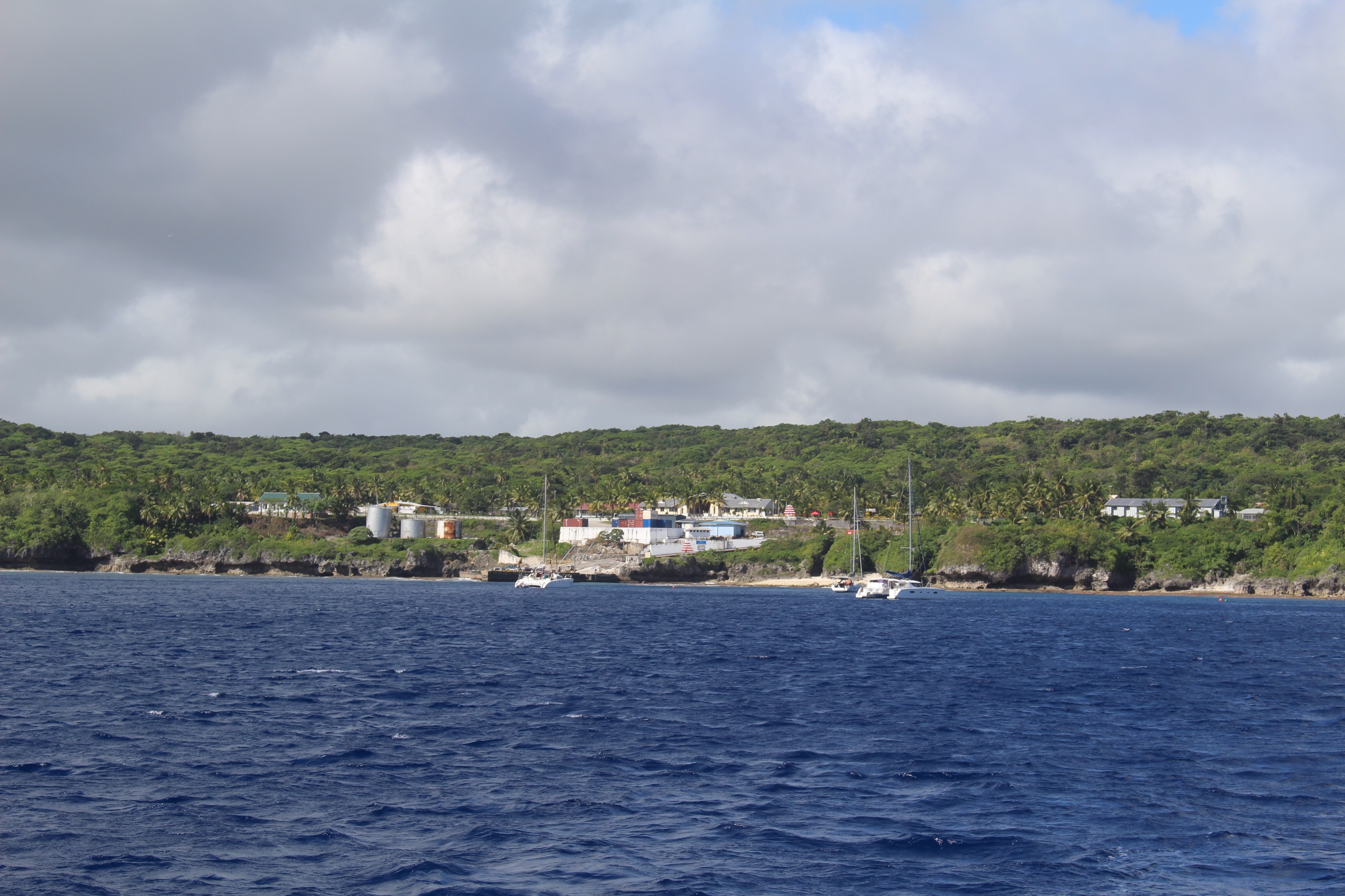 Two days from Niue to Vava’u — a group of some 60+ islands that comprise the northern part of The Kingdom of Tonga. Winds came up strong and the second half of the ride was uncomfortable, with occasional seas slamming under the bridge deck (beneath our feet, between the hulls) and against the side of the boat. We started out with our big spinnaker. At sunset we switched to the small one. Next day we switched to just the jib, trying to slow down so we wouldn’t arrive before daylight. During the second night the wind was blowing 30 knots, and even after rolling up half the jib we were still making six knots.
