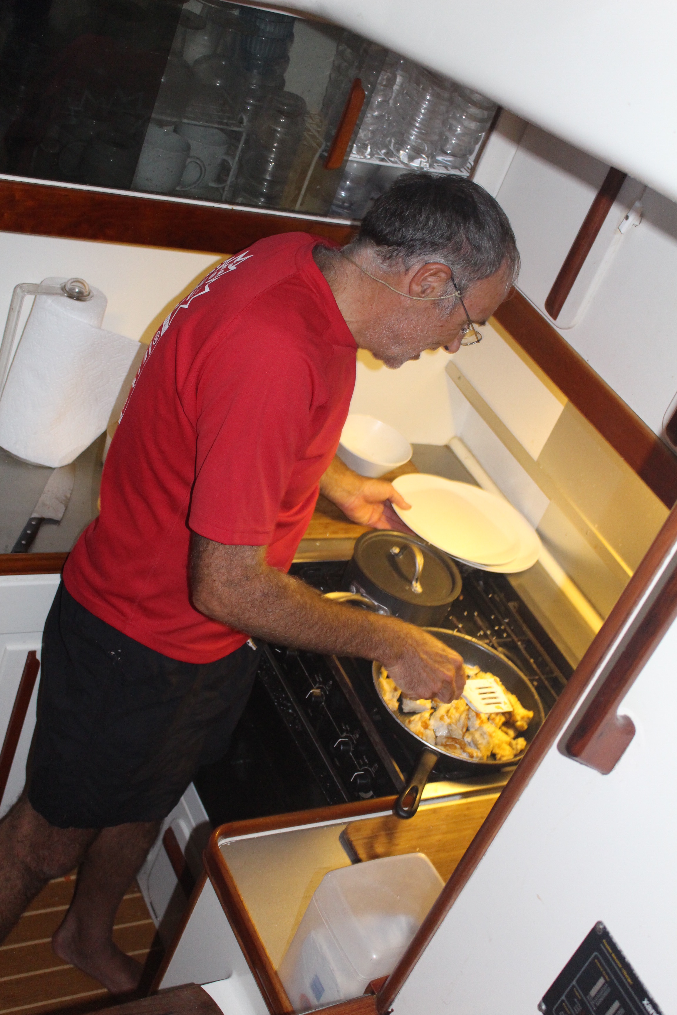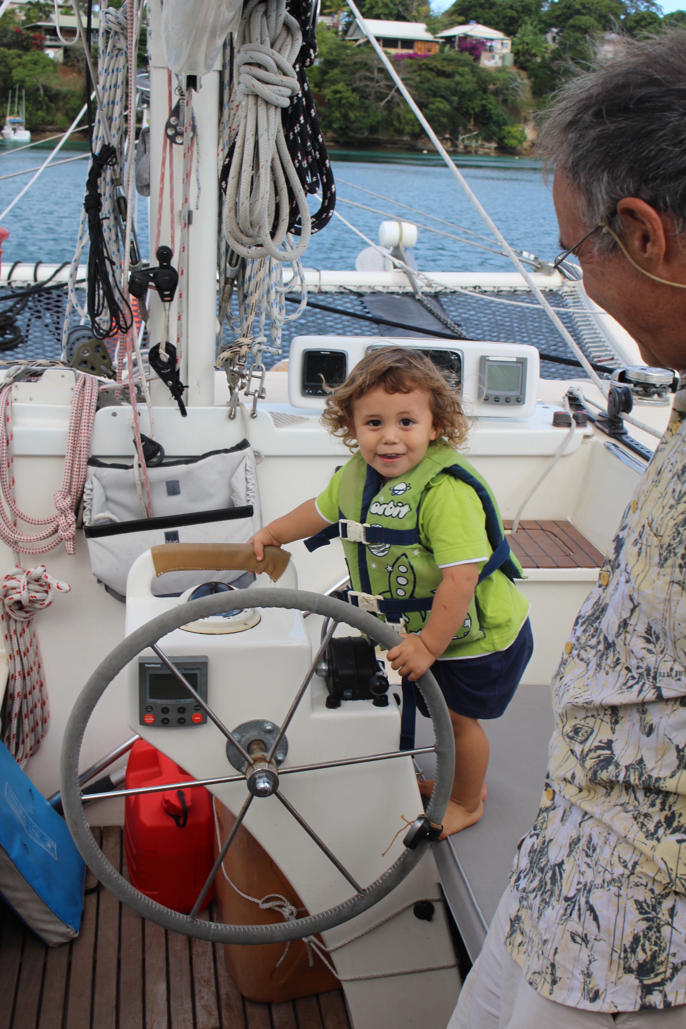 During the week I have cheered up. We’ve had some delicious meals at inexpensive restaurants. We got our laundry done. We bought a cruising guide for the area. We’ve been shopping for fruit and vegetables at the open market. We’ve shopped for other food, although what is available is extremely limited. Two of our fellow BPOers have recently arrived, so we’ve seen some friends. We also had Kjell aboard to see our boat, and he came with his adorable and rambunctious two year old son. Bob played Grandpa for 45 minutes so the rest of us could have a conversation. The two of them hit it off, ran all over the boat and the dinghy, and tired each other out!