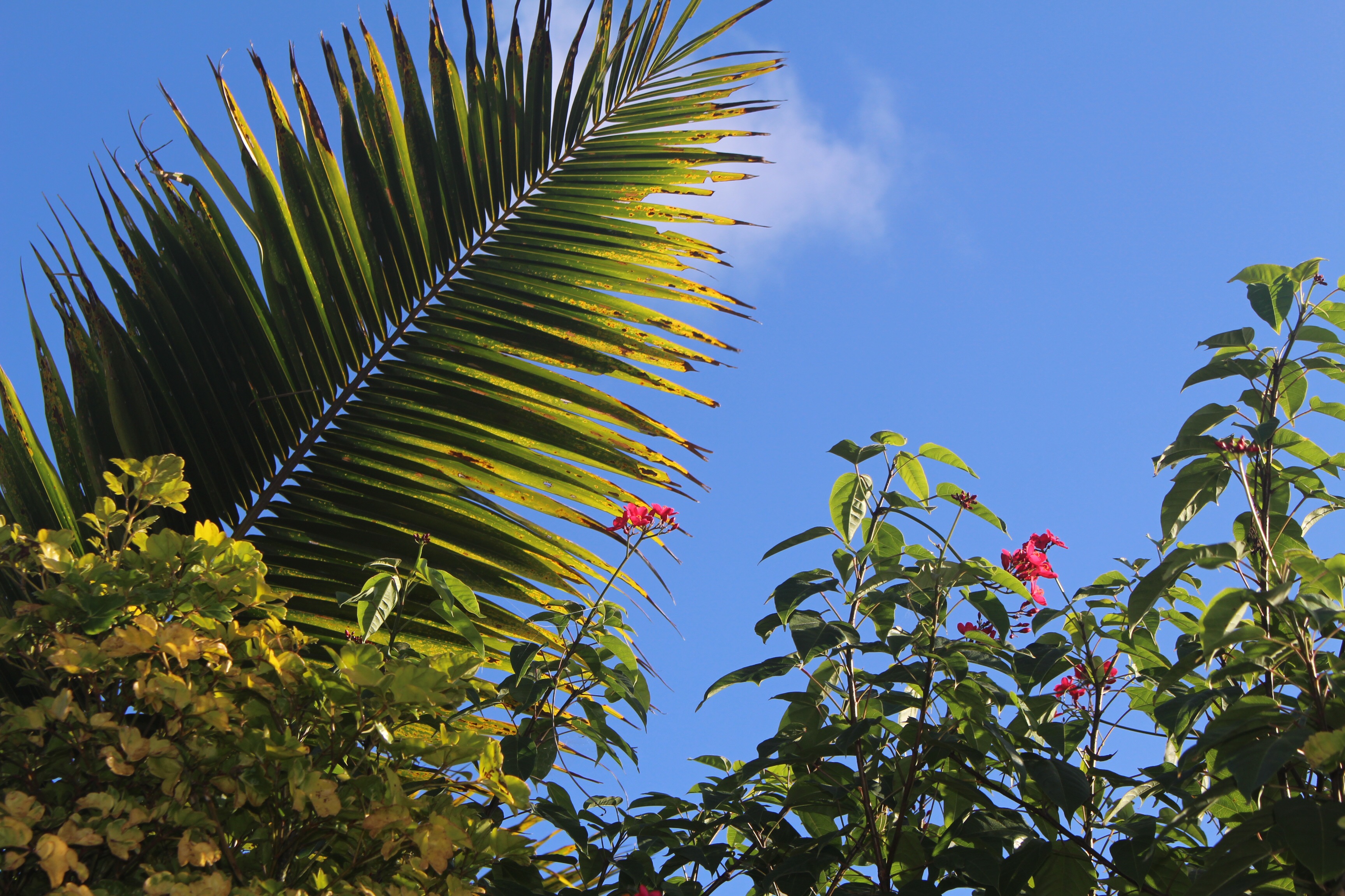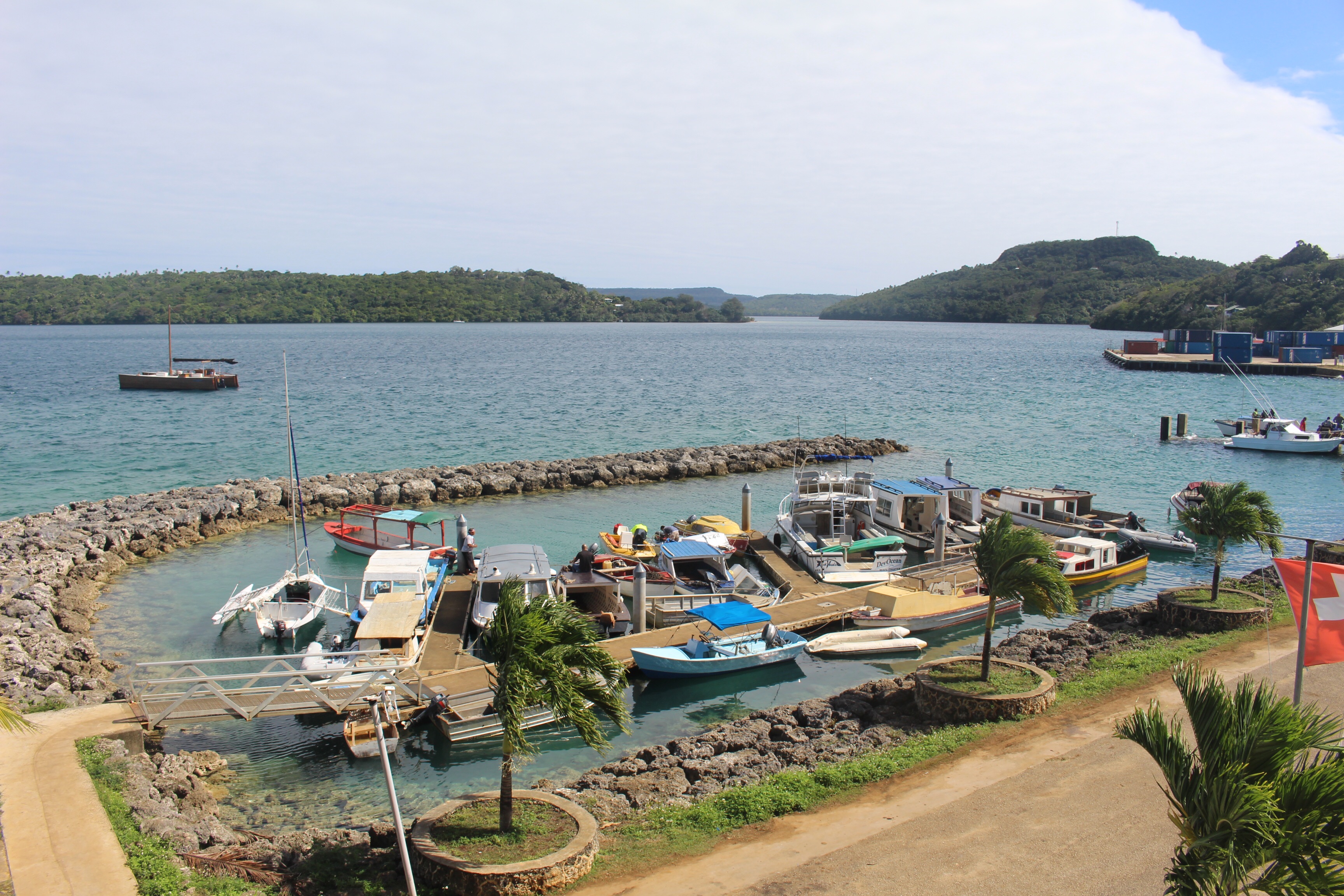 We planned to leave the harbor this morning to do some local cruising, but I slept late, then had to enjoy my presents, and then we went to do a little food shopping. Walking into town from the dinghy dock I noticed an array of shirts for sale, hanging from a tree. It took me a while to find the lady who was selling them, but I did, and I bought one that I think is very nice for the equivalent of $5. I think this set a tone for the day. A few minutes later at the market I bought a very nice woven basket, and I got a little necklace for Hallie. After buying lots of fruits and veggies, Bob went off to find a bakery with the idea of getting me a cake. I told him I’d rather have something akin to cinnamon buns, and to my surprise he returned with some, plus some made with coconut. And then we decided to have lunch…