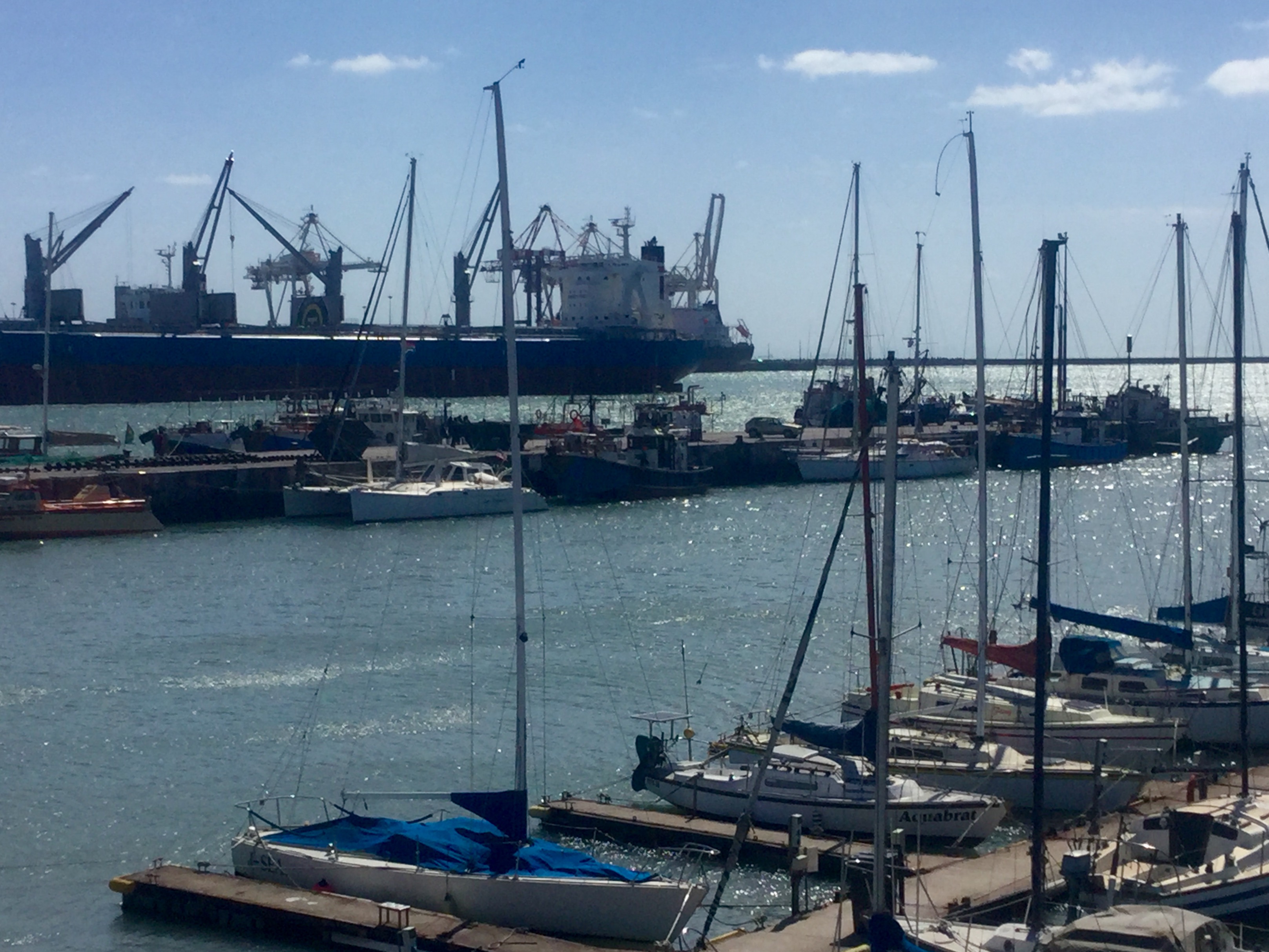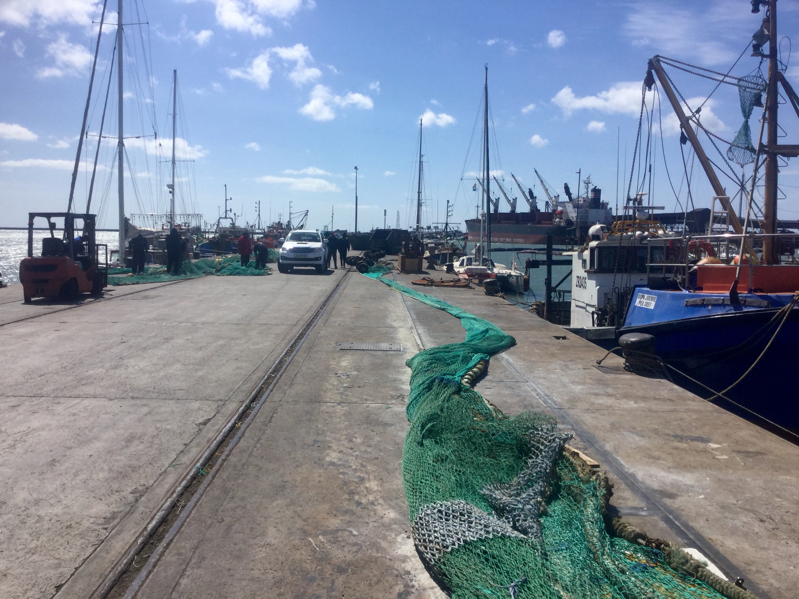 We’ve been in Port Elizabeth for a week. Aside from a day of exploring, and some tasks on the boat, and of course hot showers and good meals at the yacht club, our focus has mostly been on the weather. It looked like we had a window for Cape Town, but that window closed as it got closer. We remain tied to the fisheries pier. We are lucky, we are told, that the fleet is out, or there would be no space for us. I think the successful fishing boats are starting to come in, though. A big one came in last night, and the pier came alive with workers shouting and trucks and horns and a general cacophony. This morning there is a smaller boat in, unloading big sharks.