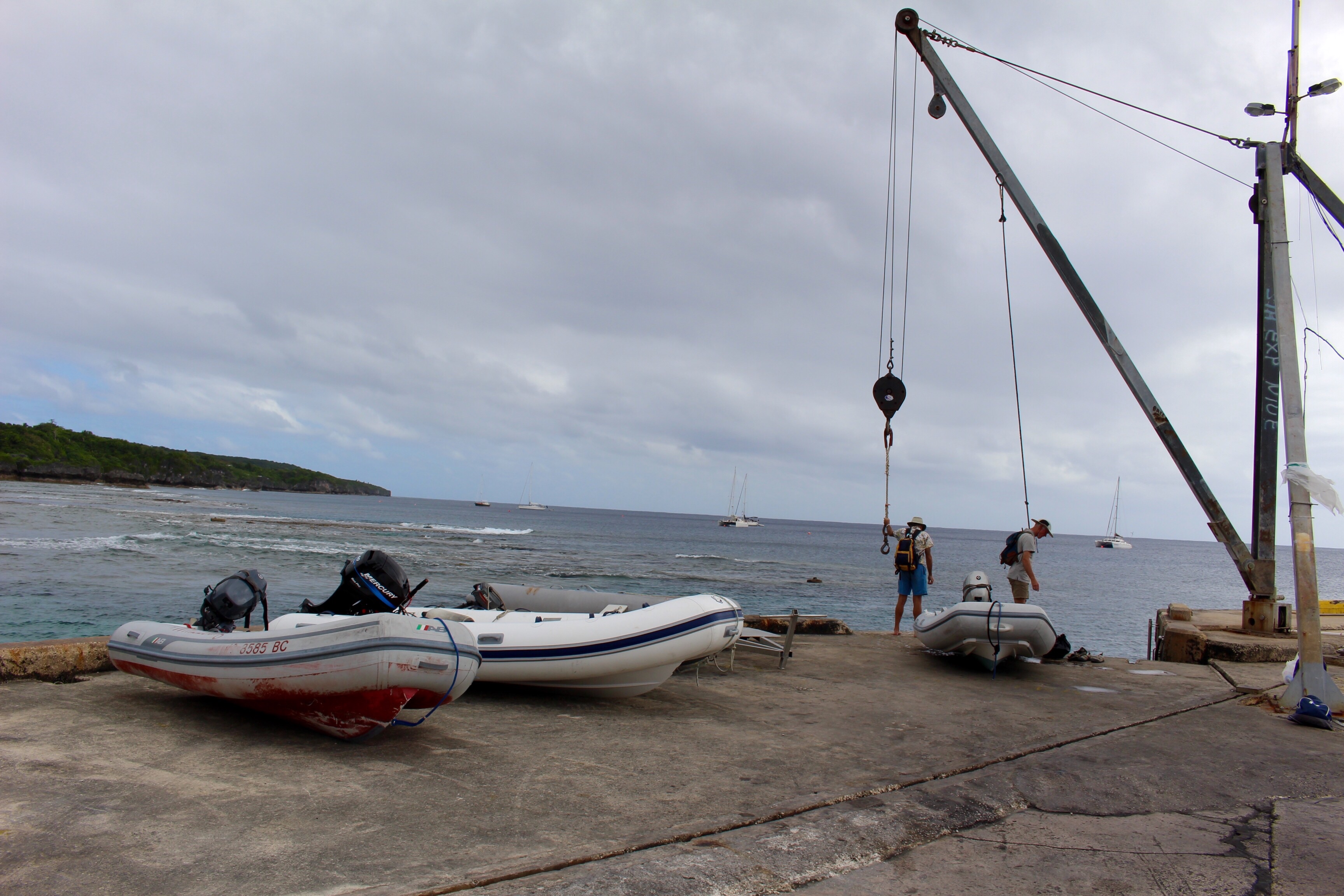 It was a relief on arrival to find clearly marked moorings, and discover that the bay provided surprisingly good shelter from the big seas. Customs, immigration, quarantine and health officials met me on the pier, and I filled out the forms in the back of their van. The pier is the only place to get ashore, and it is not well protected. You take your dinghy (or fishing boat) alongside and lift it out of the water with an electric hoist, and park it on the concrete.
