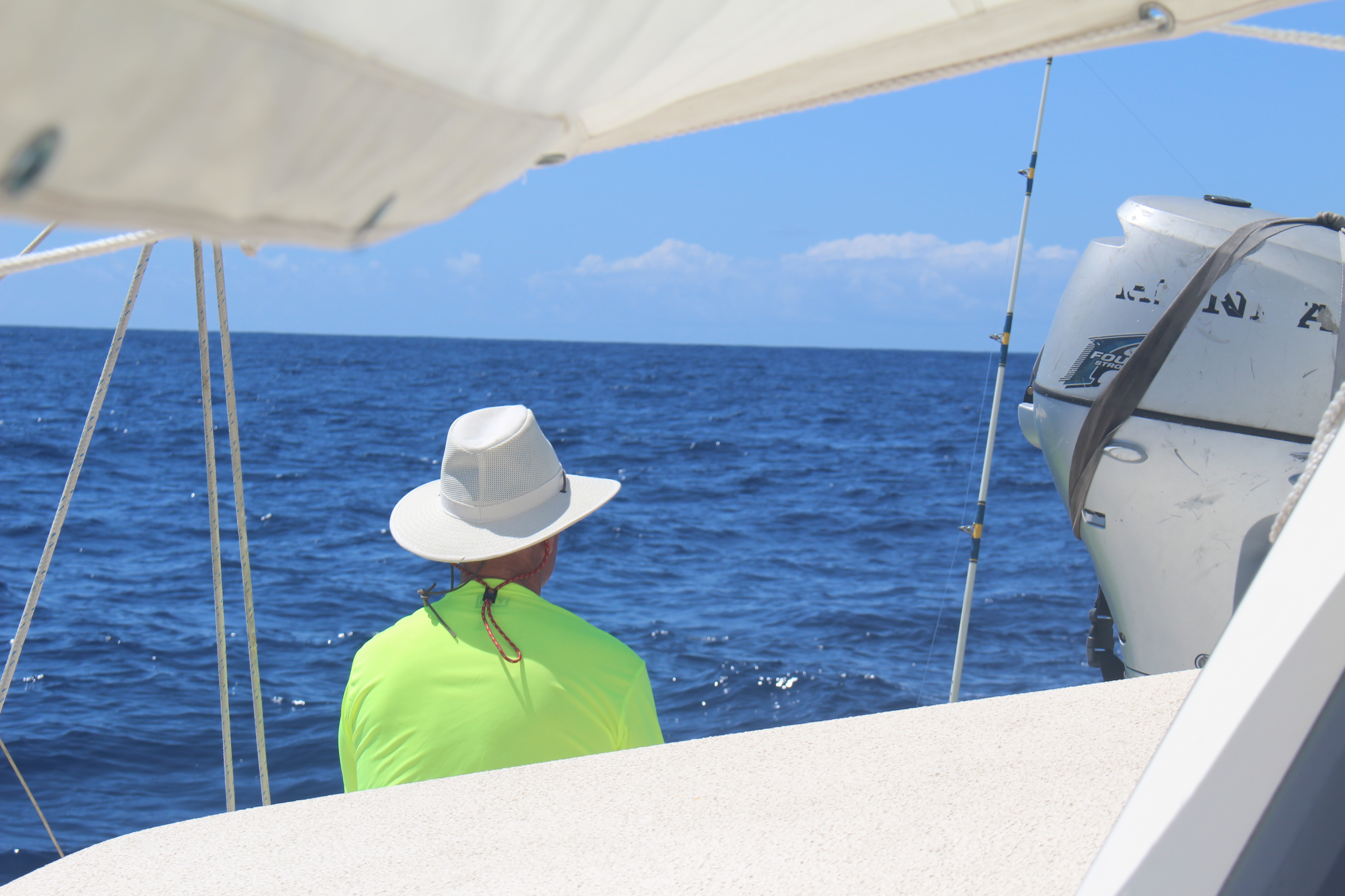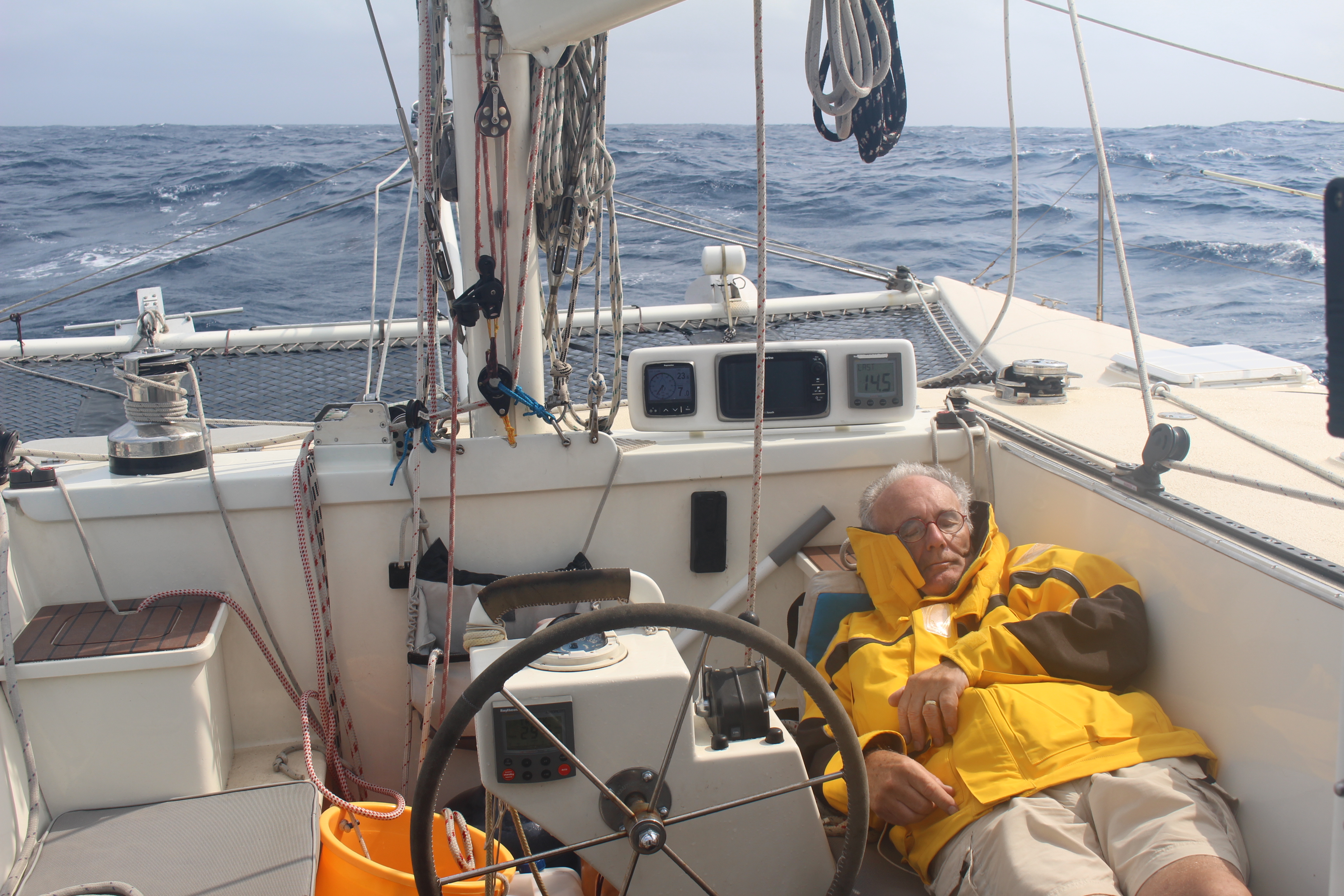What a difference a few hours can make! The wind has gone to near zero, and we’re motoring in relatively calm seas. Bright sunny day. French toast for breakfast. We’ve all taken showers and had naps. Spirits are high, even though I hope we get wind again soon. We also took the opportunity to straighten out the twisted tangle of a spinnaker that didn’t cooperate when we tried to bring it down. Only negative is that despite trying dozens of times, we can’t connect to Sailmail (the way we send emails via radio when at sea). So we aren’t connecting with our families, and we aren’t receiving the updated weather forecast. Will keep trying…